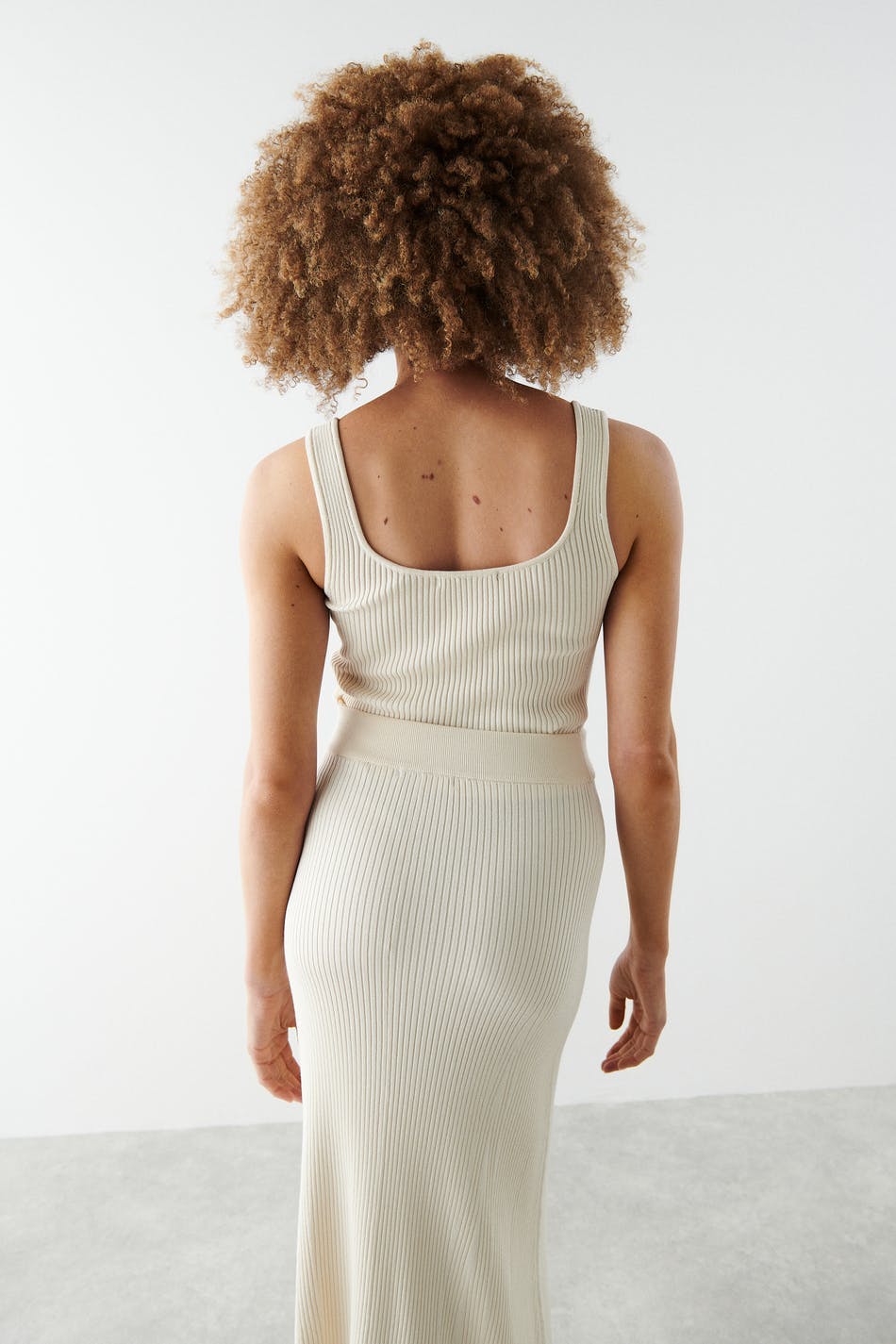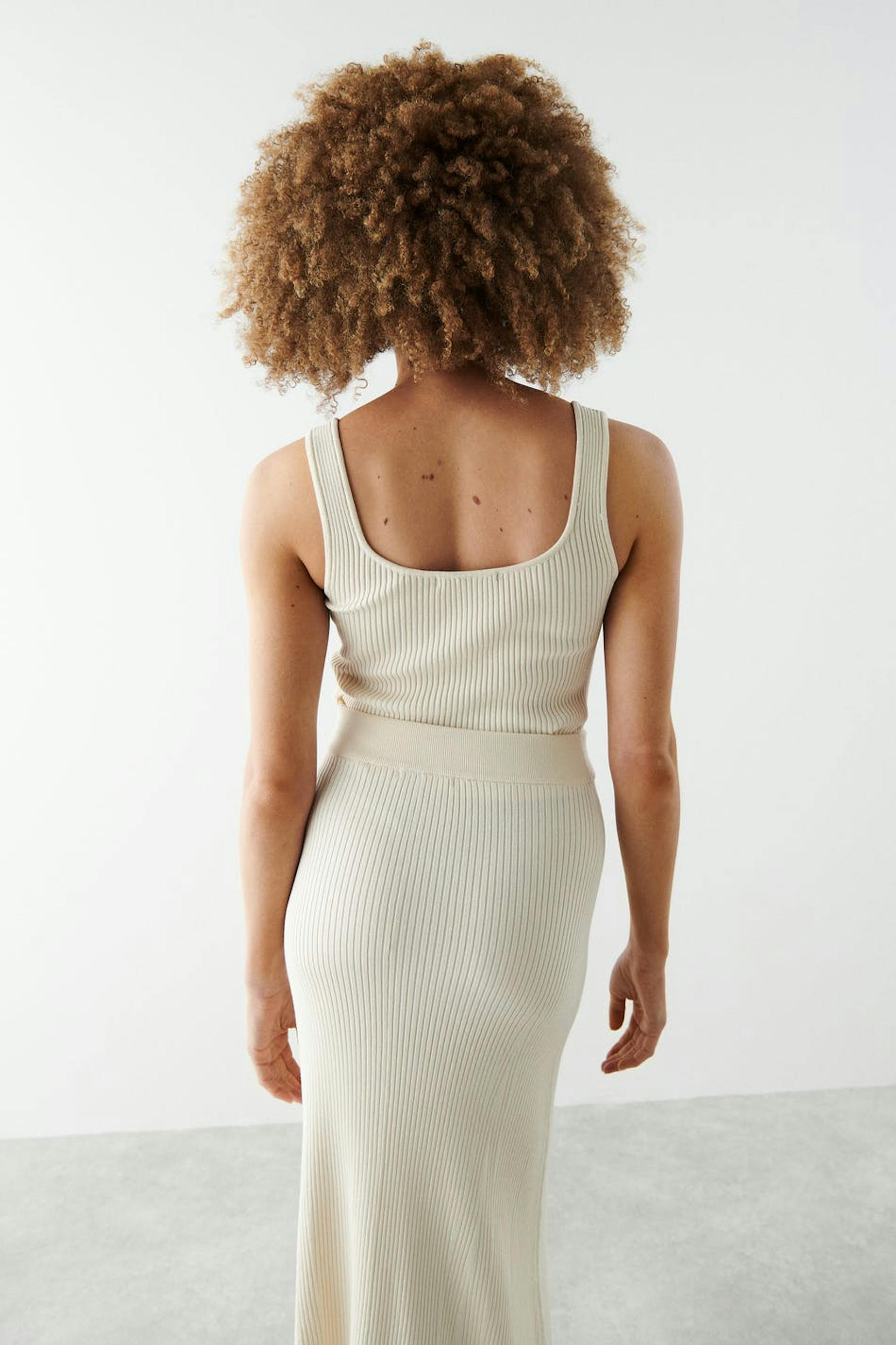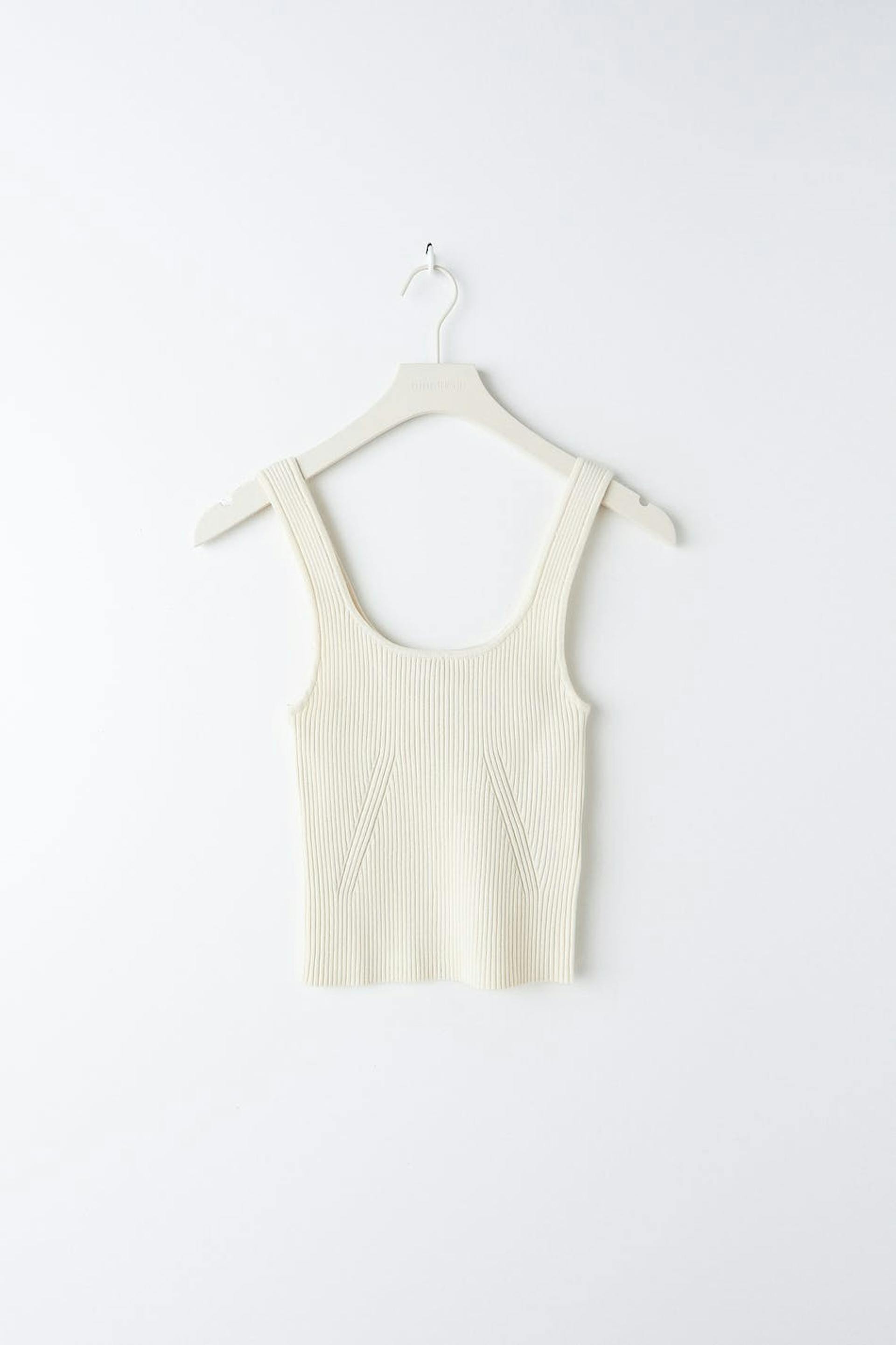 Knitted tank in viscose by EcoVero™ with a fitted fit. The tank is white and has a square neckline.