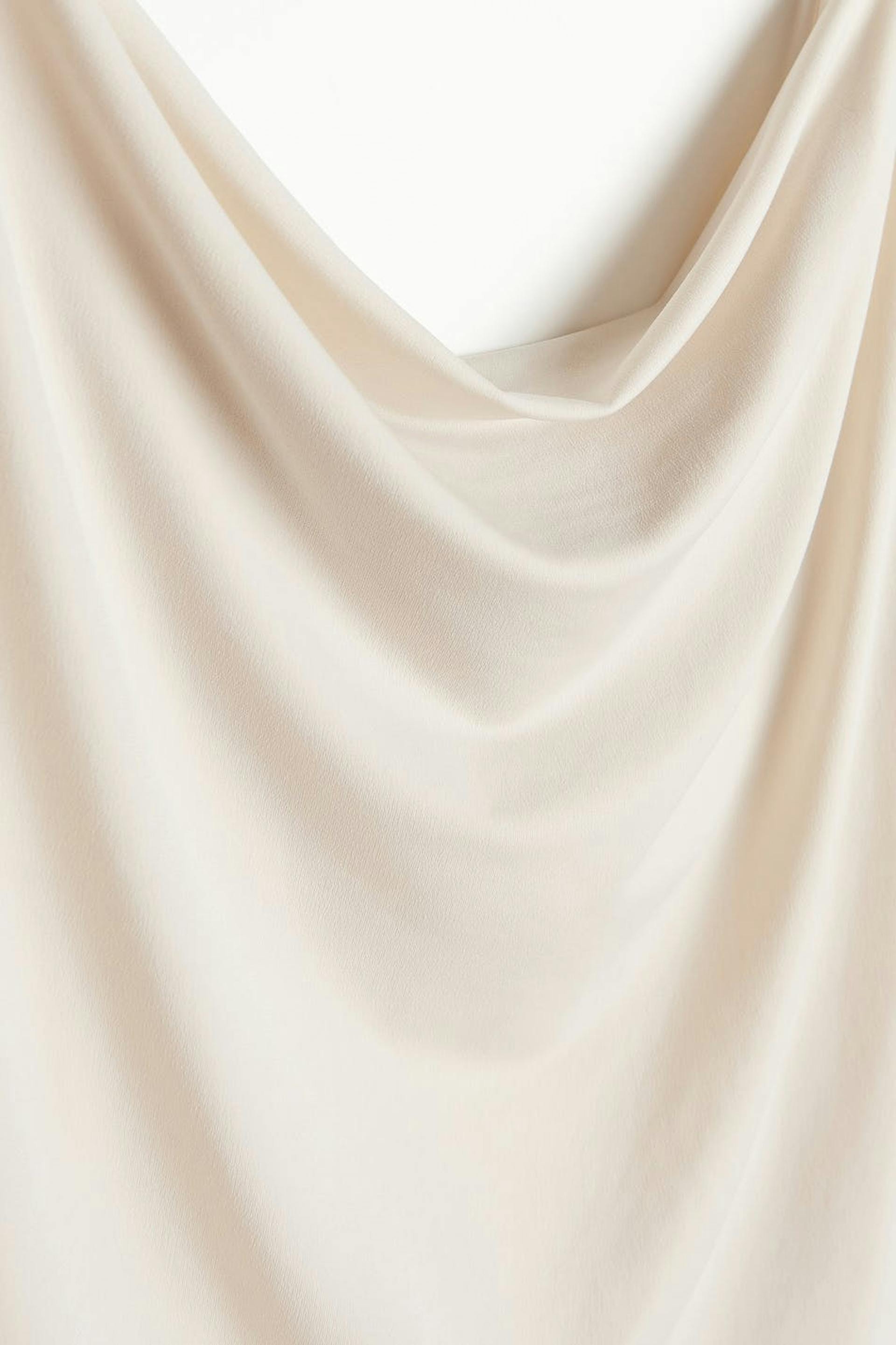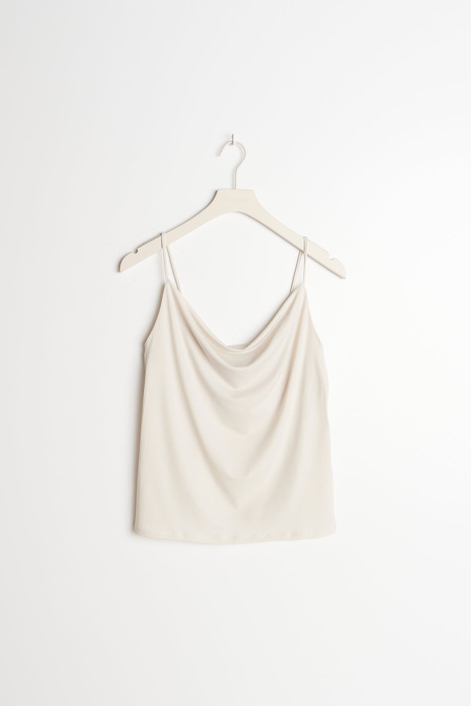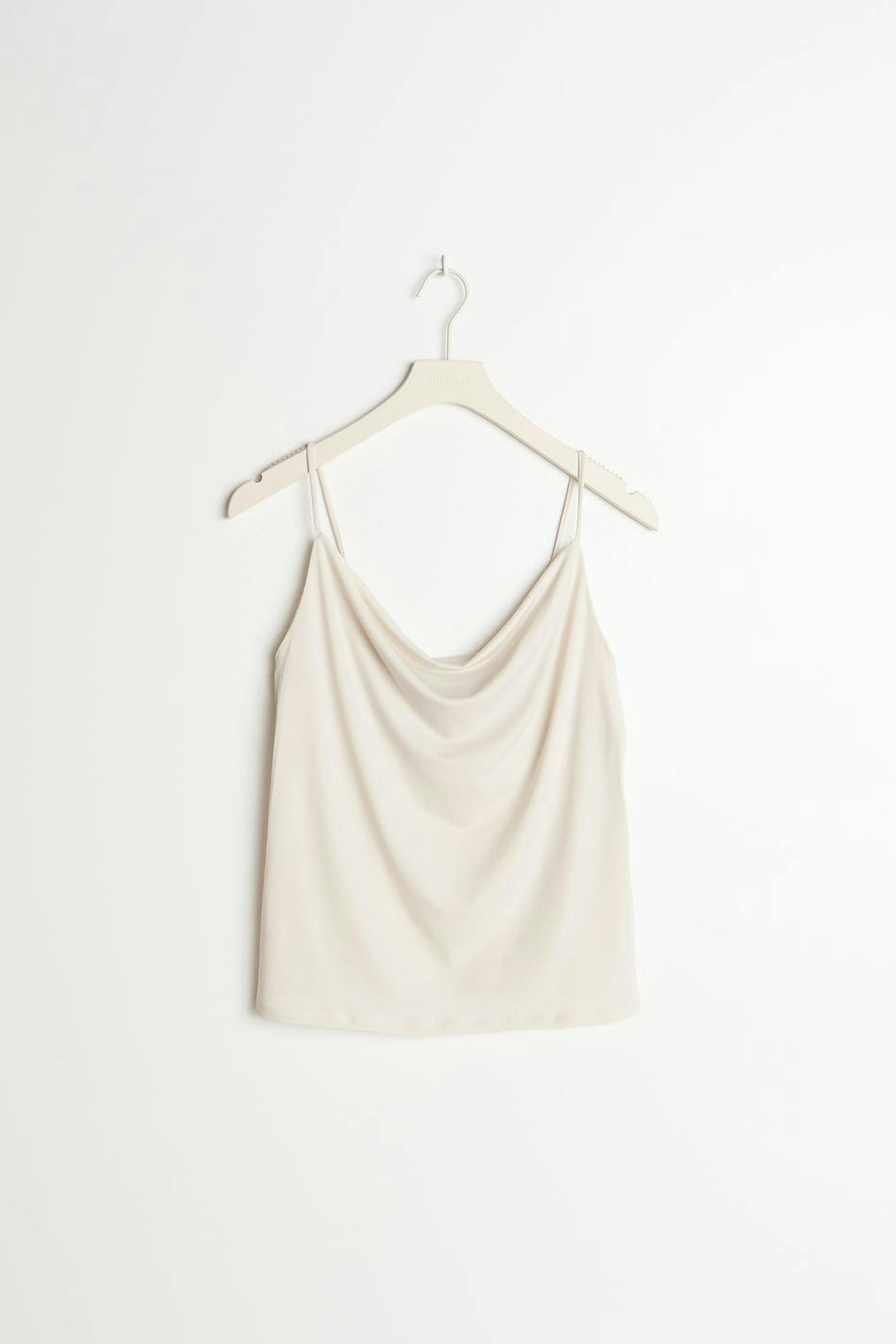 Tank with draped neckline. The tank is beige and has a normal fit. It is made of jersey and has thin shoulder straps.