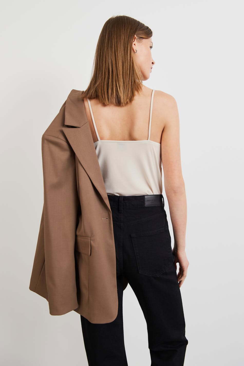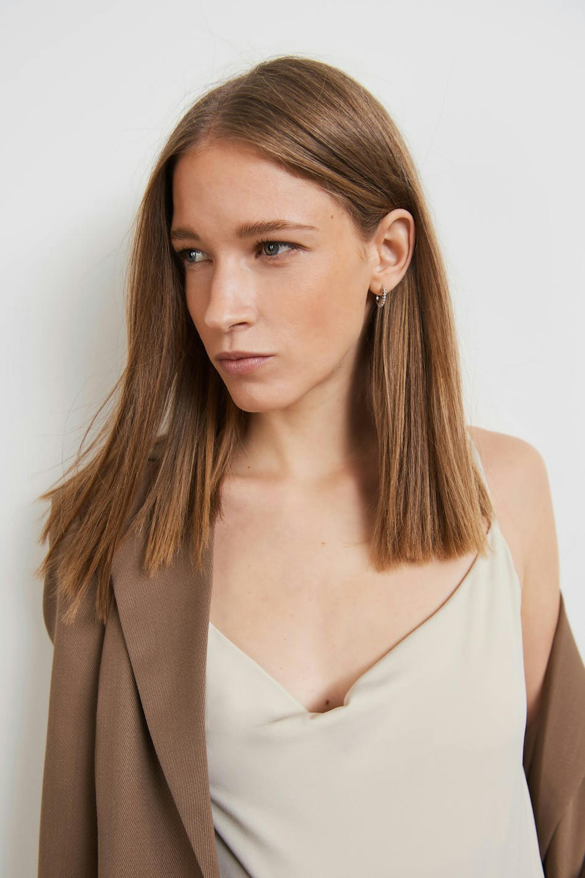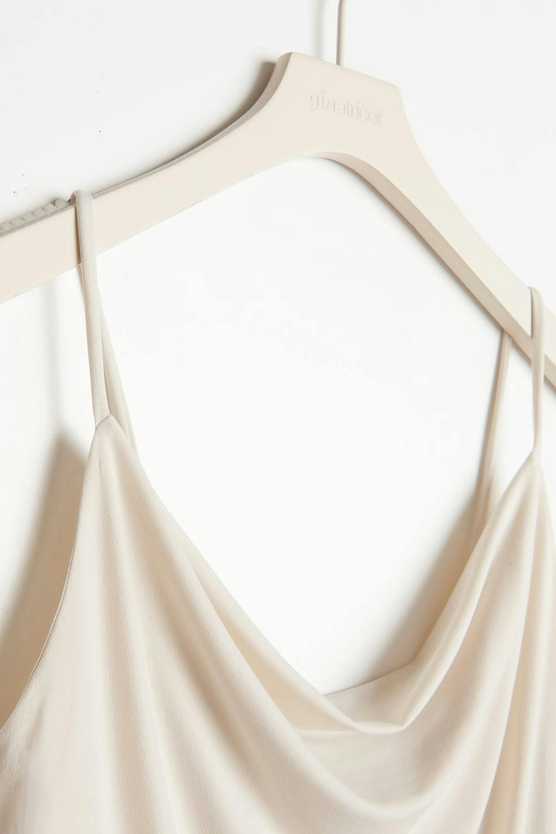 Tank with draped neckline. The tank is beige and has a normal fit. It is made of jersey and has thin shoulder straps.
