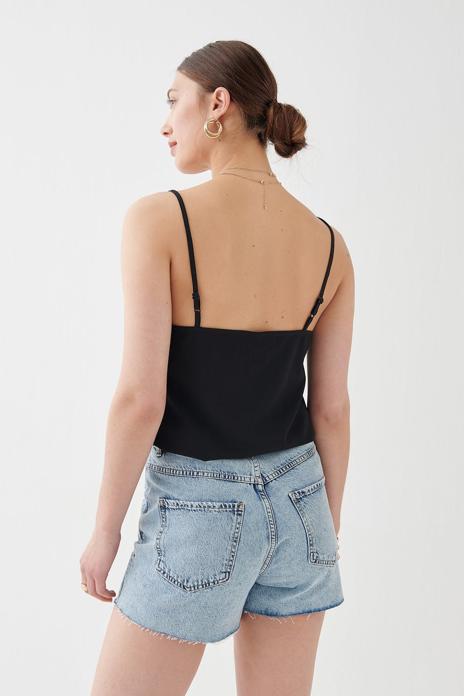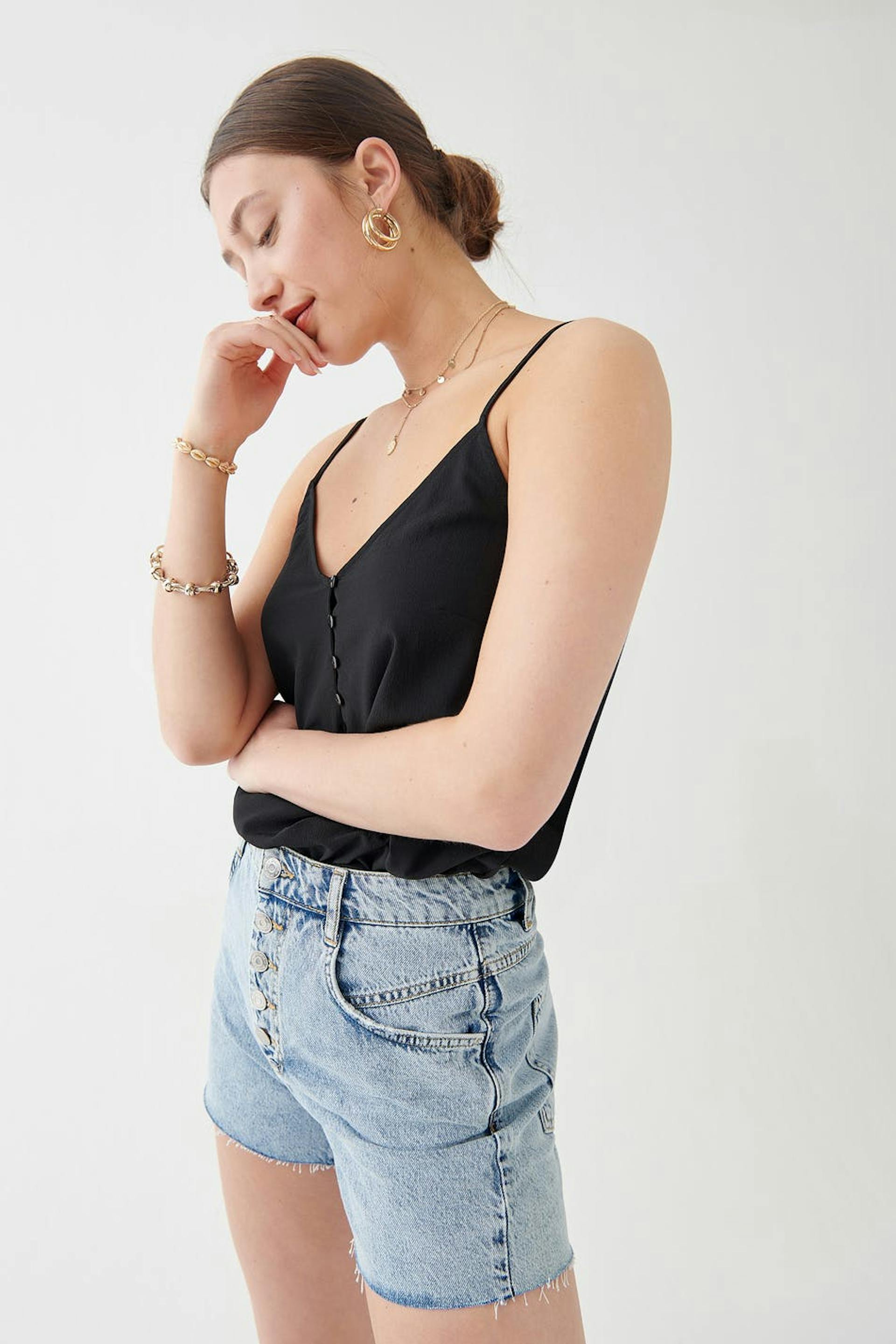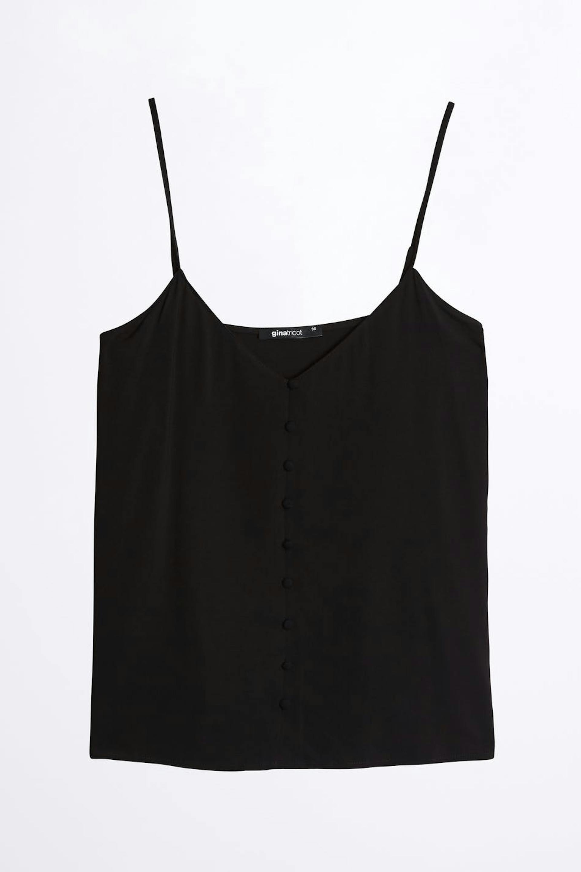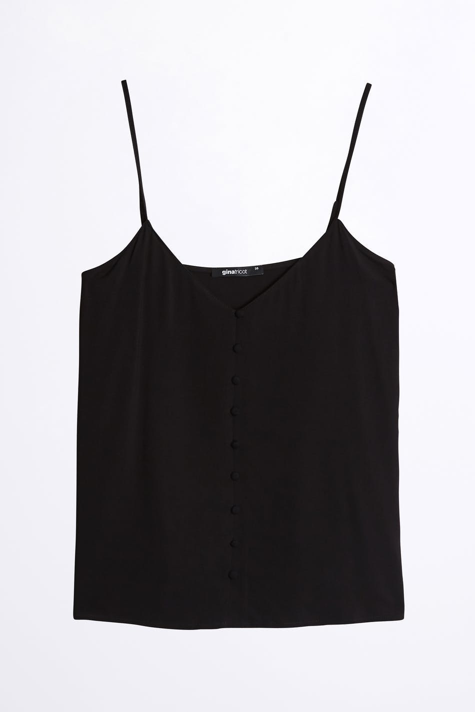 Tank with a regular fit. The tank is black and has thin shoulder straps. It has fabric covered buttons at the front.