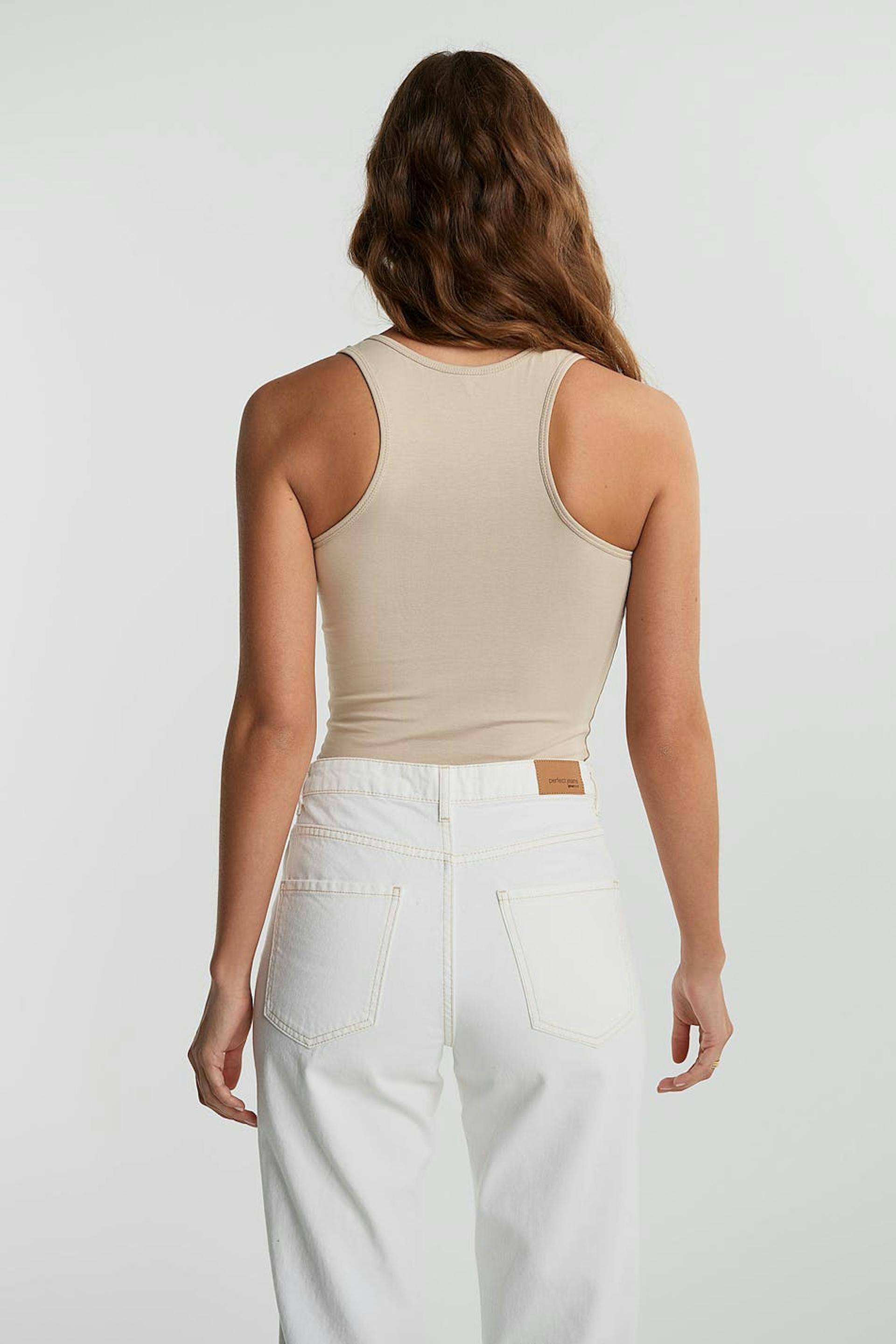 Longer tank with a fitted fit. The tank is beige. It is made of jersey.
