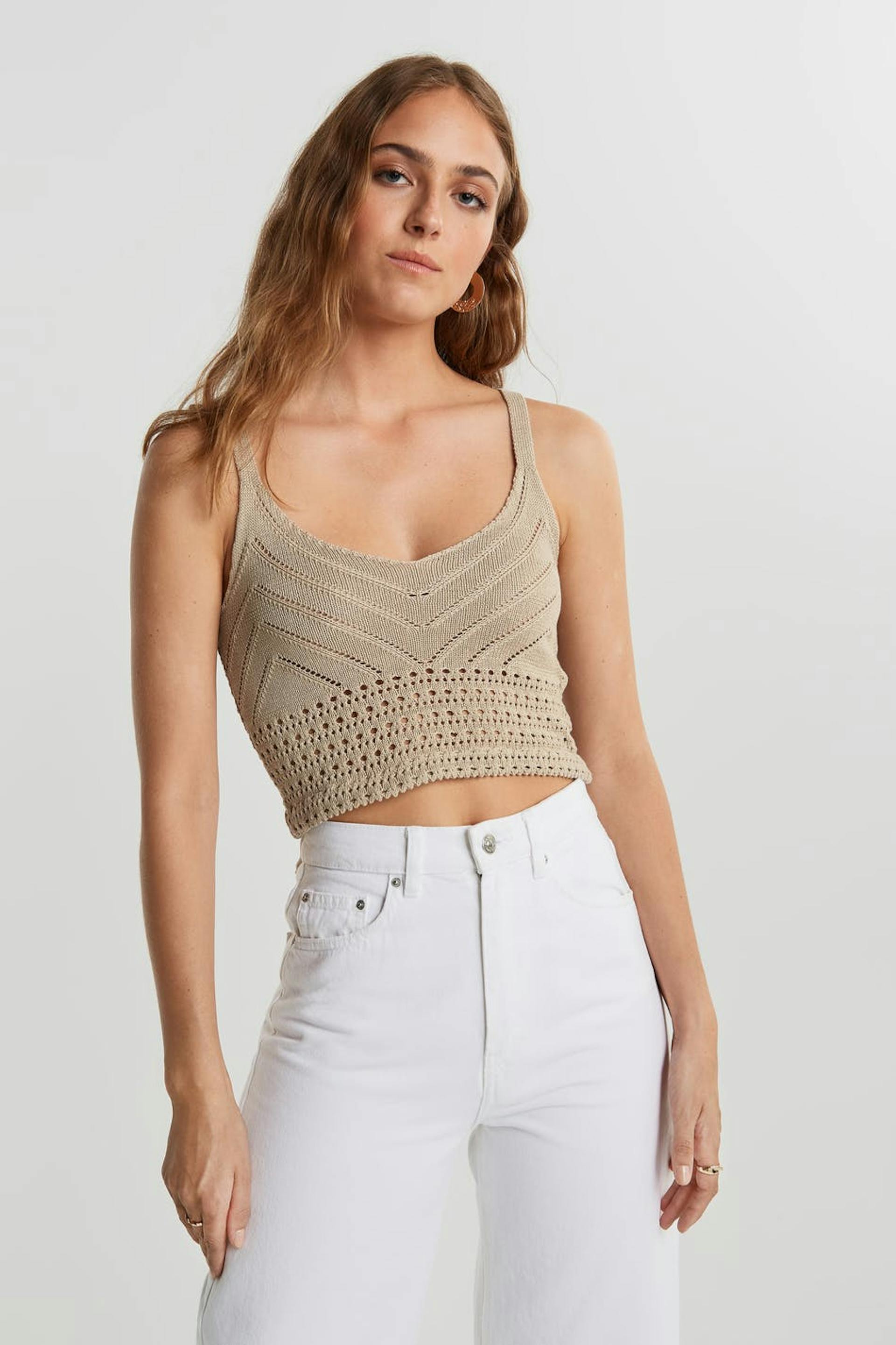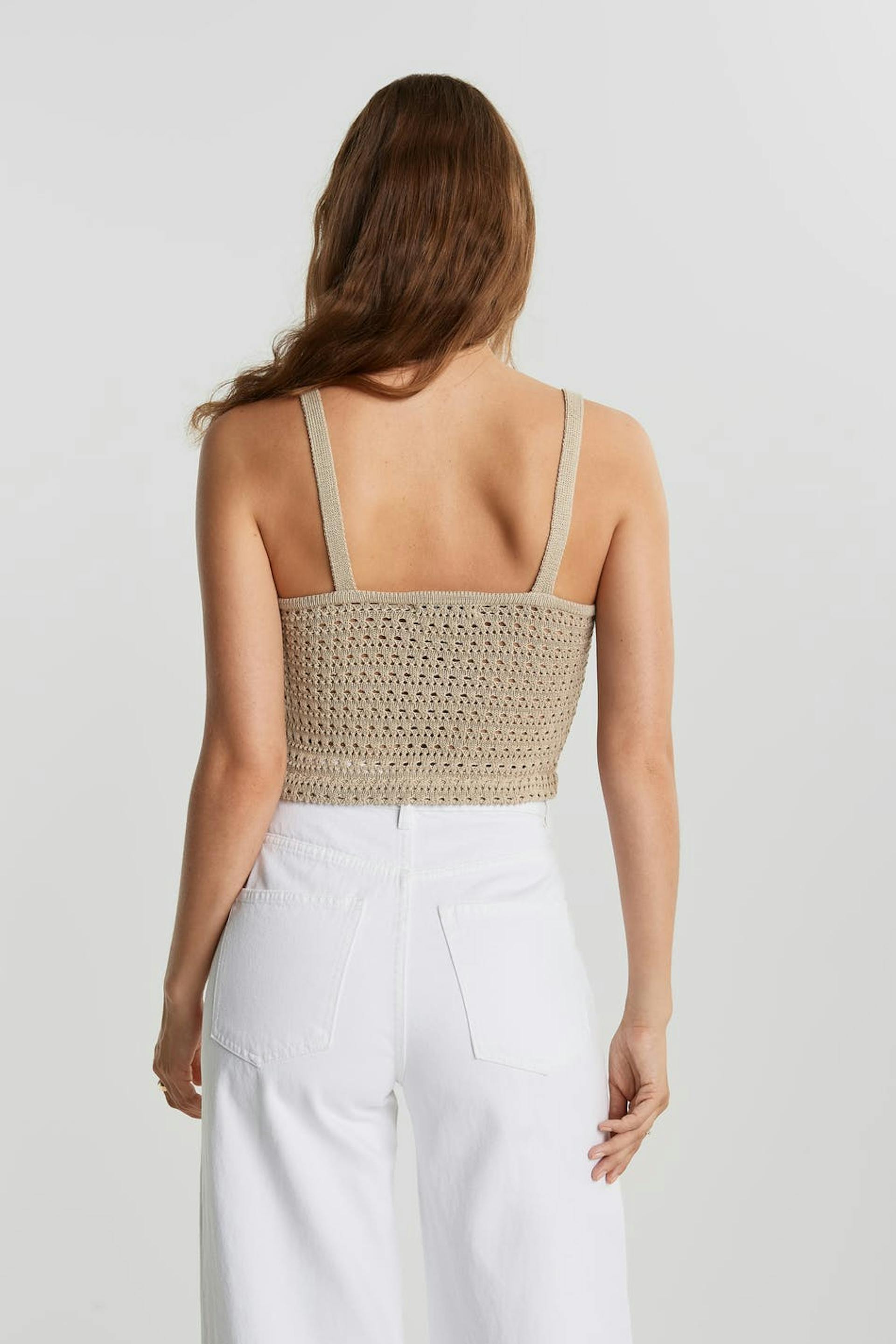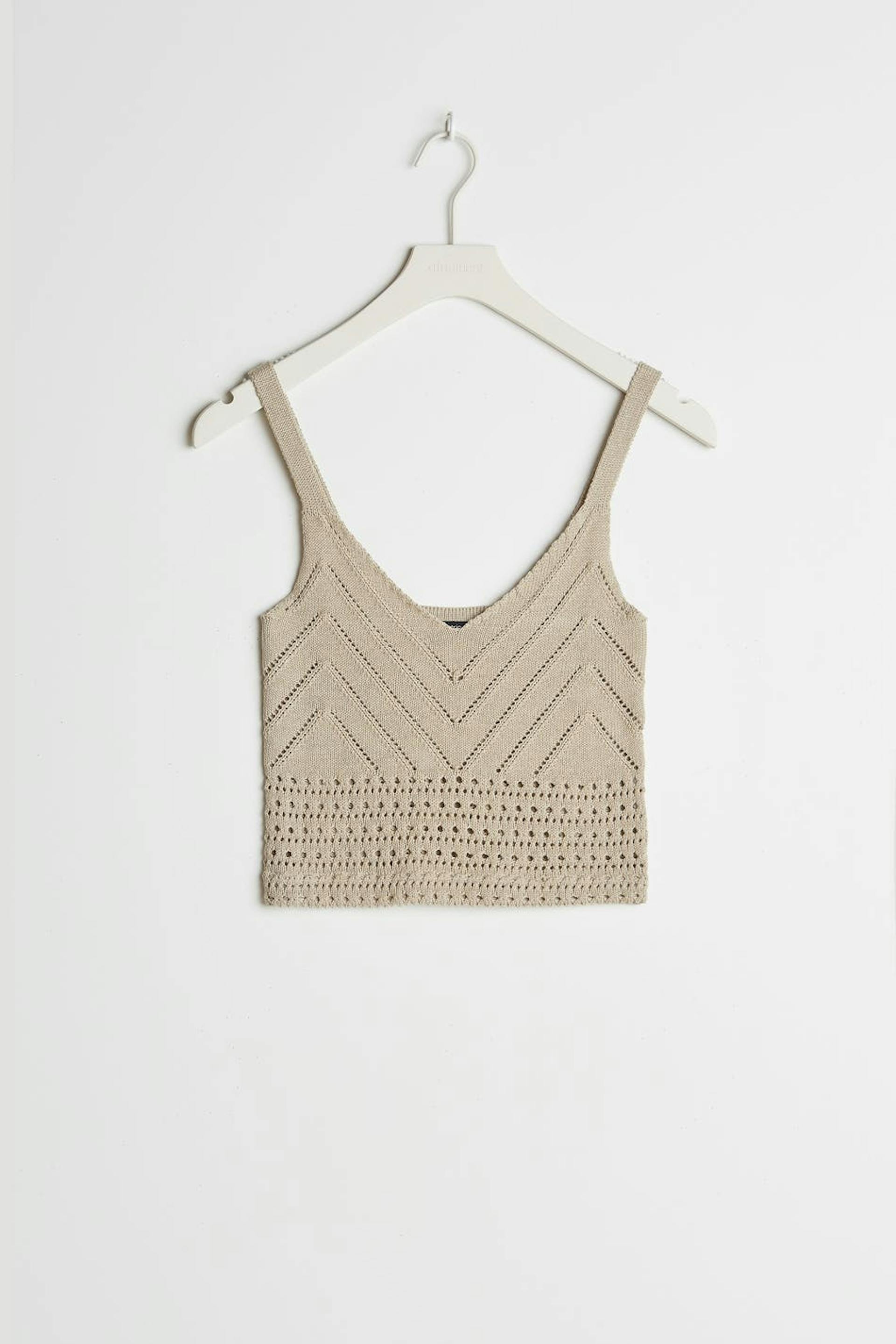 Crocheted tank. The tank is beige, short and sleeveless.