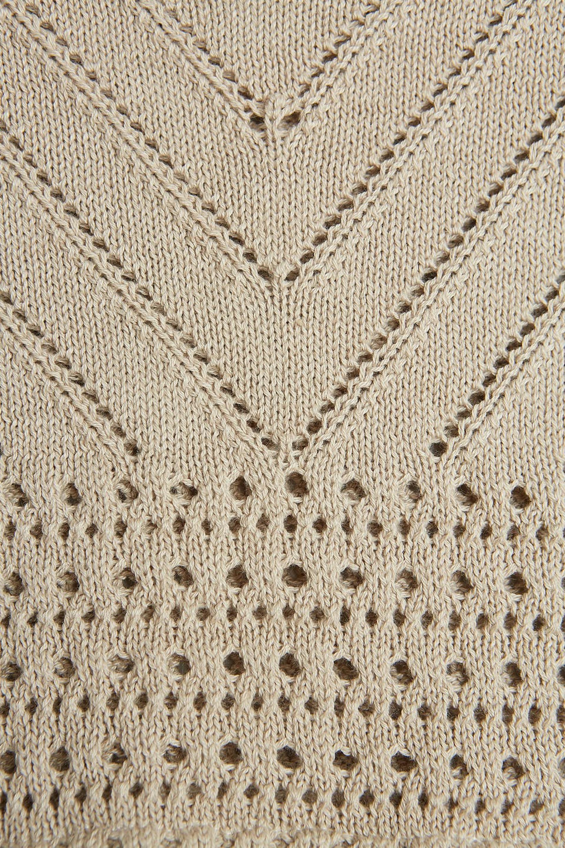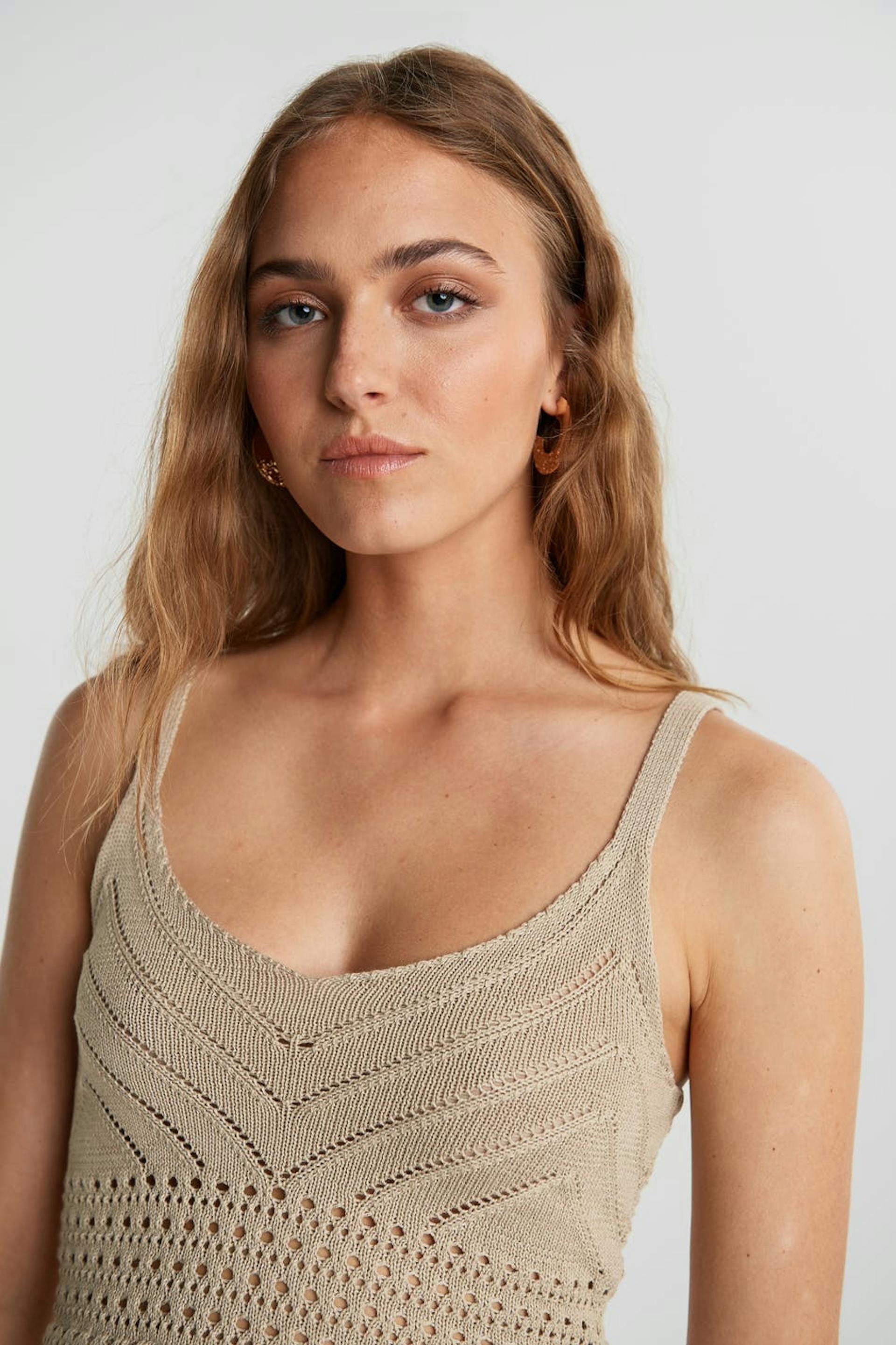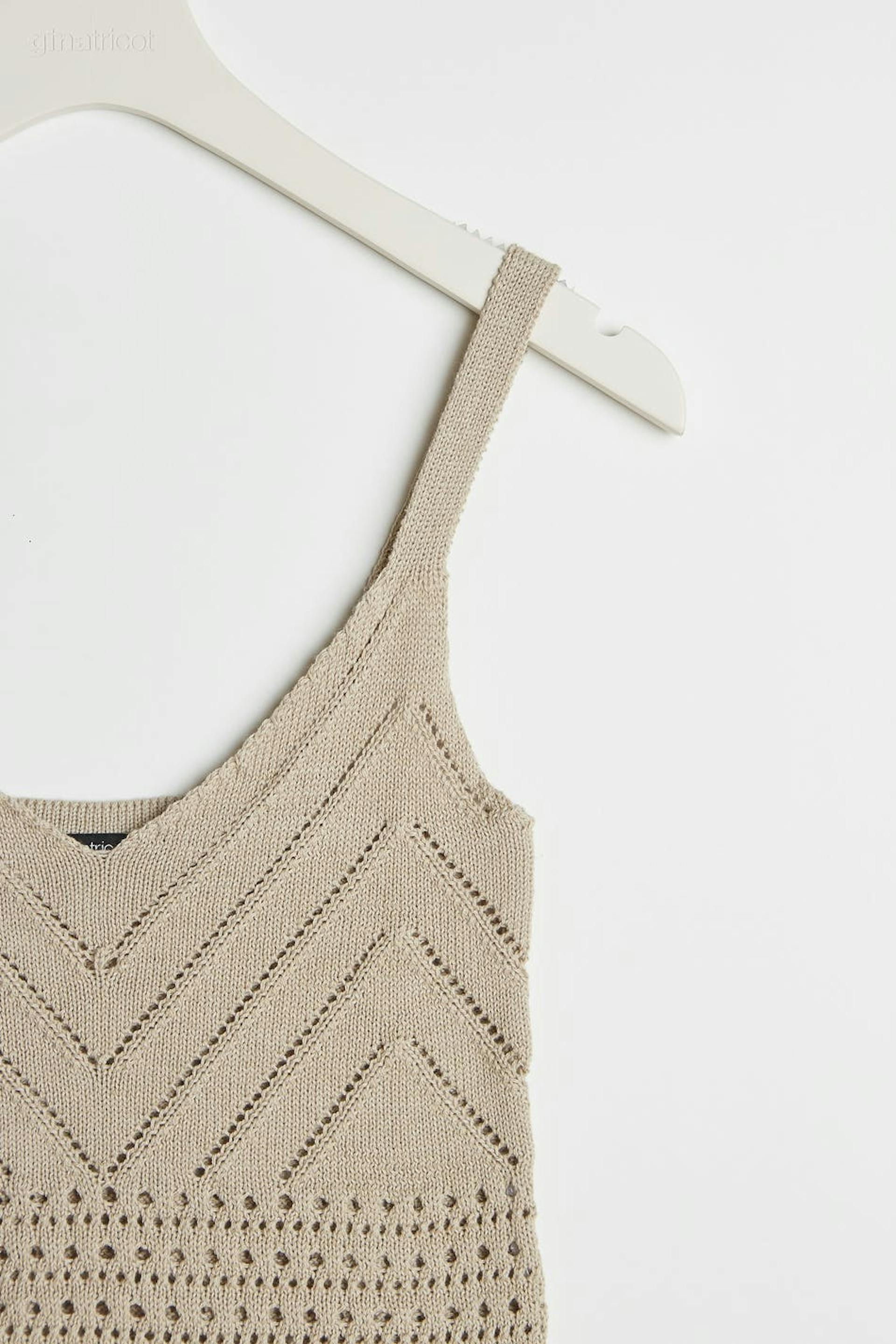 Crocheted tank. The tank is beige, short and sleeveless.