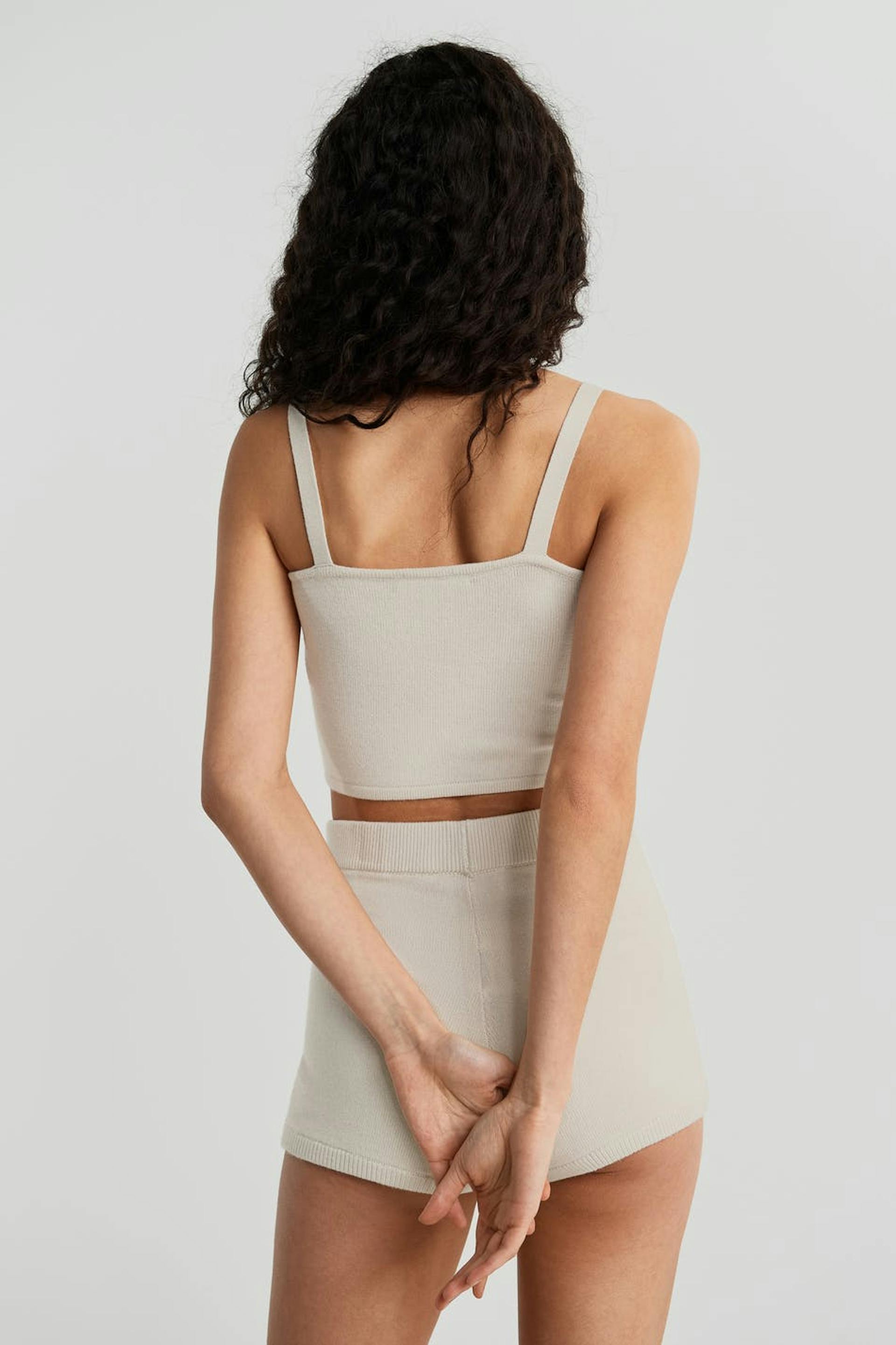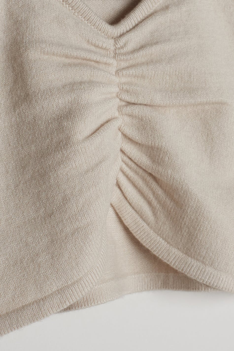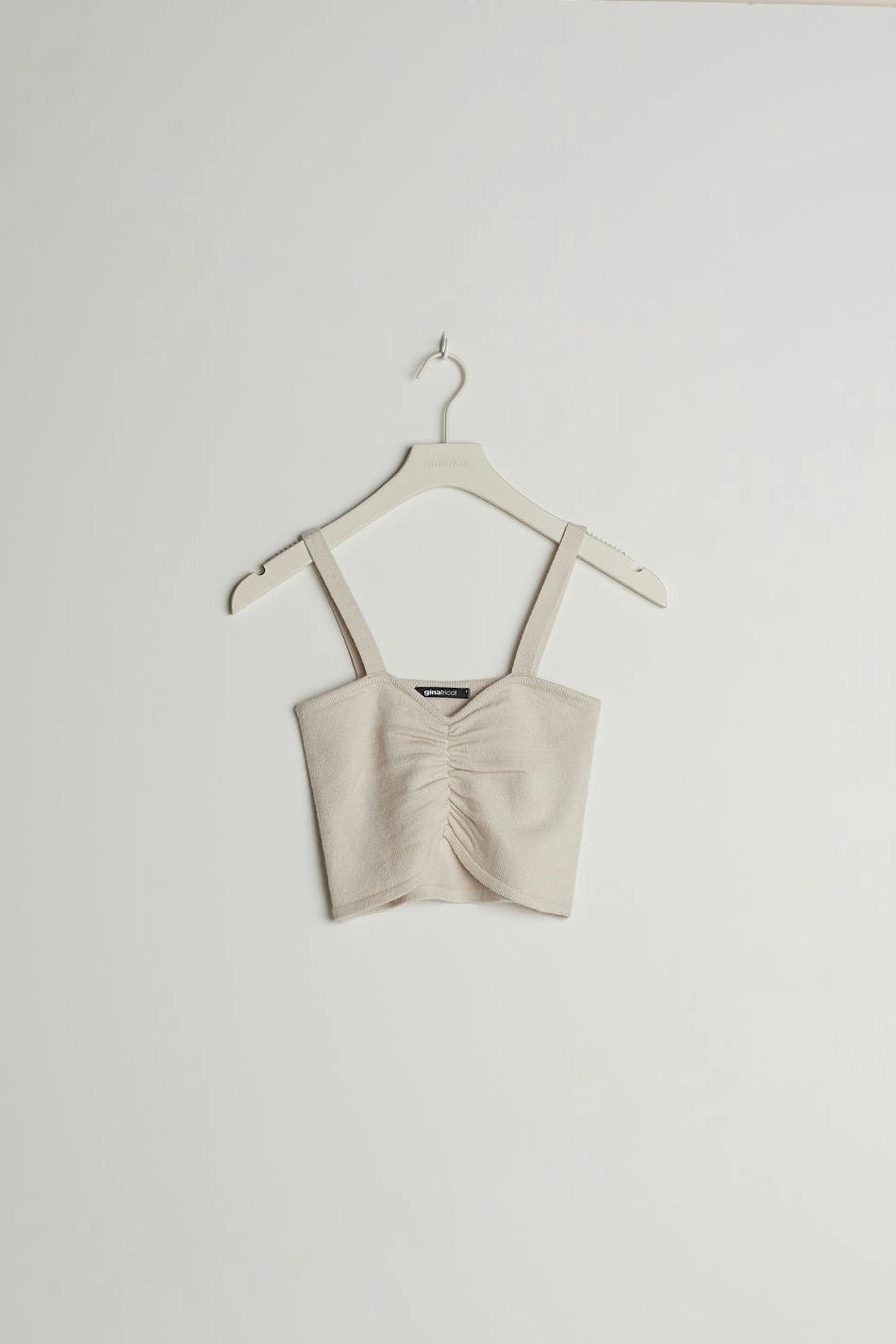 Cropped top with a knitted material. The top is beige and cropped and has a gathered detail down the front. It has knitted shoulder straps.