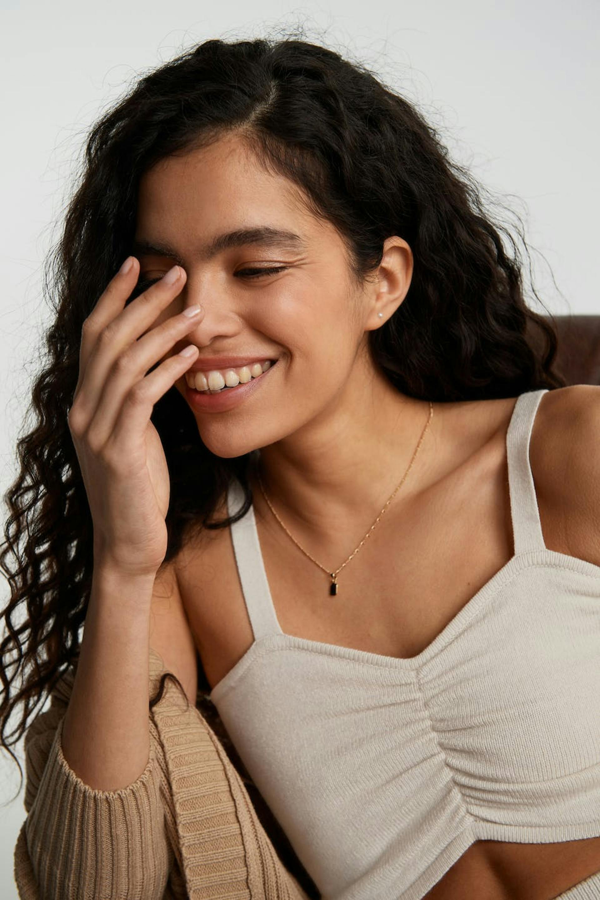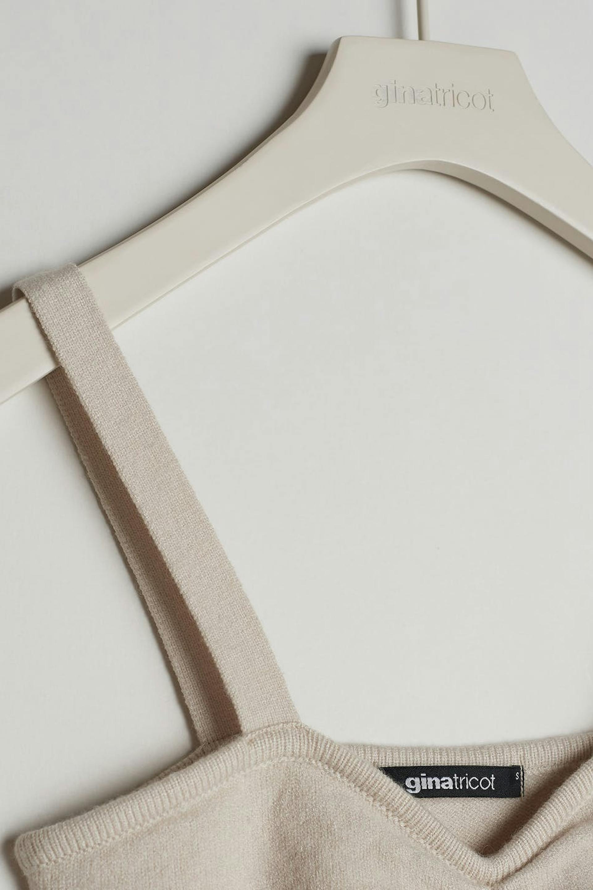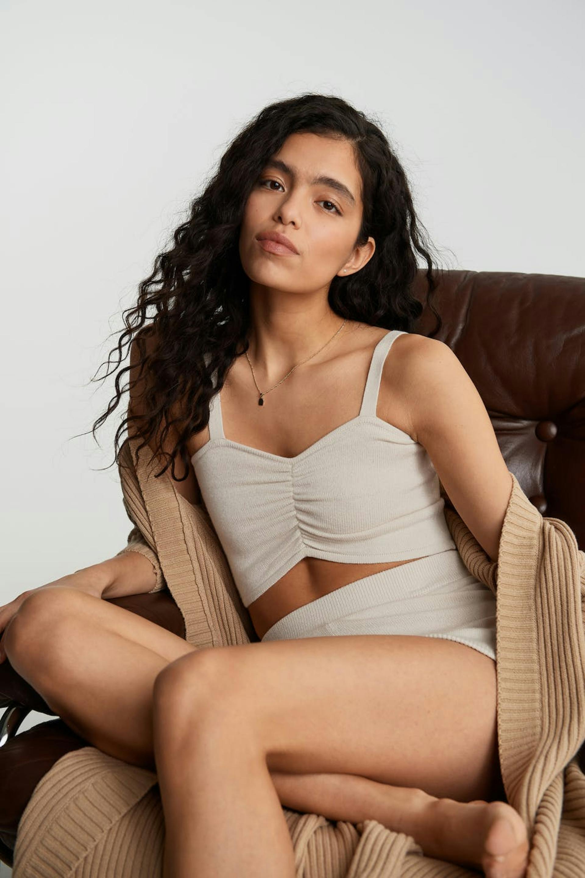 Cropped top with a knitted material. The top is beige and cropped and has a gathered detail down the front. It has knitted shoulder straps.