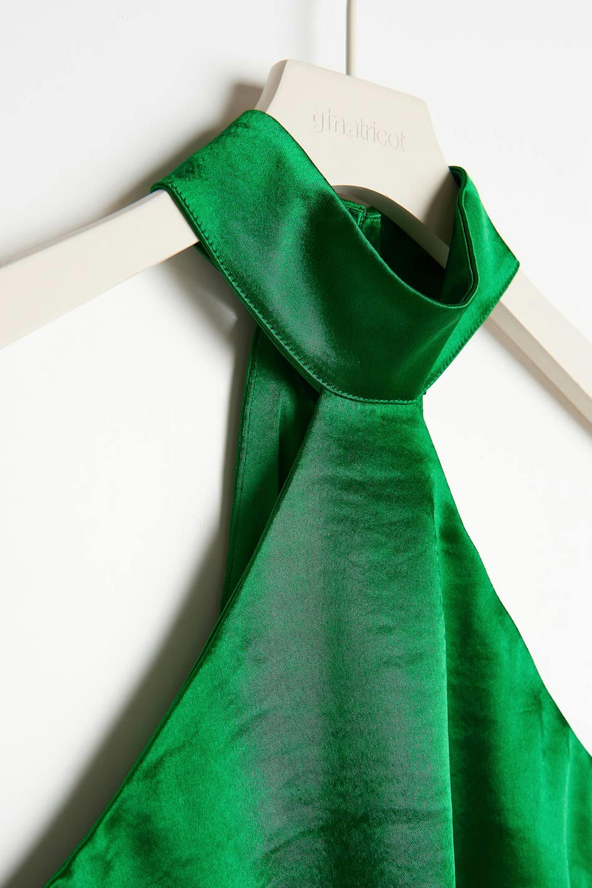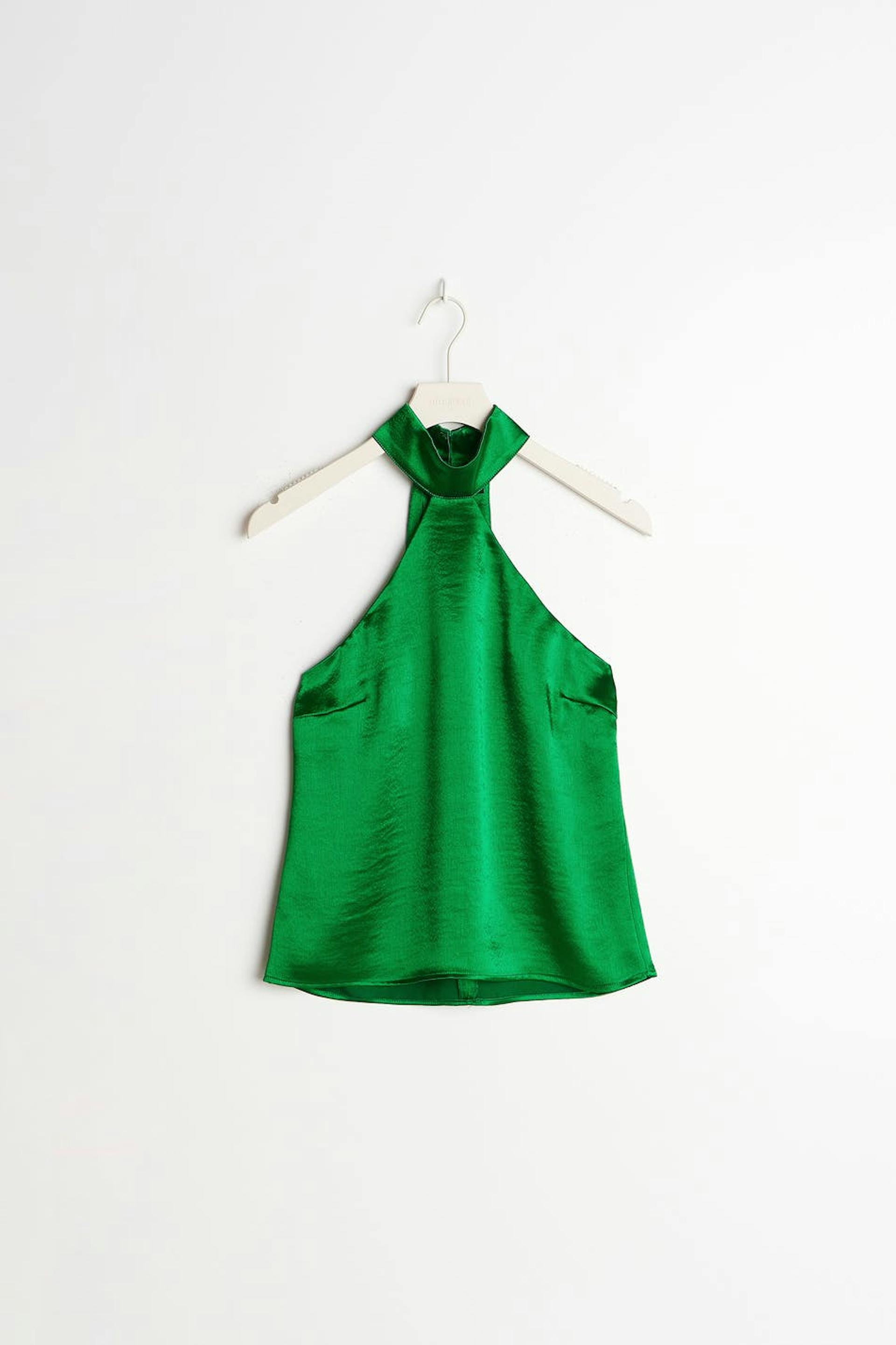 Satin top with choker. The top is perfect for the party, green and sleeveless. It has a loose-fitting style and a button placket at neck with opening.