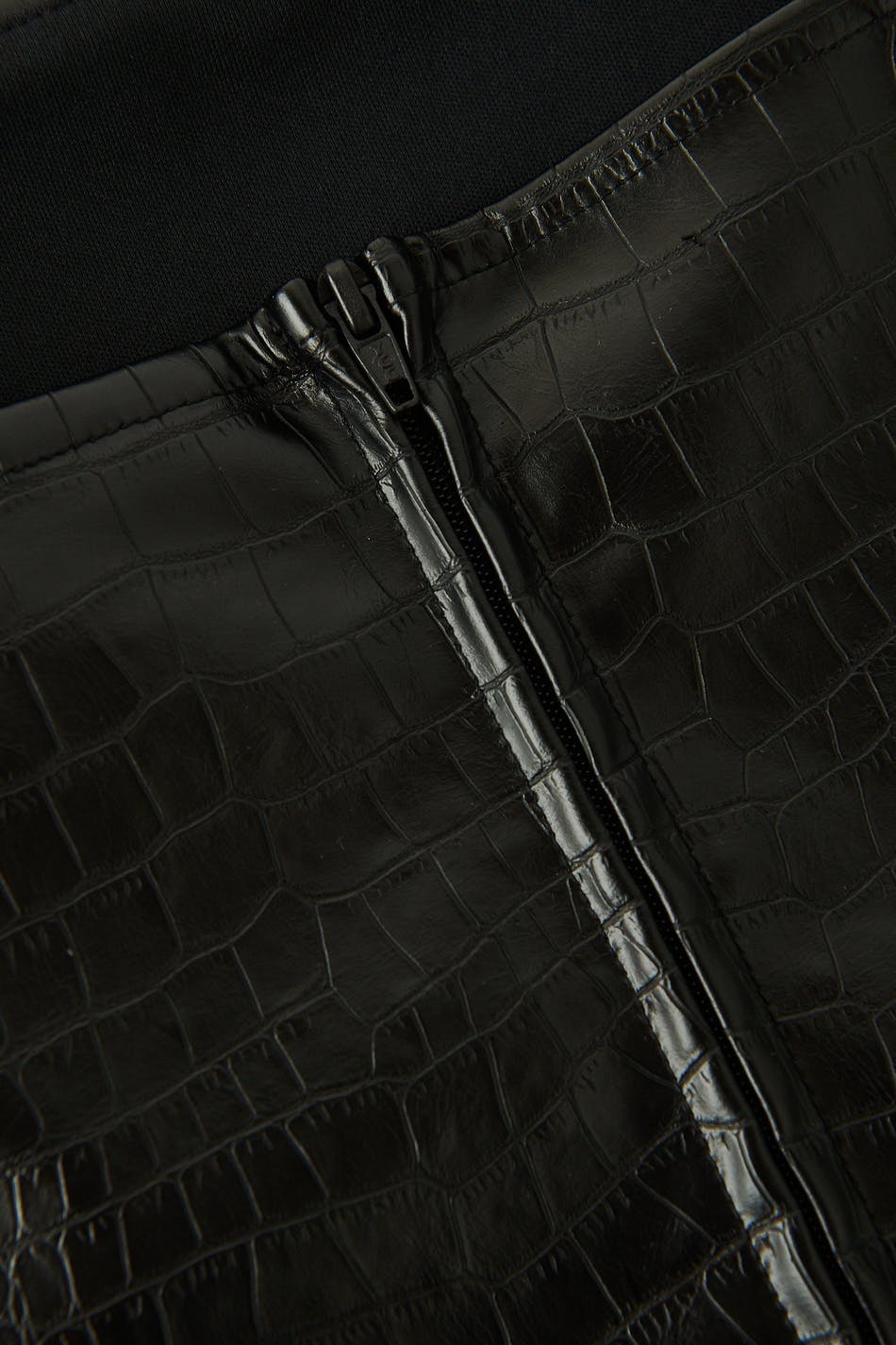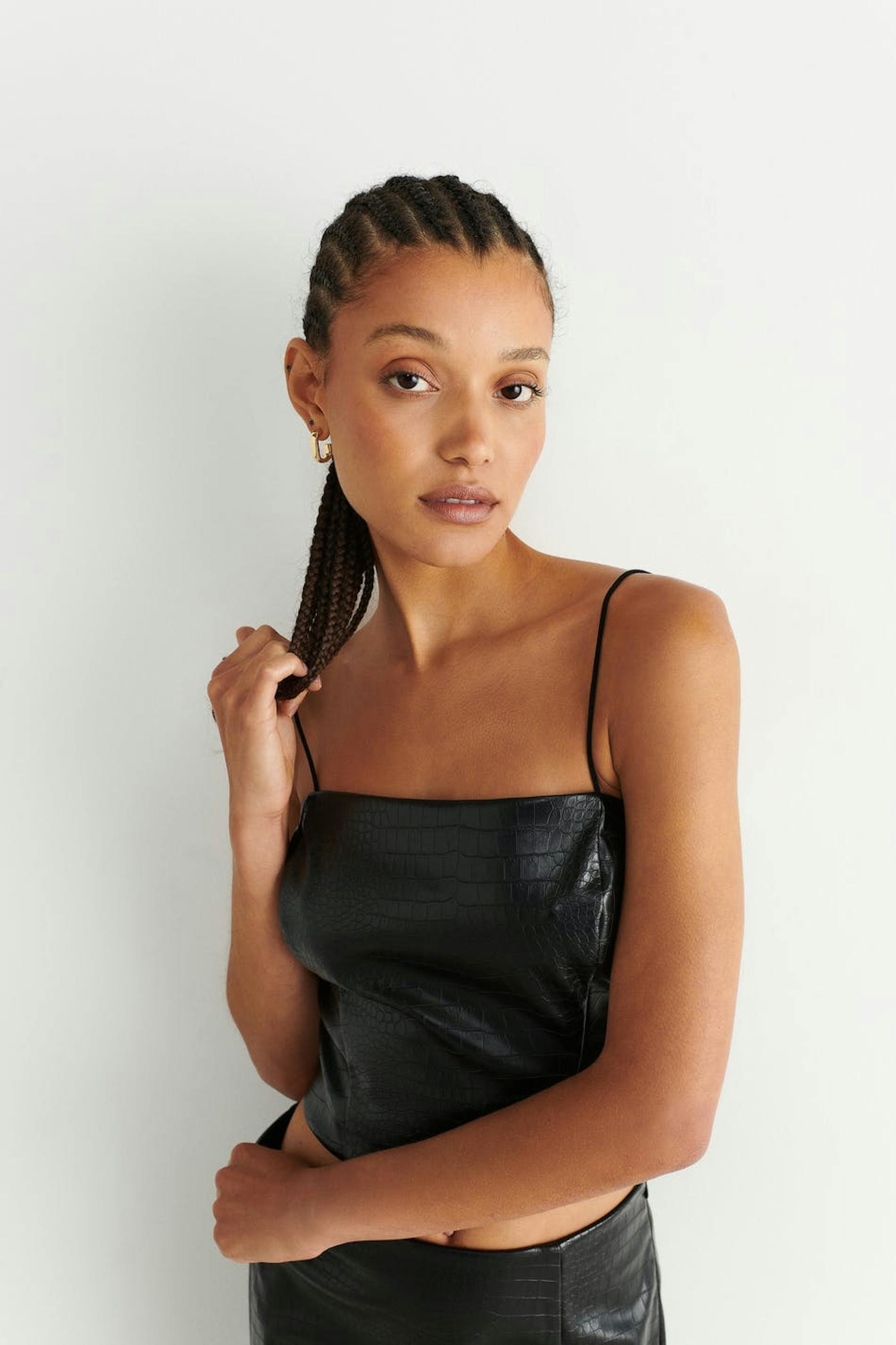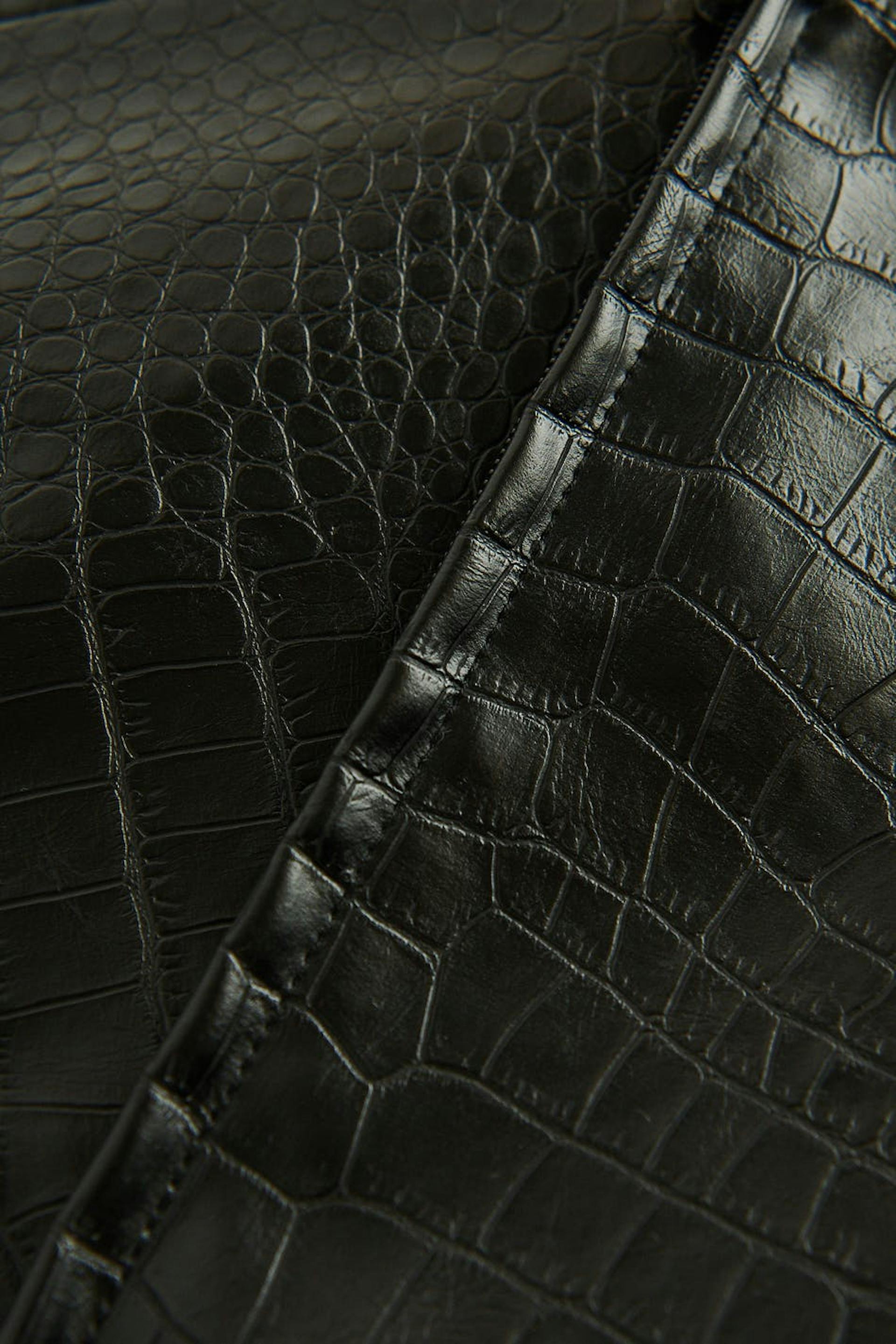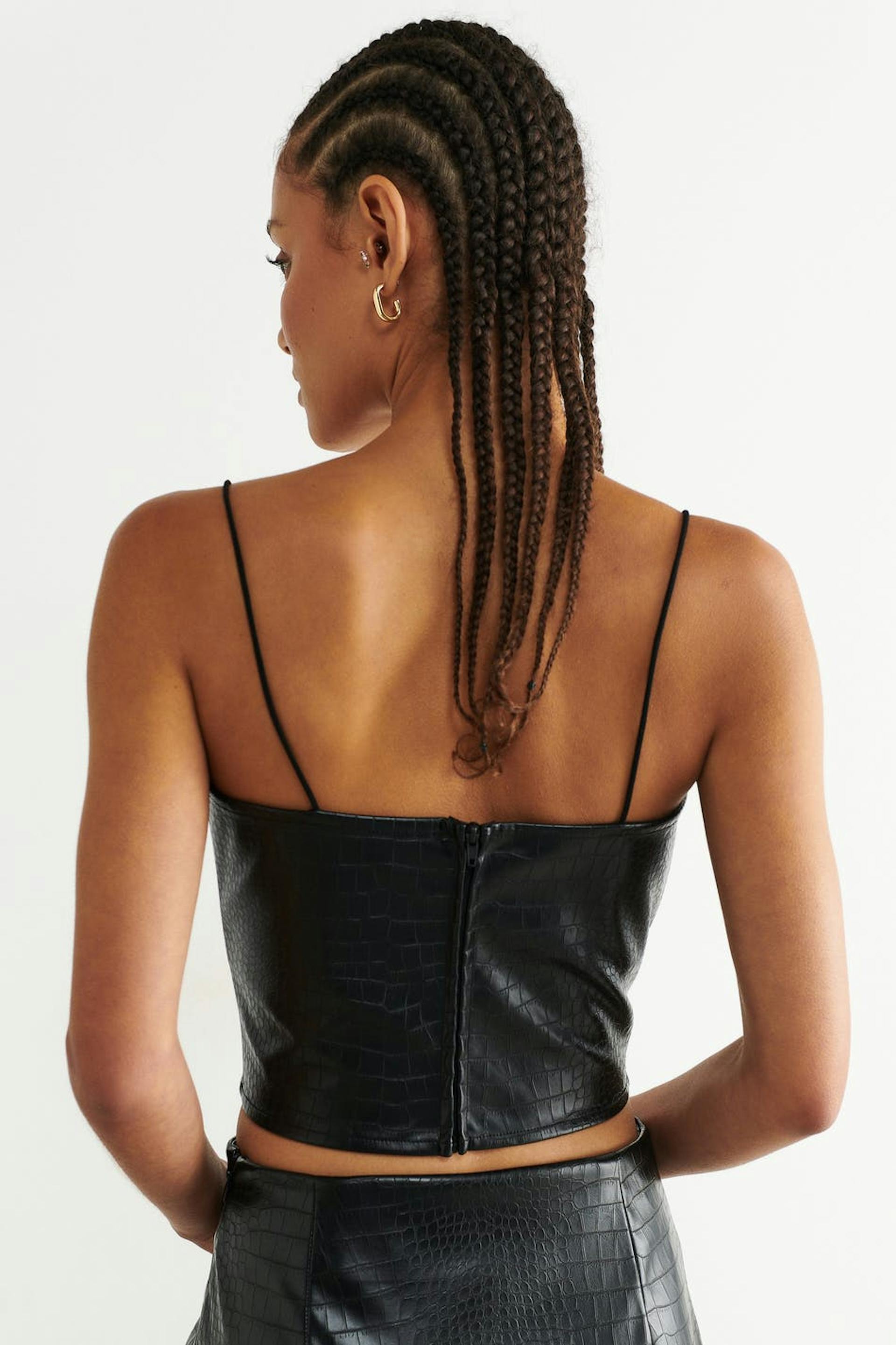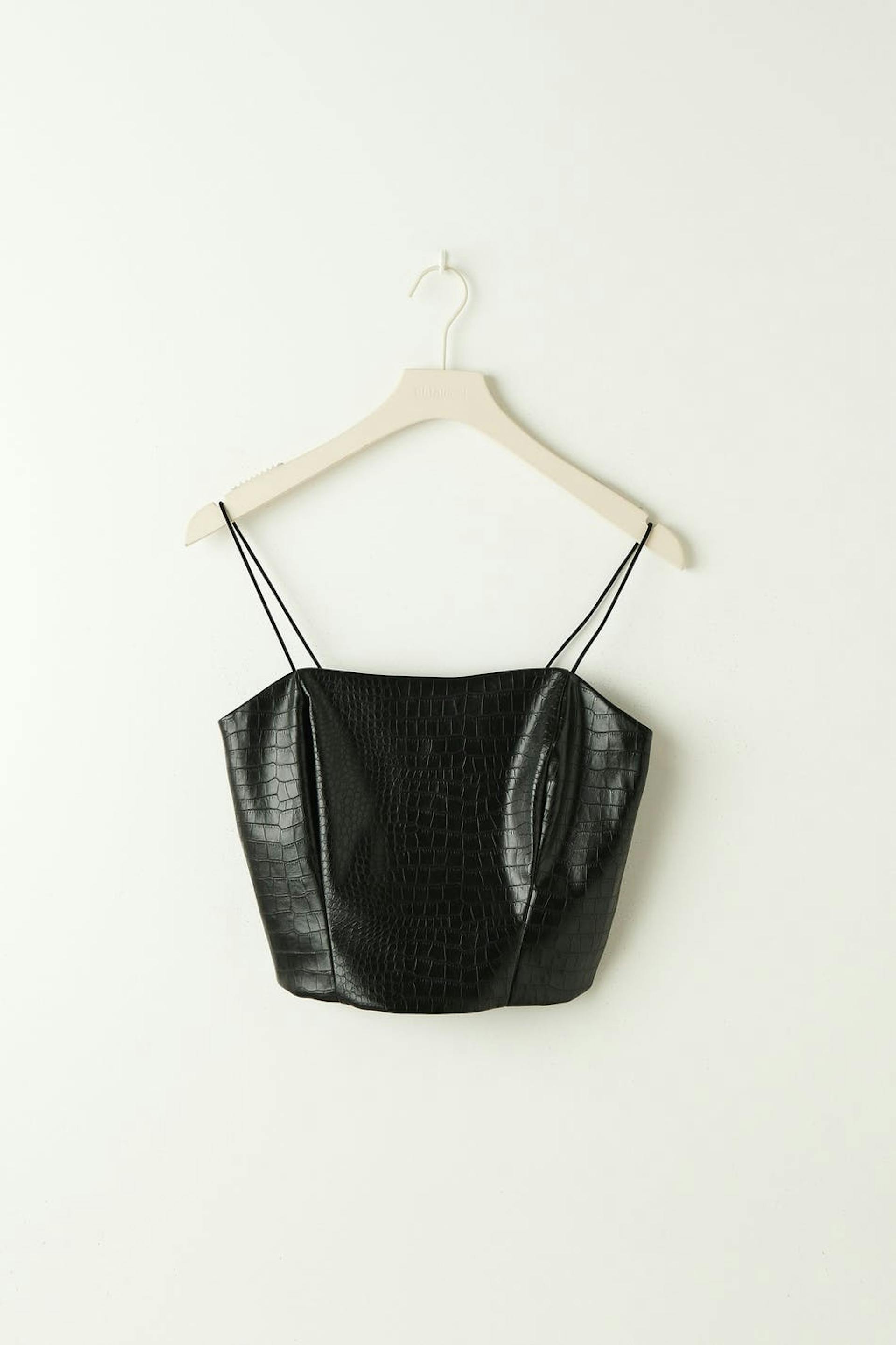 Tank in imitation leather with a crocodile pattern and thin shoulder straps. The tank is black and has fitted fit. It has zip in the back, seam details in the sides and a cropped length.