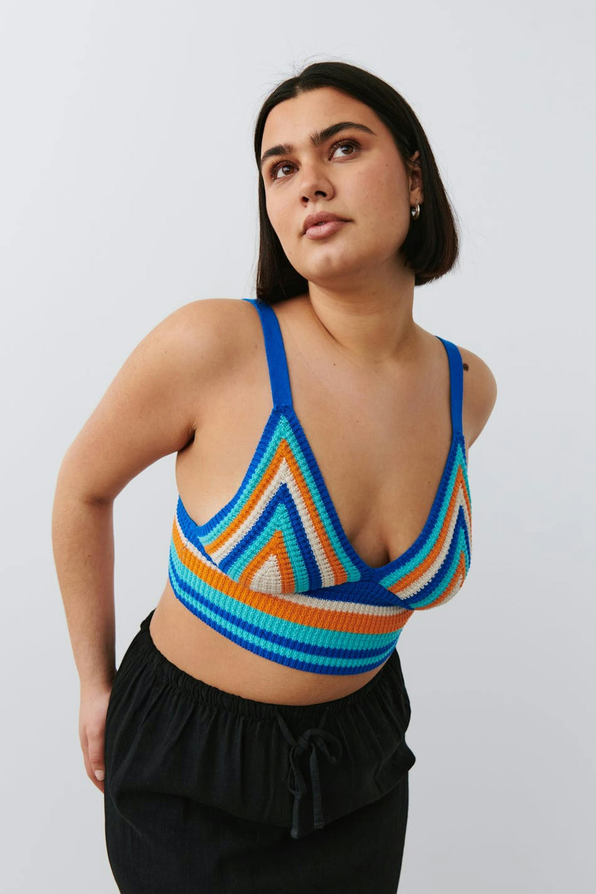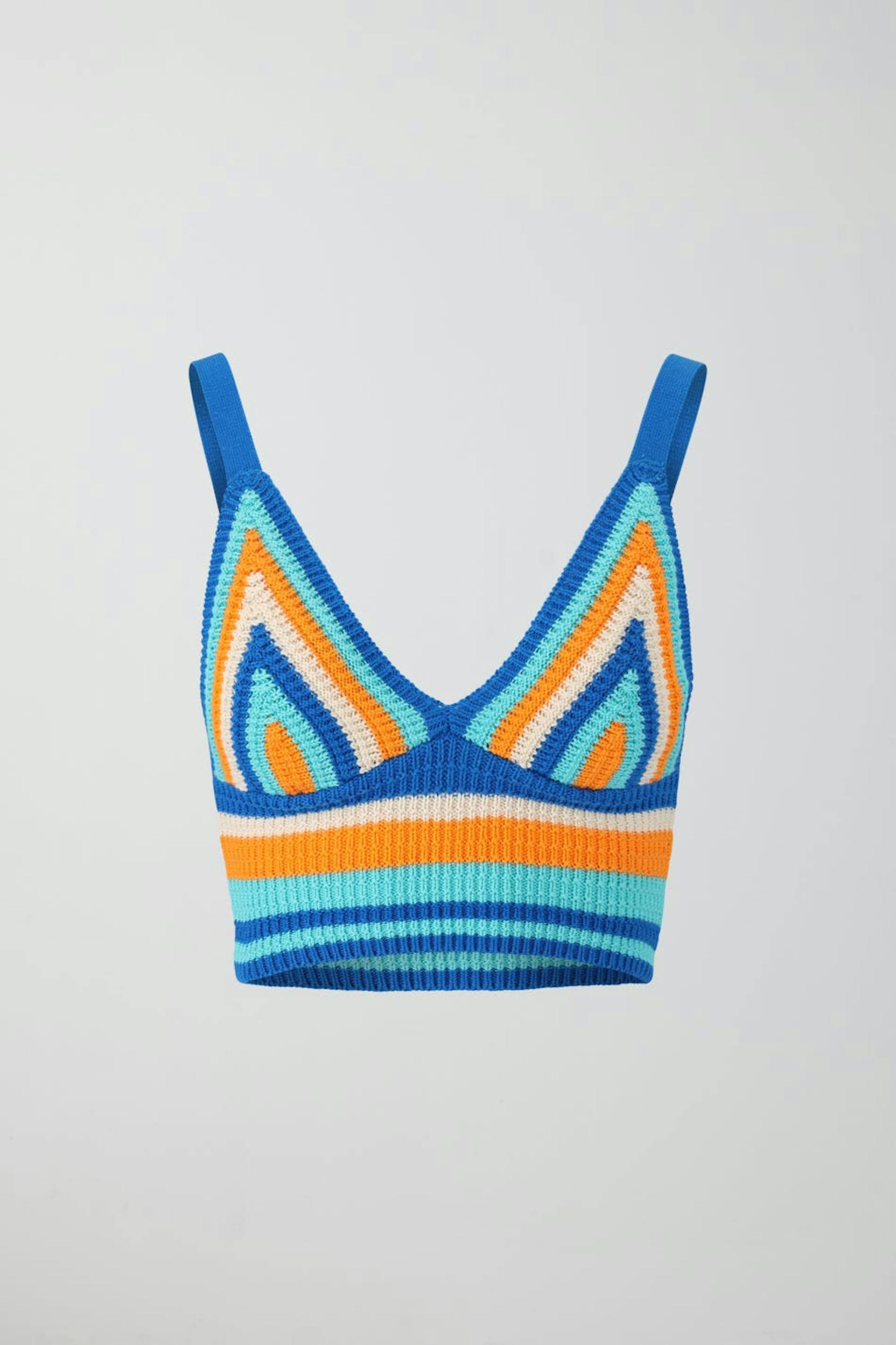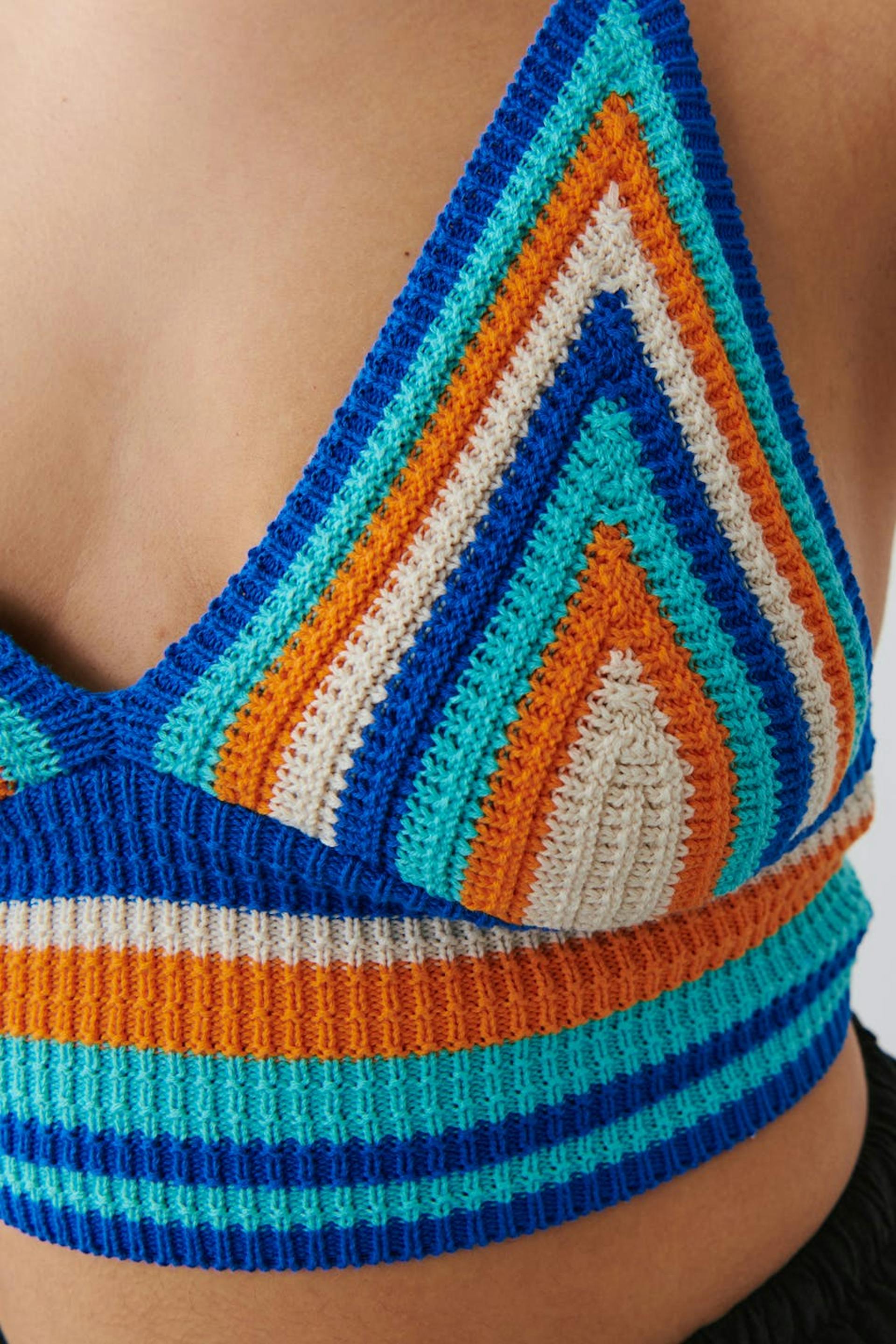 Crocheted top with v-neck. The top is blue, orange and striped. It has wide shoulder straps and cropped length.