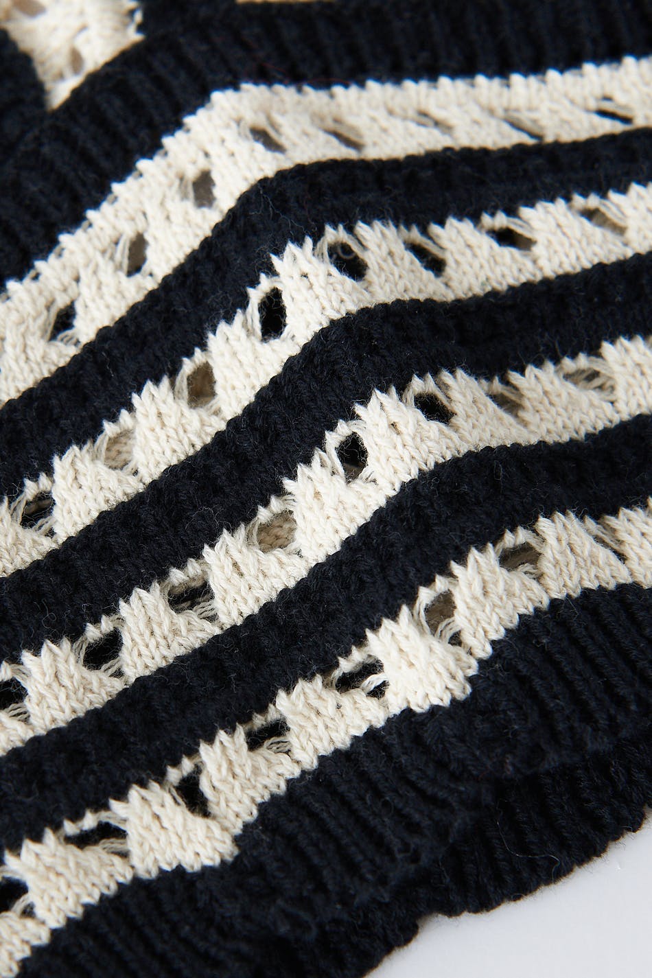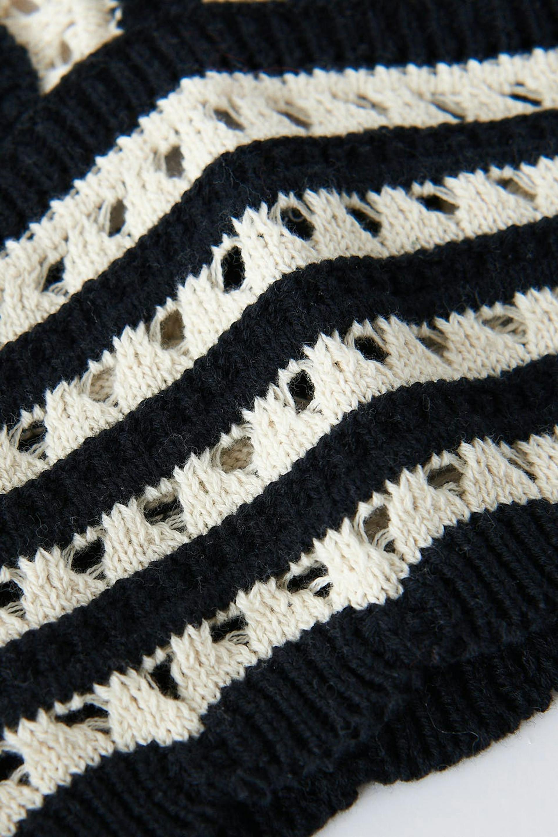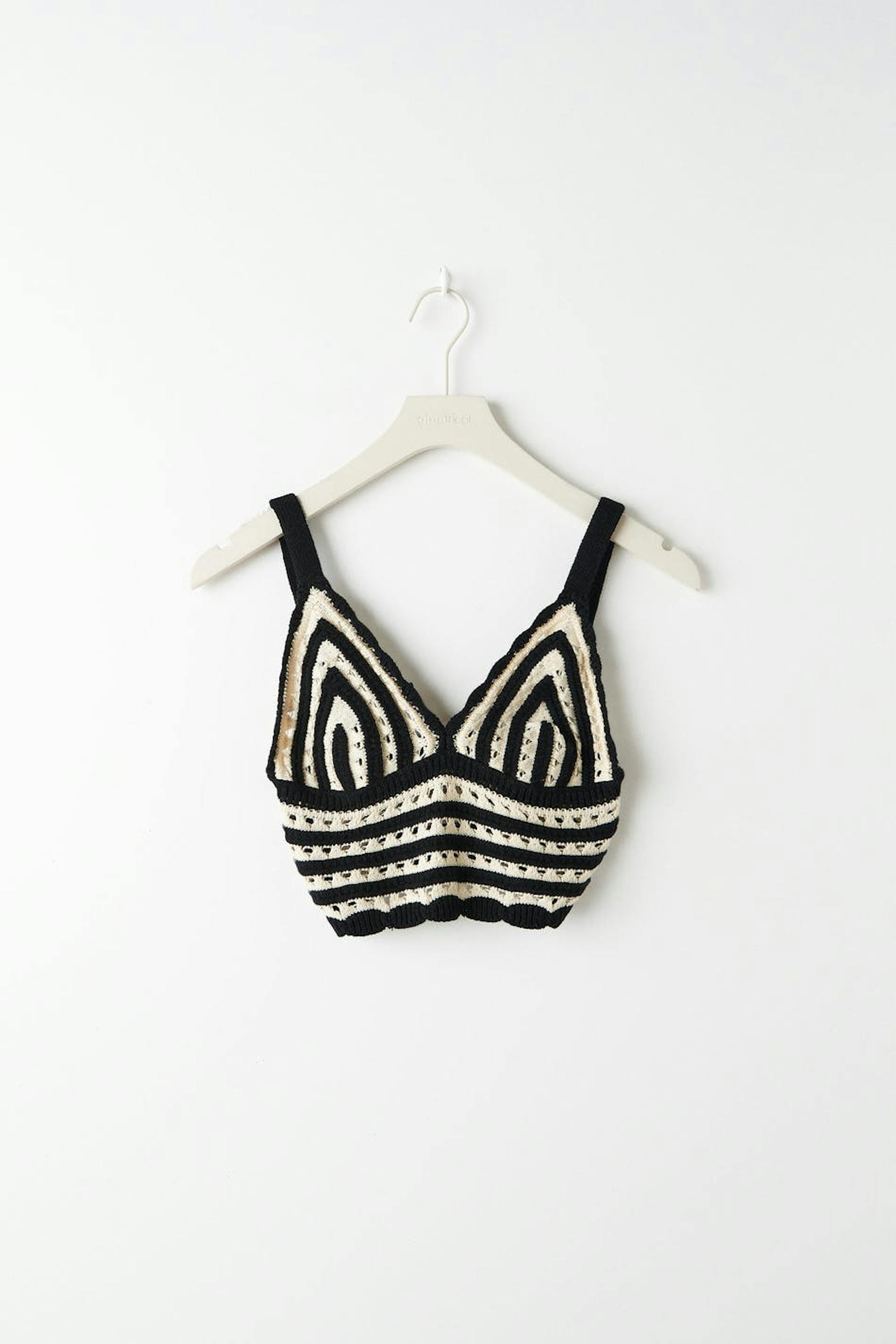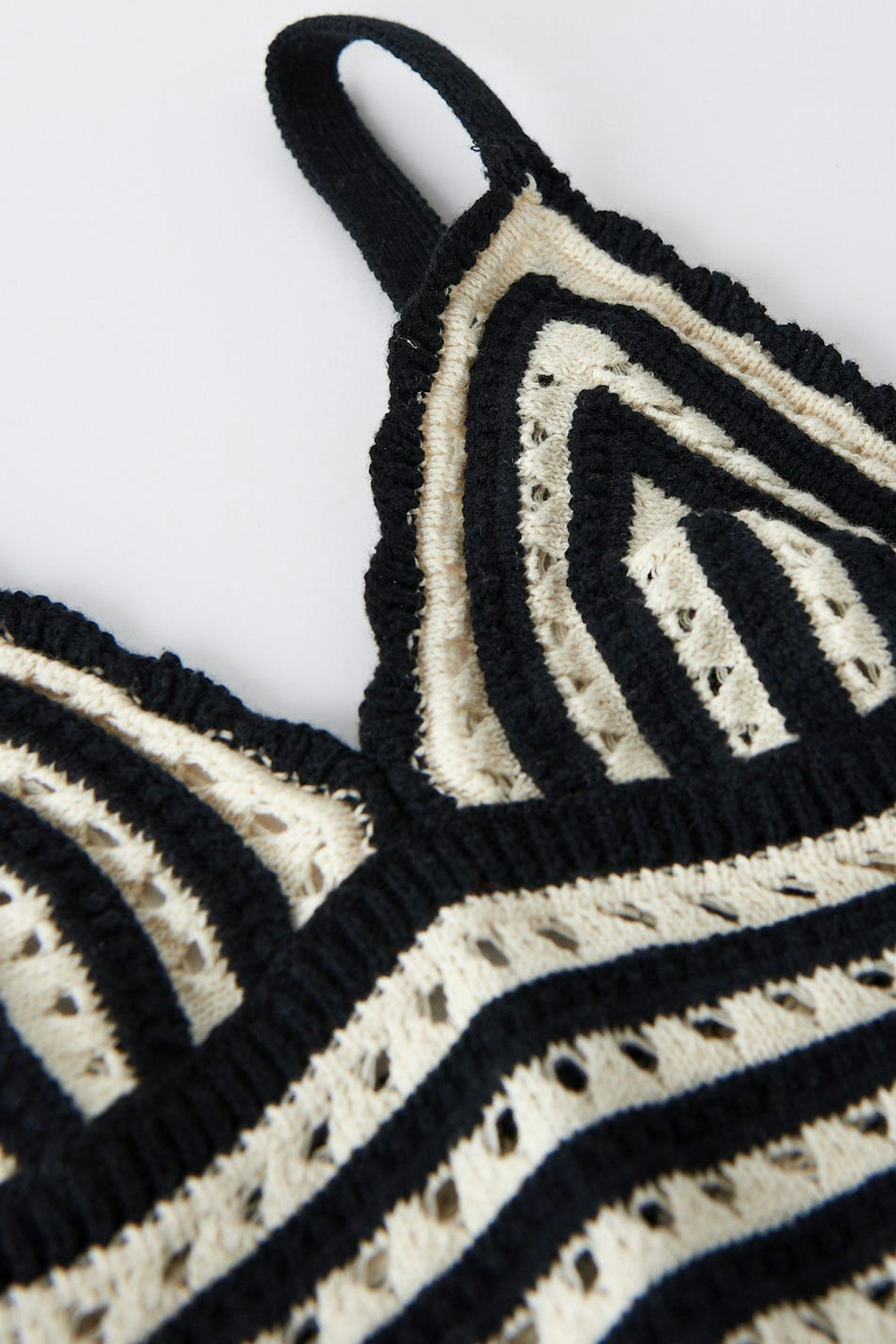 Crocheted top with v-neck cut. The top has a black and white pattern and a cropped length.