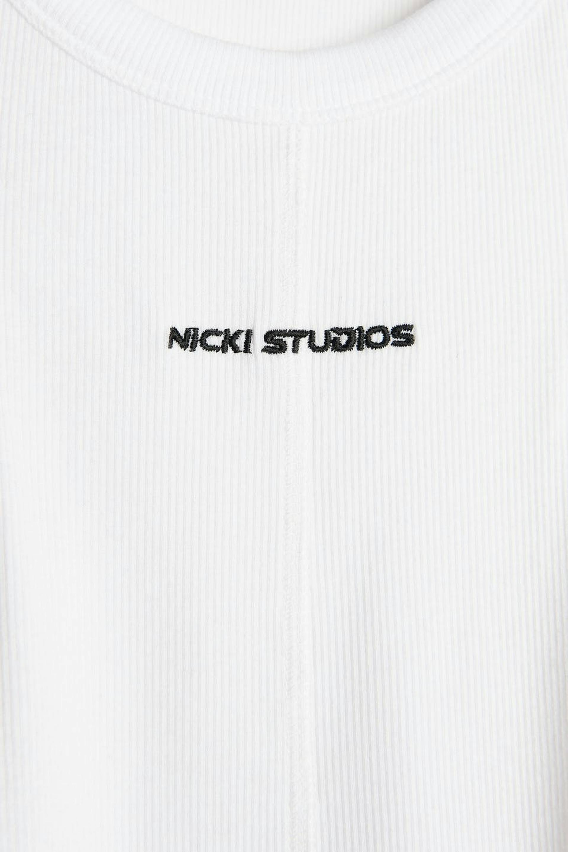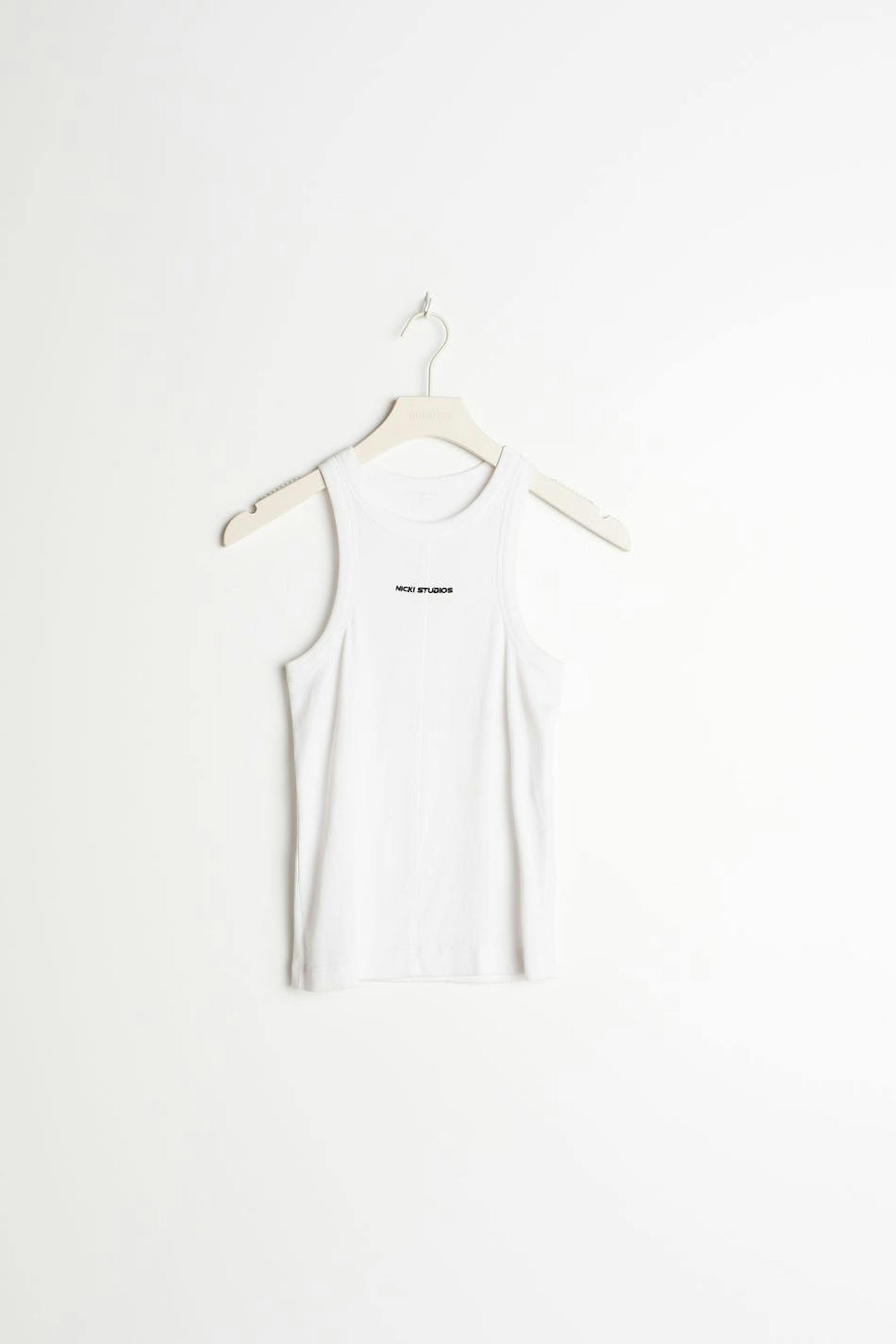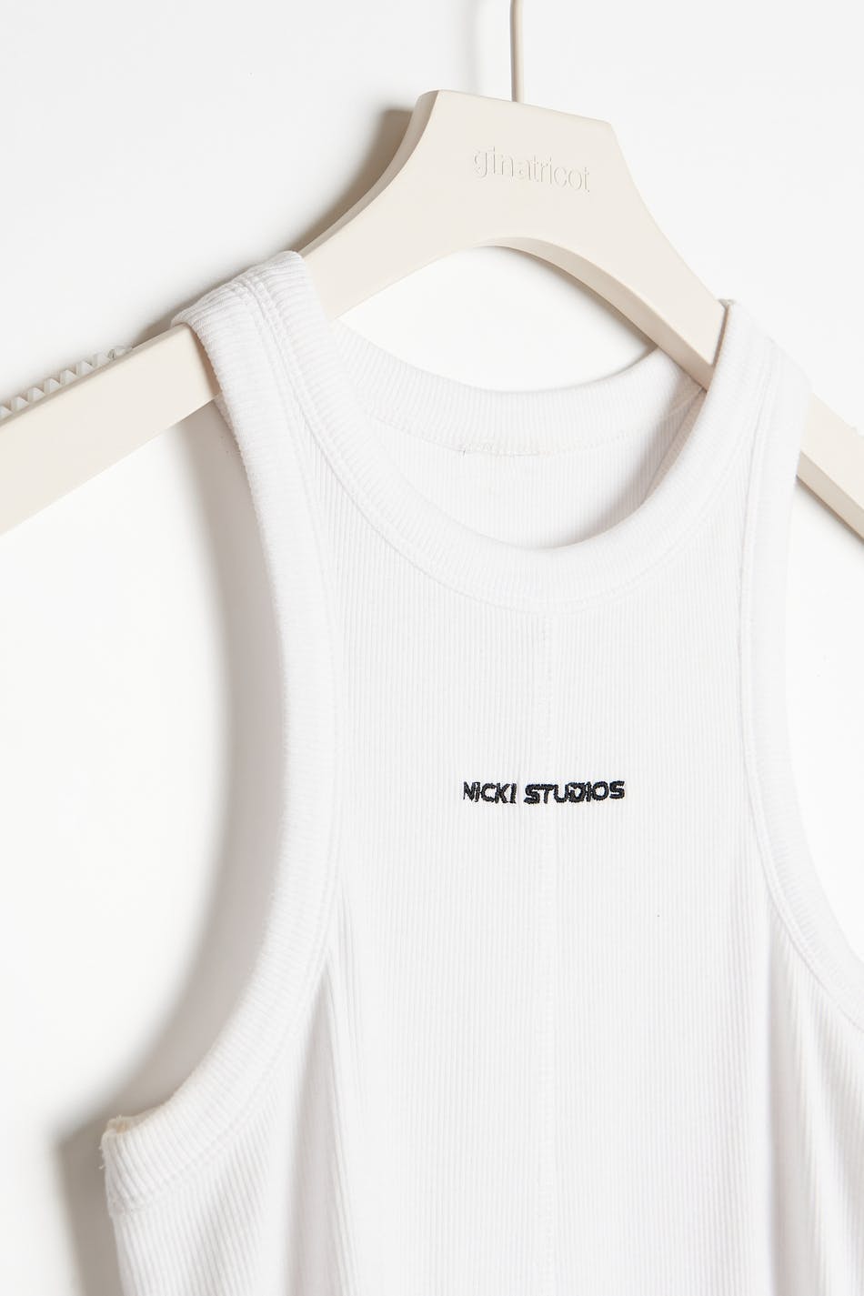 Nicki Studios X Gina Tricot. Tank with a ribbed quality in jersey. The tank is white and has brand embroidery at the front. It has a fitted fit, a high neckline and a decorative seam detail at the front.