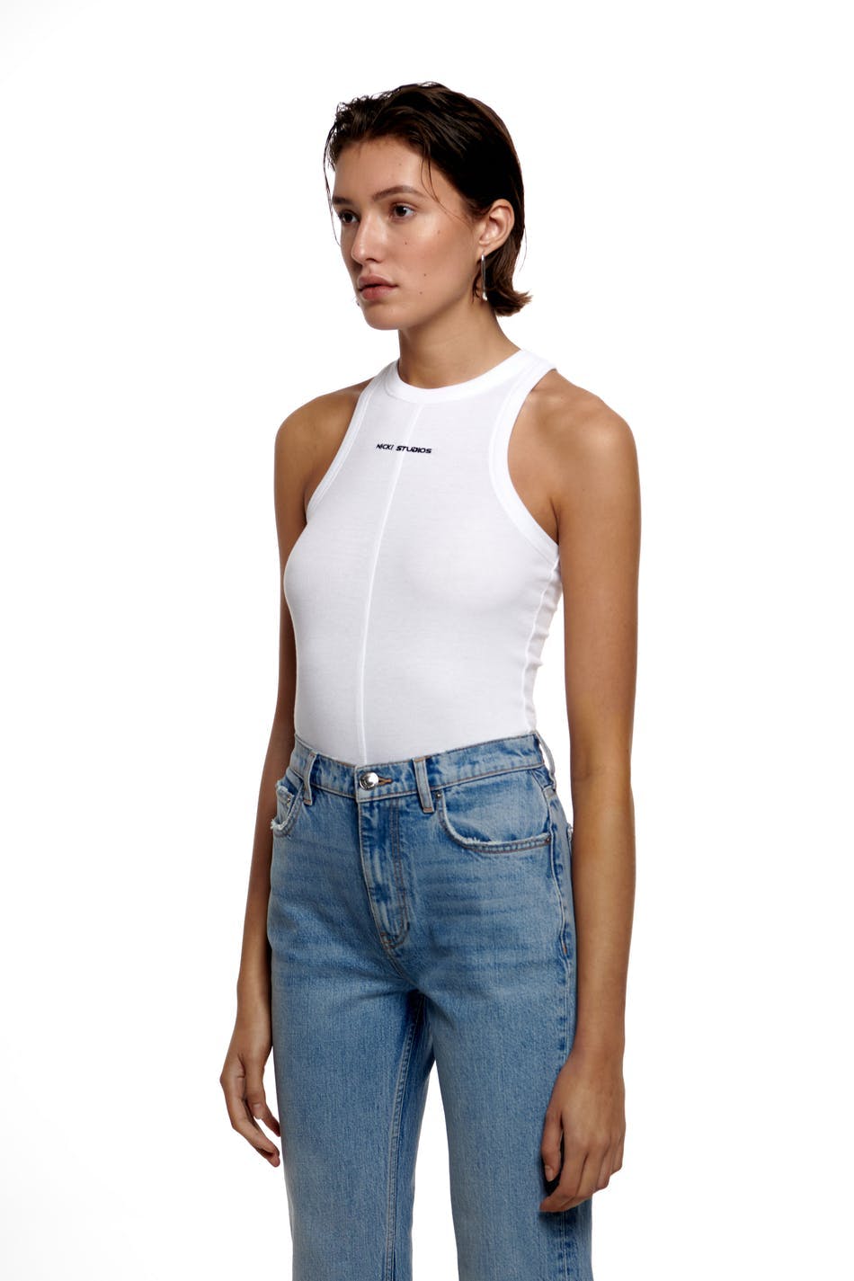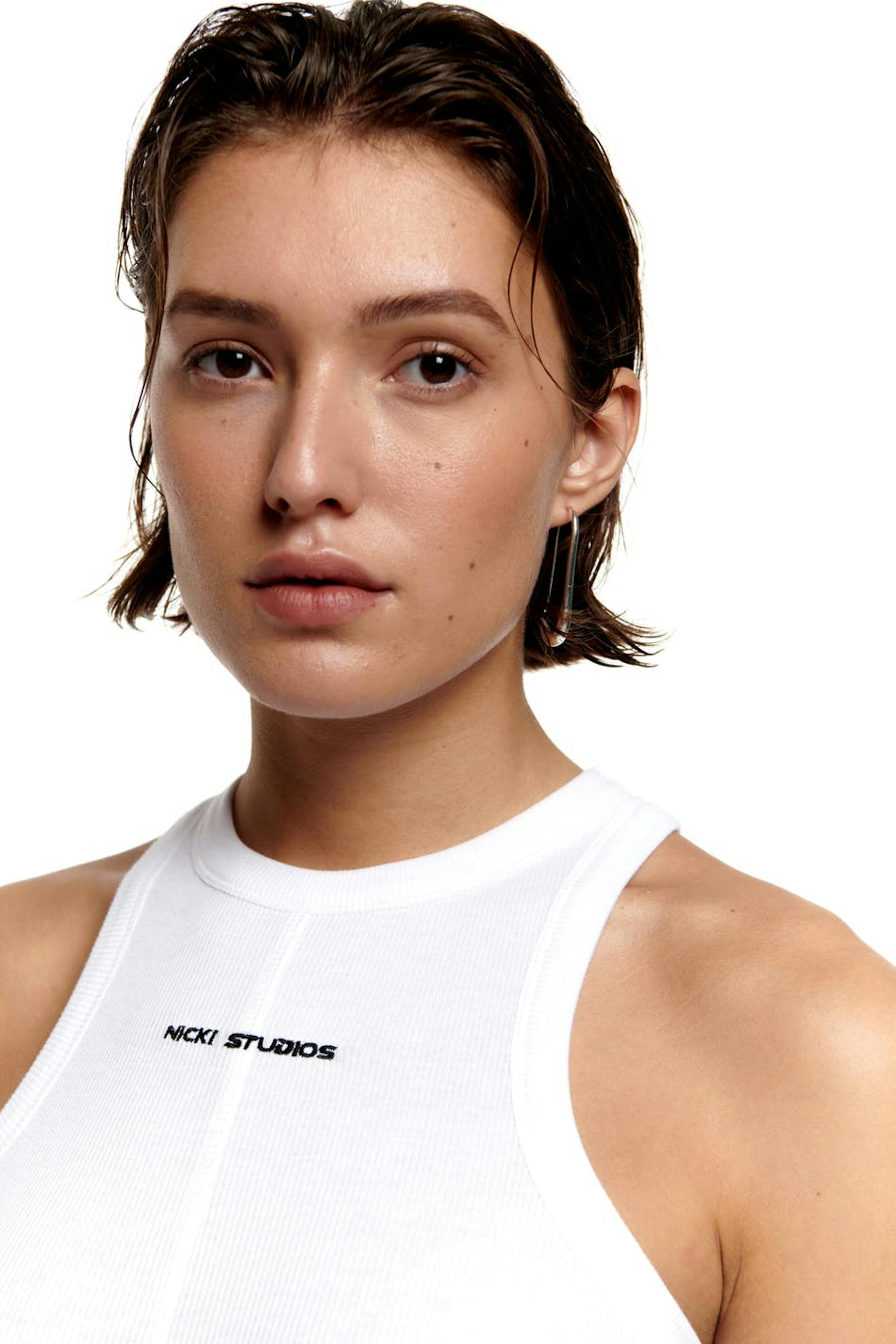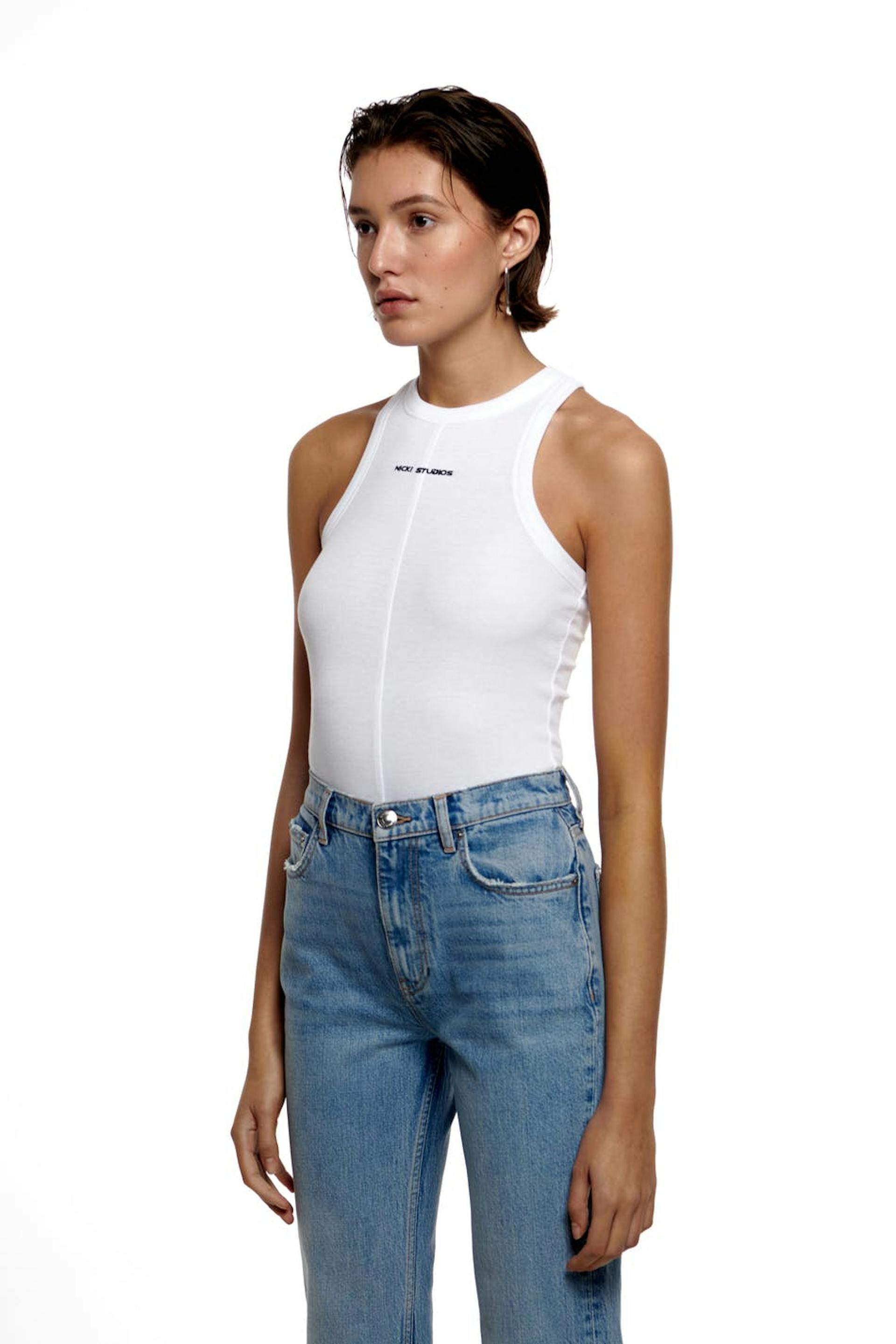 Nicki Studios X Gina Tricot. Tank with a ribbed quality in jersey. The tank is white and has brand embroidery at the front. It has a fitted fit, a high neckline and a decorative seam detail at the front.