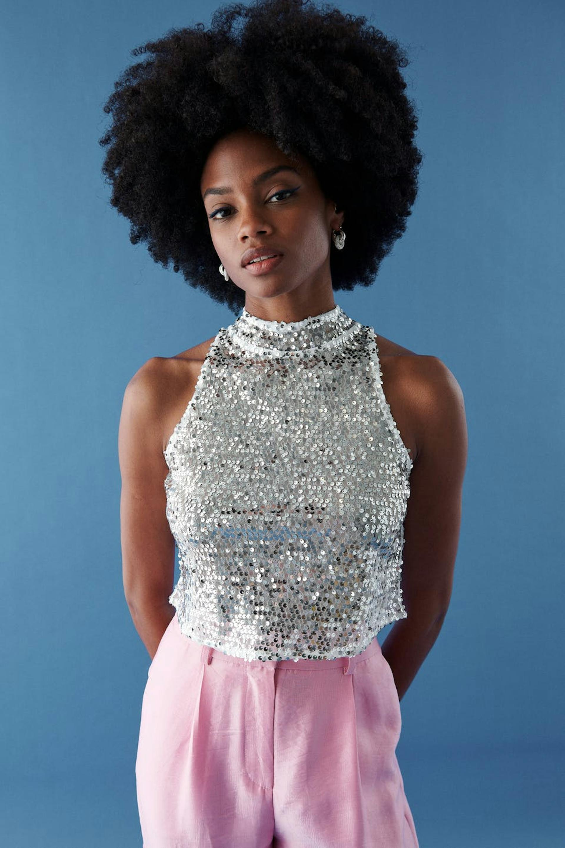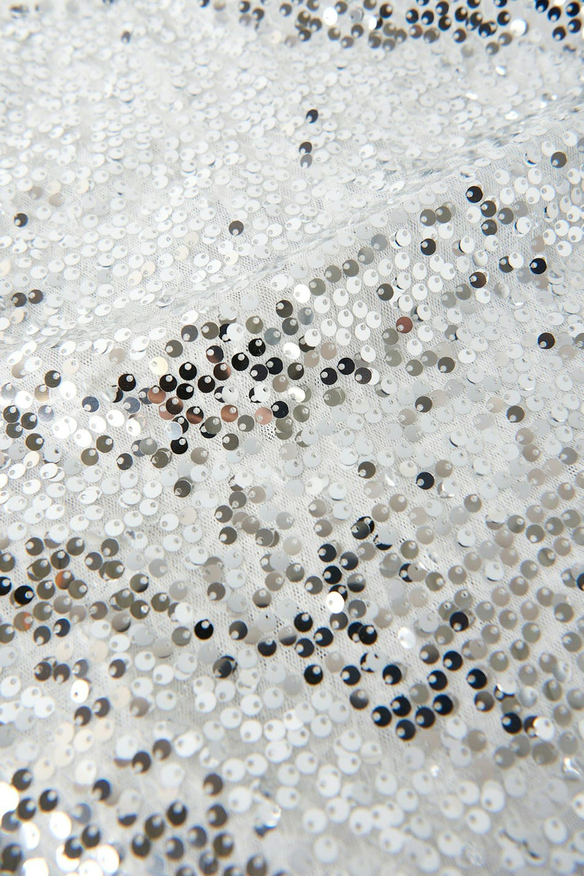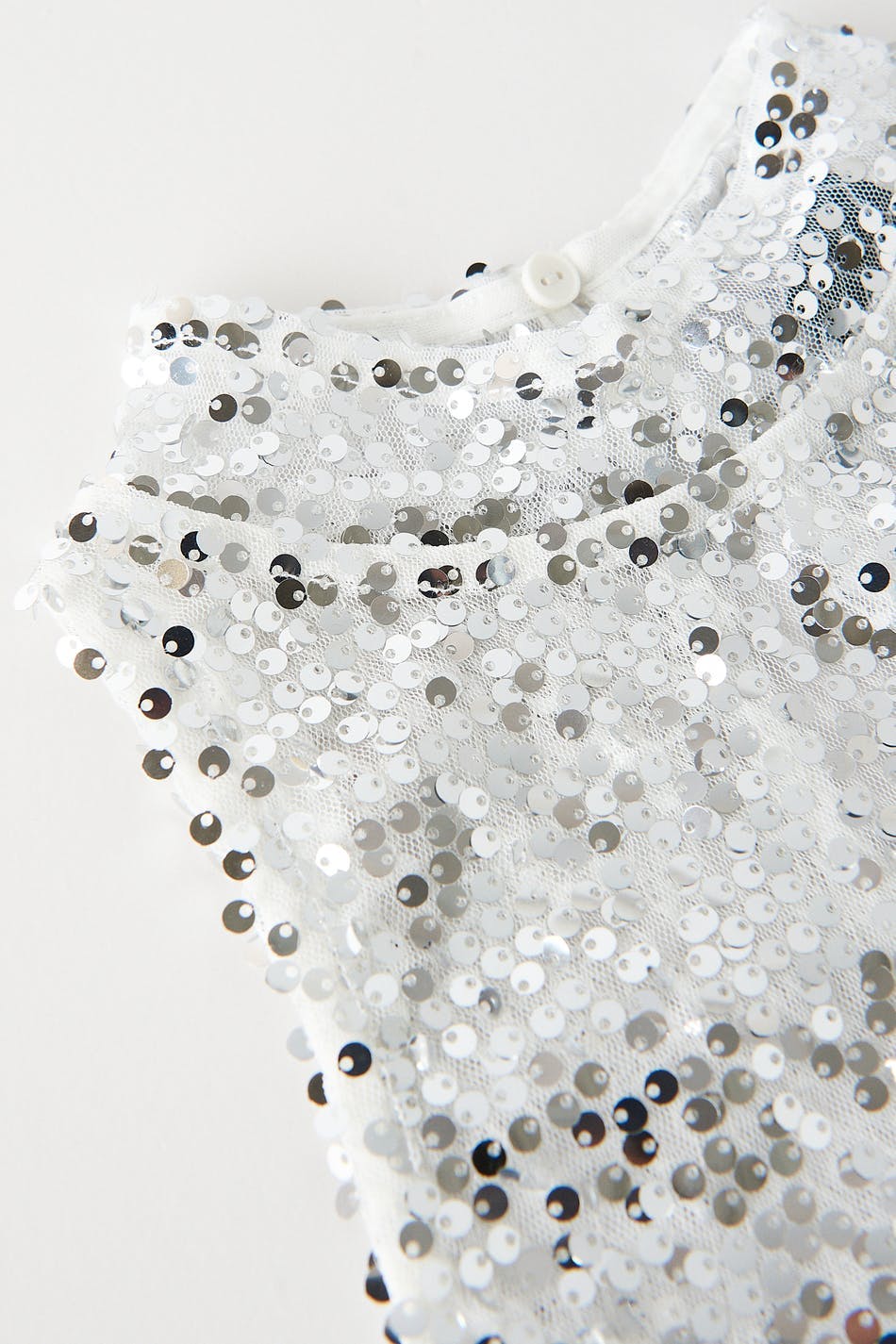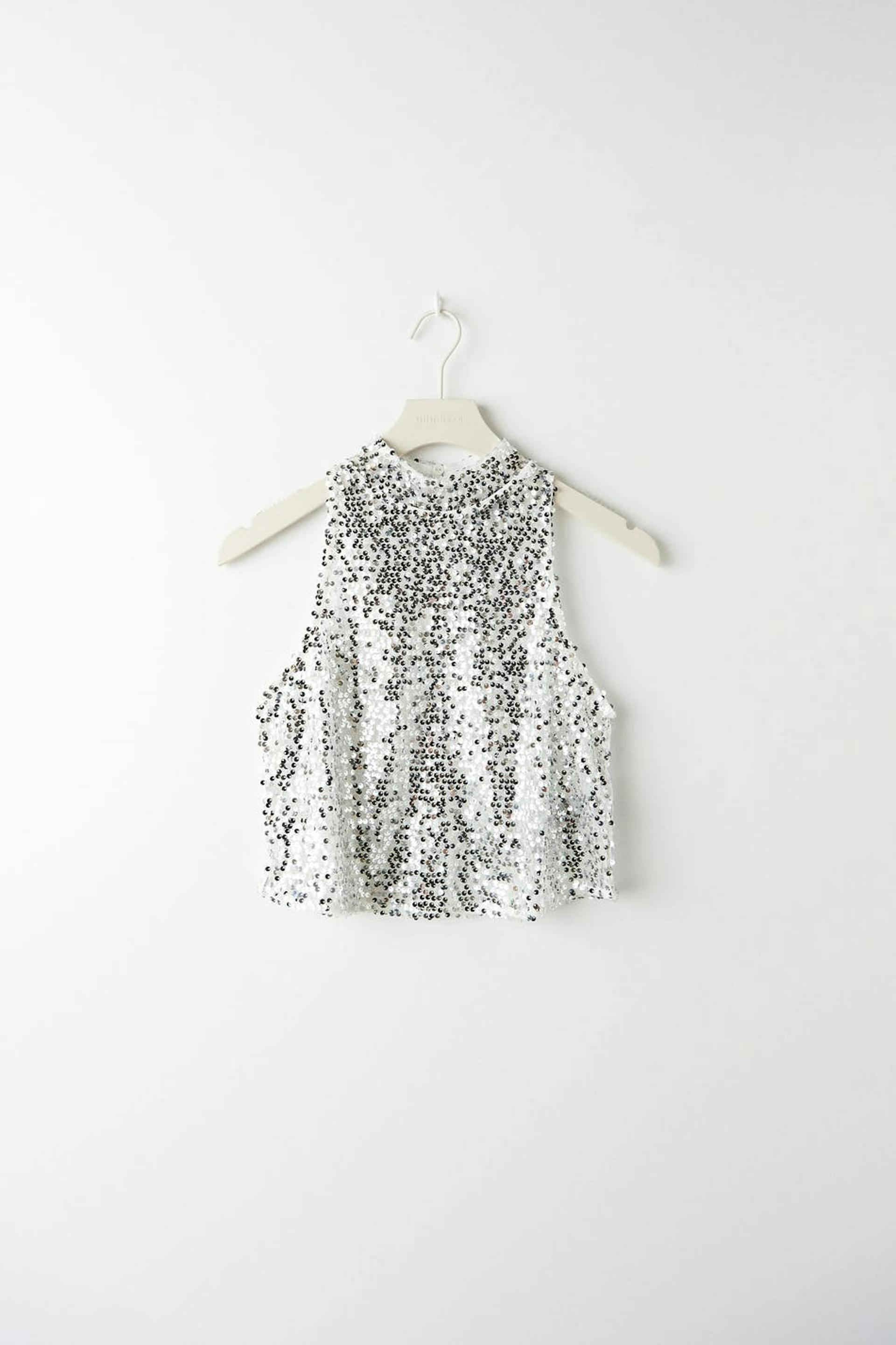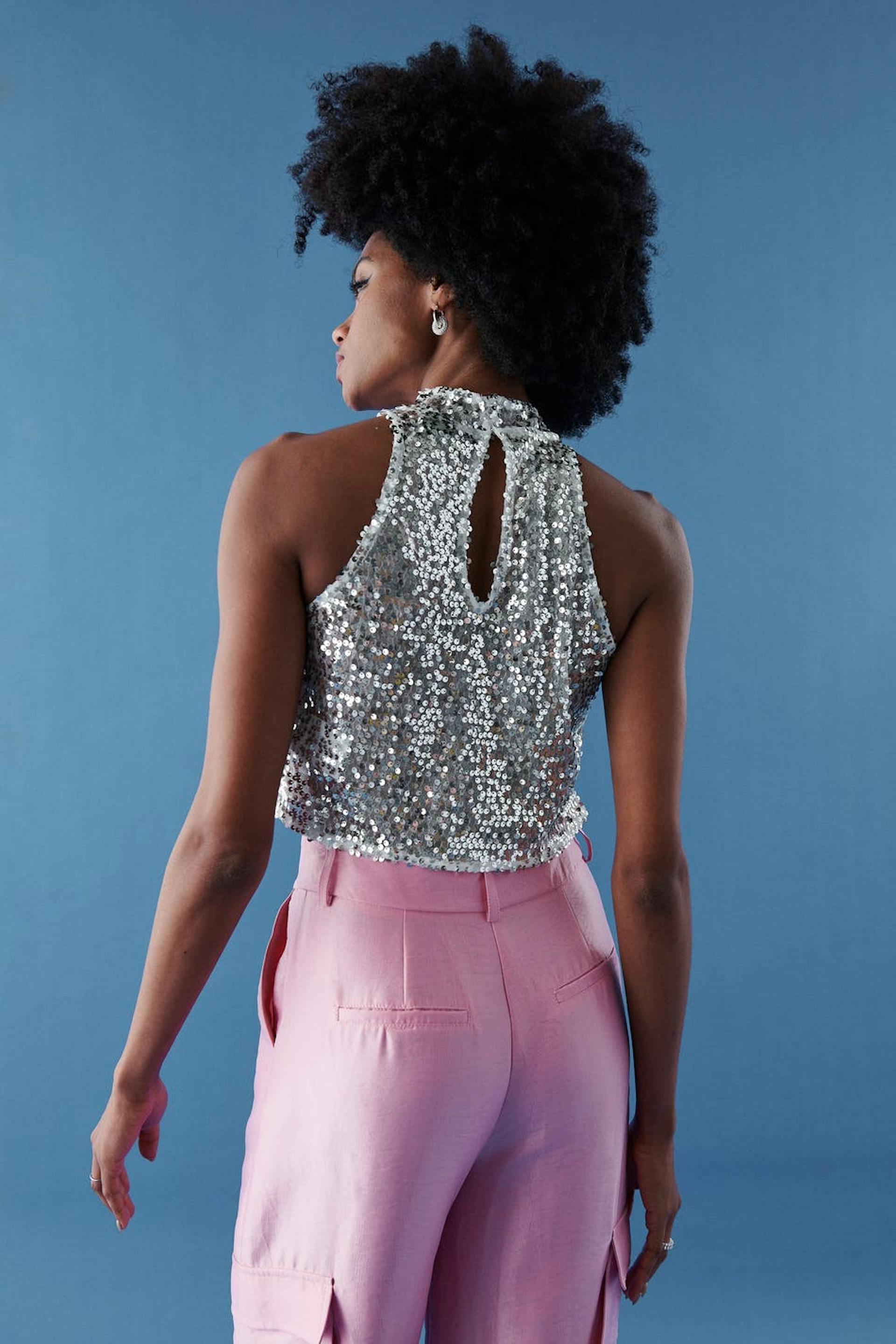 Sleeveless sequin top with turtleneck. The sequin top is perfect for the party, silver coloured and cropped. It has a button fastening at neck and a cut out detail at the back.