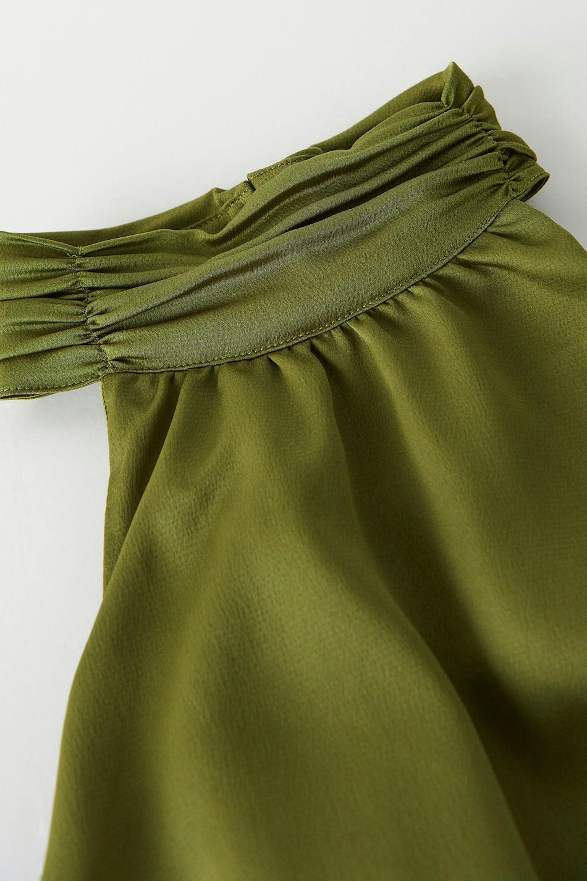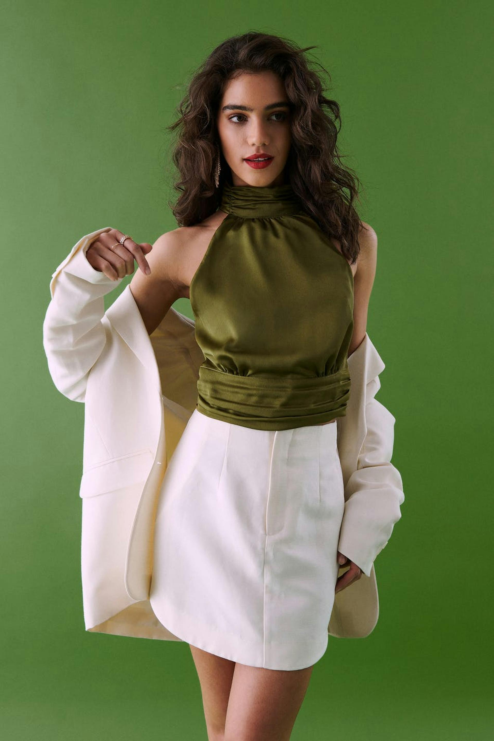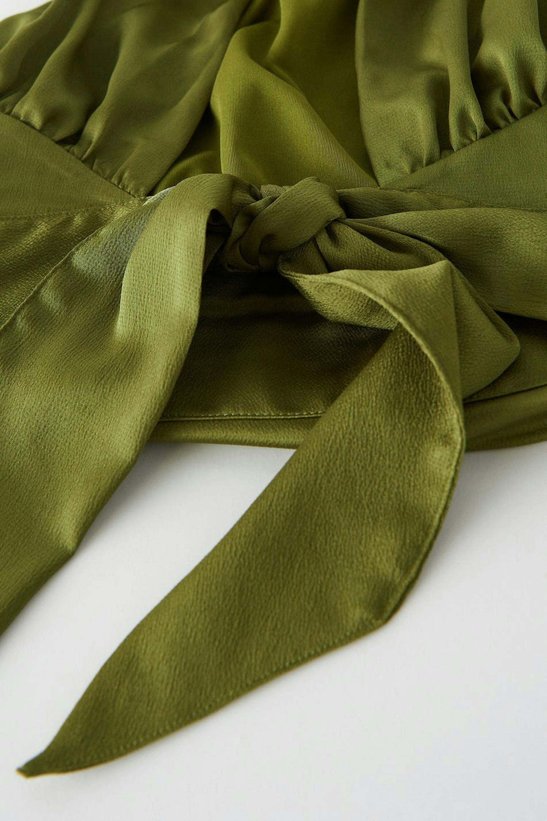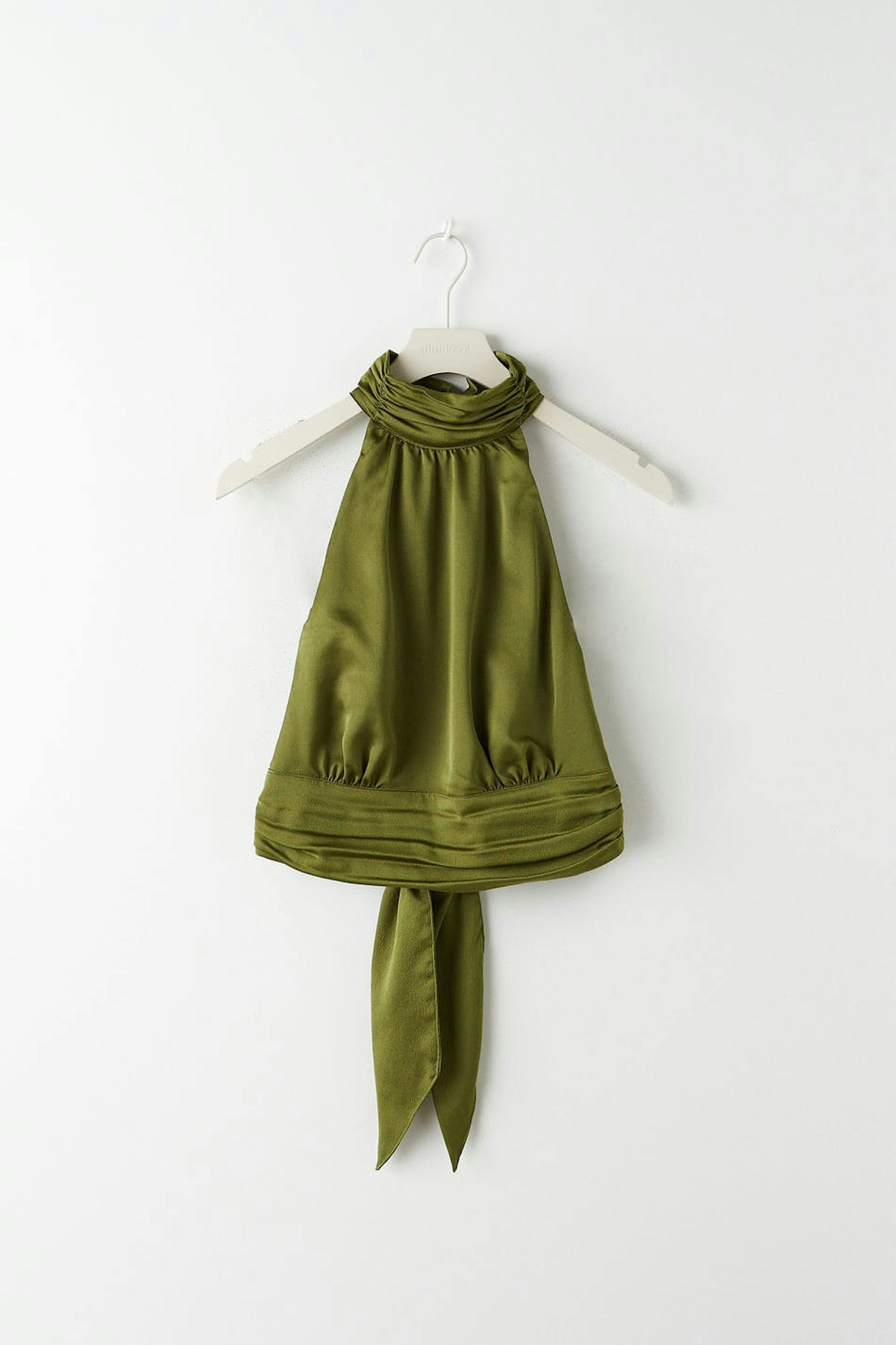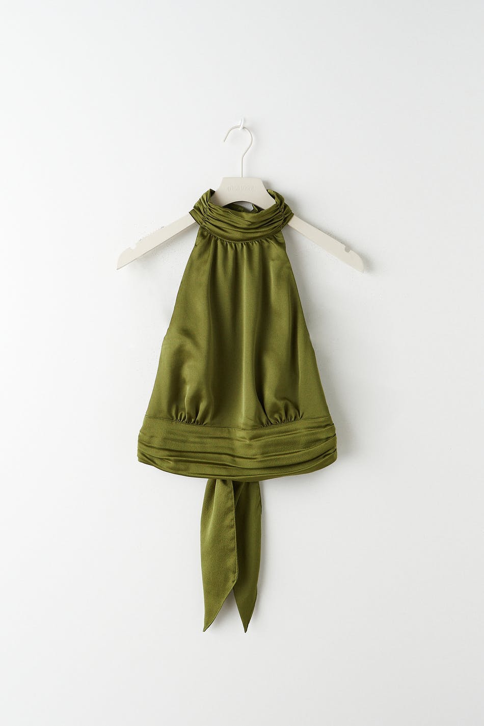 Top with a decorative knot detail in the back. The top is perfect for the party and green and has a short length. It has a decorative button placket at neck.