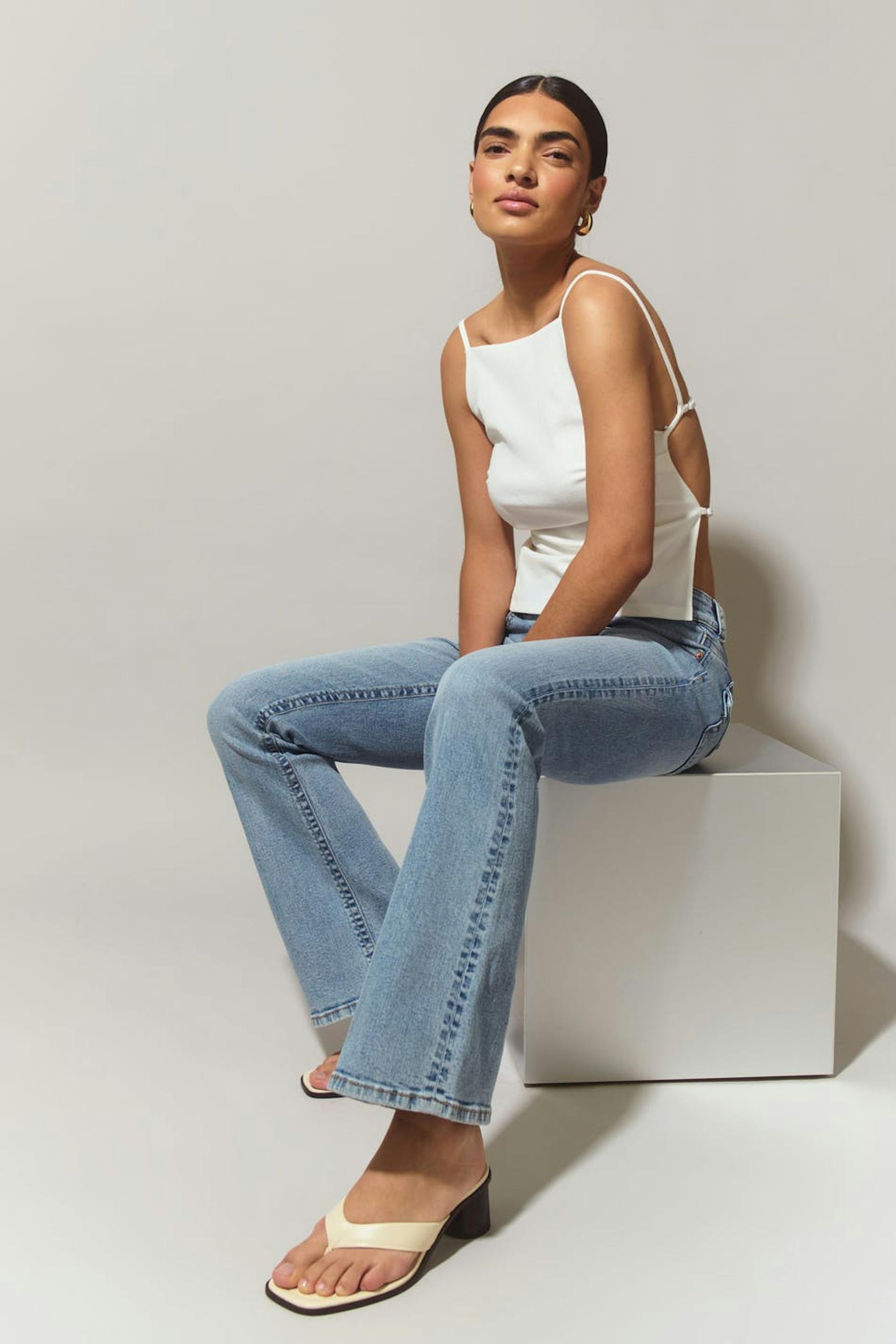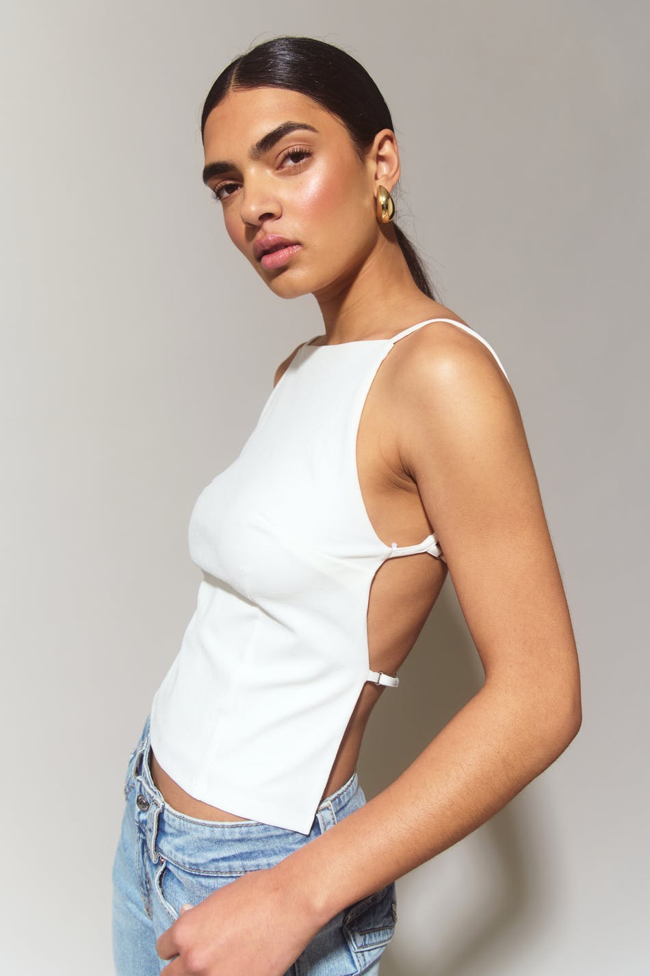 Sleeveless top with open back. The top is white and has thin shoulder straps. It has figure-hugging fit, high neckline and adjustable straps in the back.