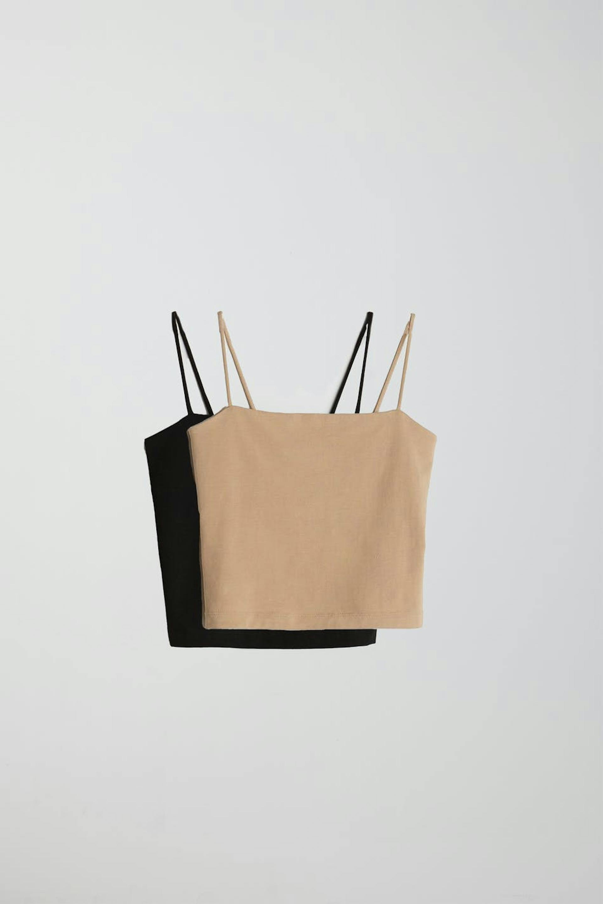 Short camisoles in jersey with thin shoulder straps. The camisoles are beige and black and have lined front panel.