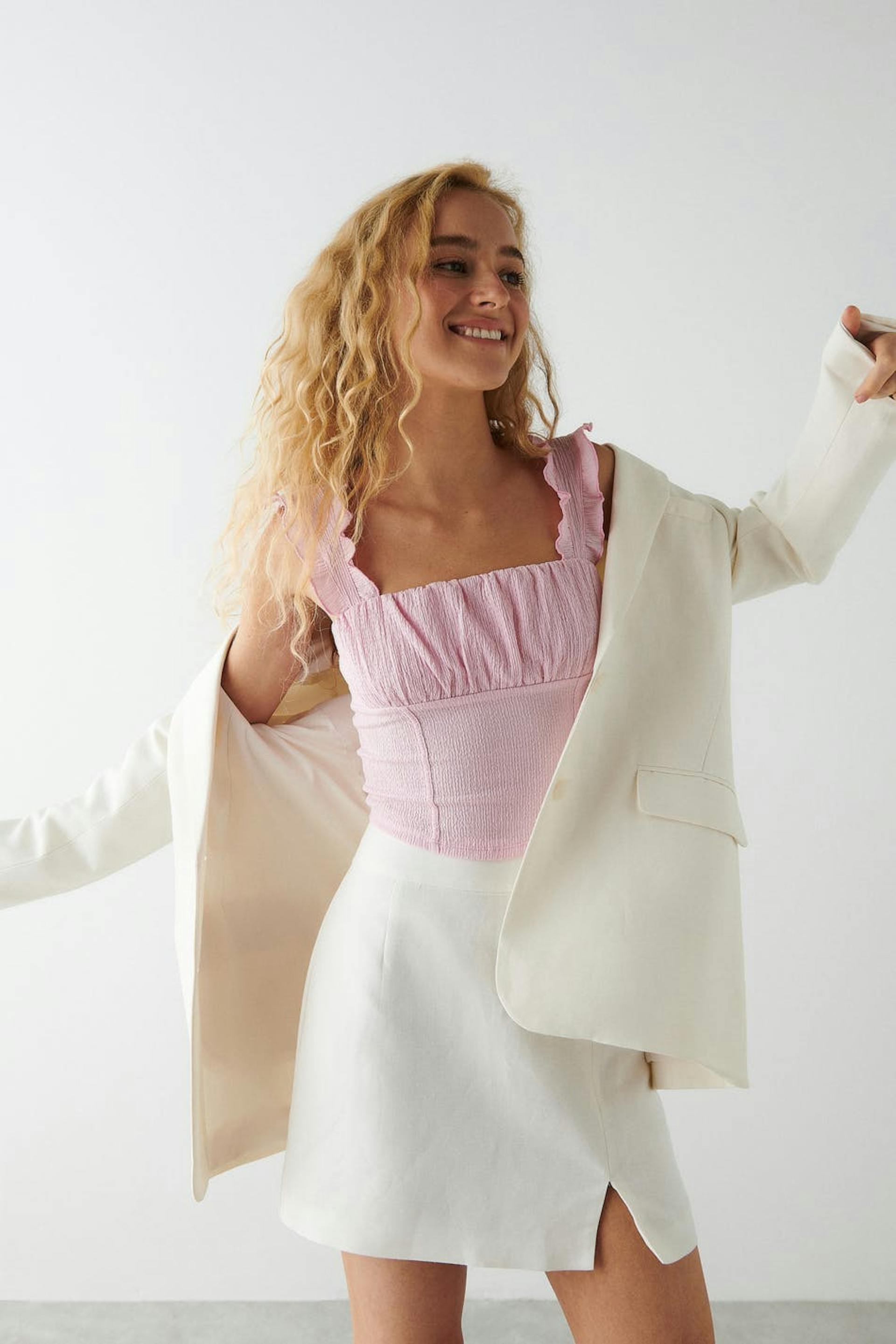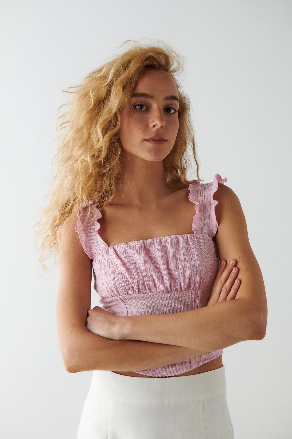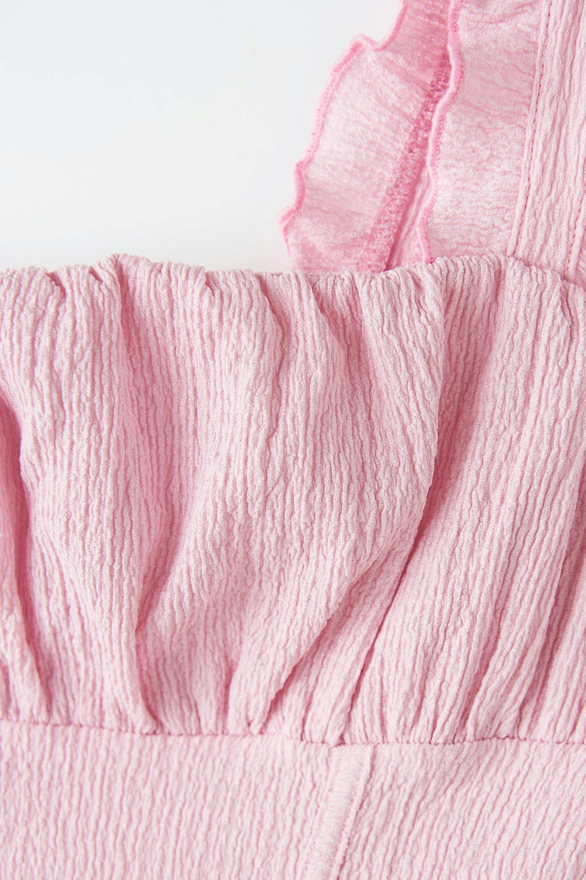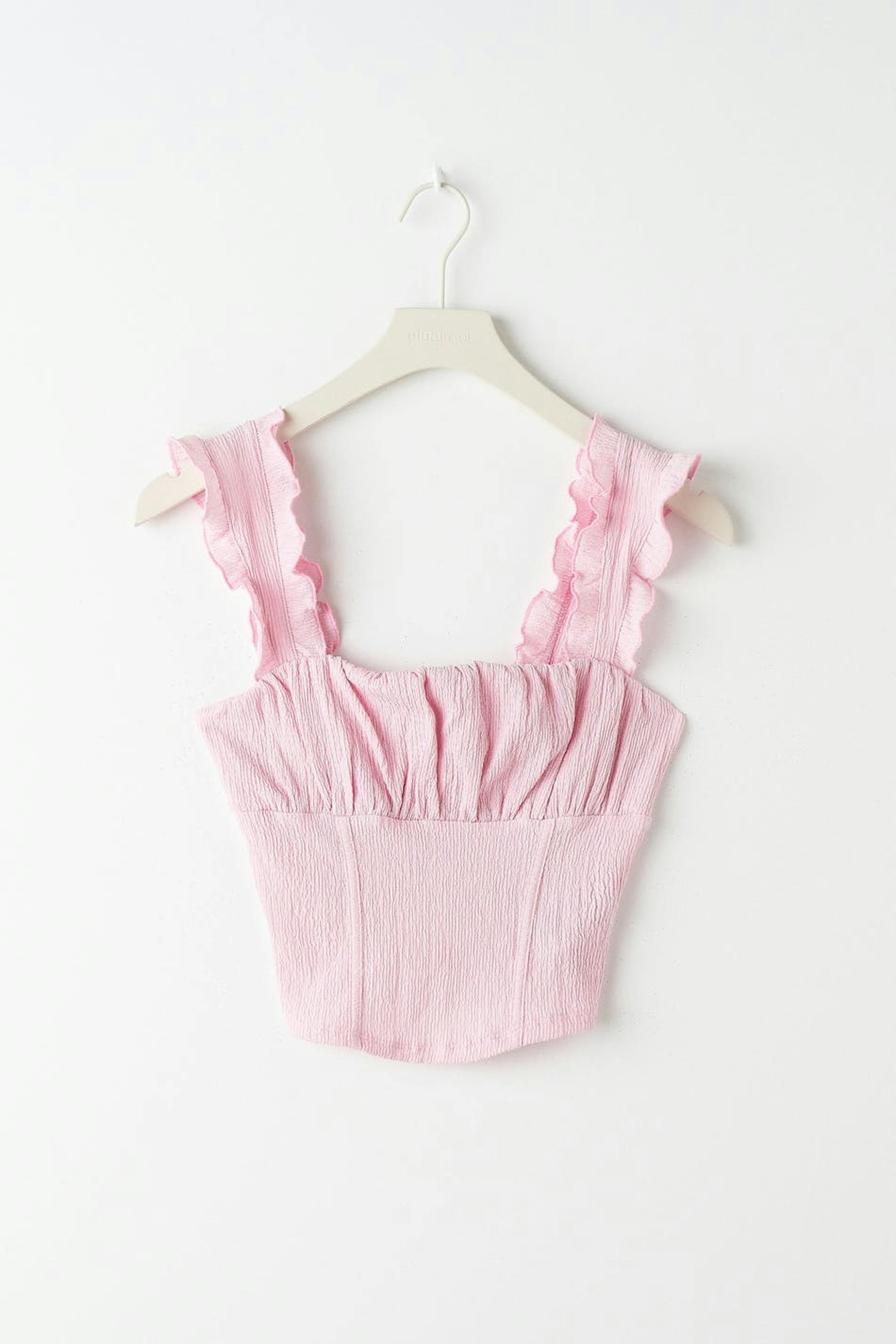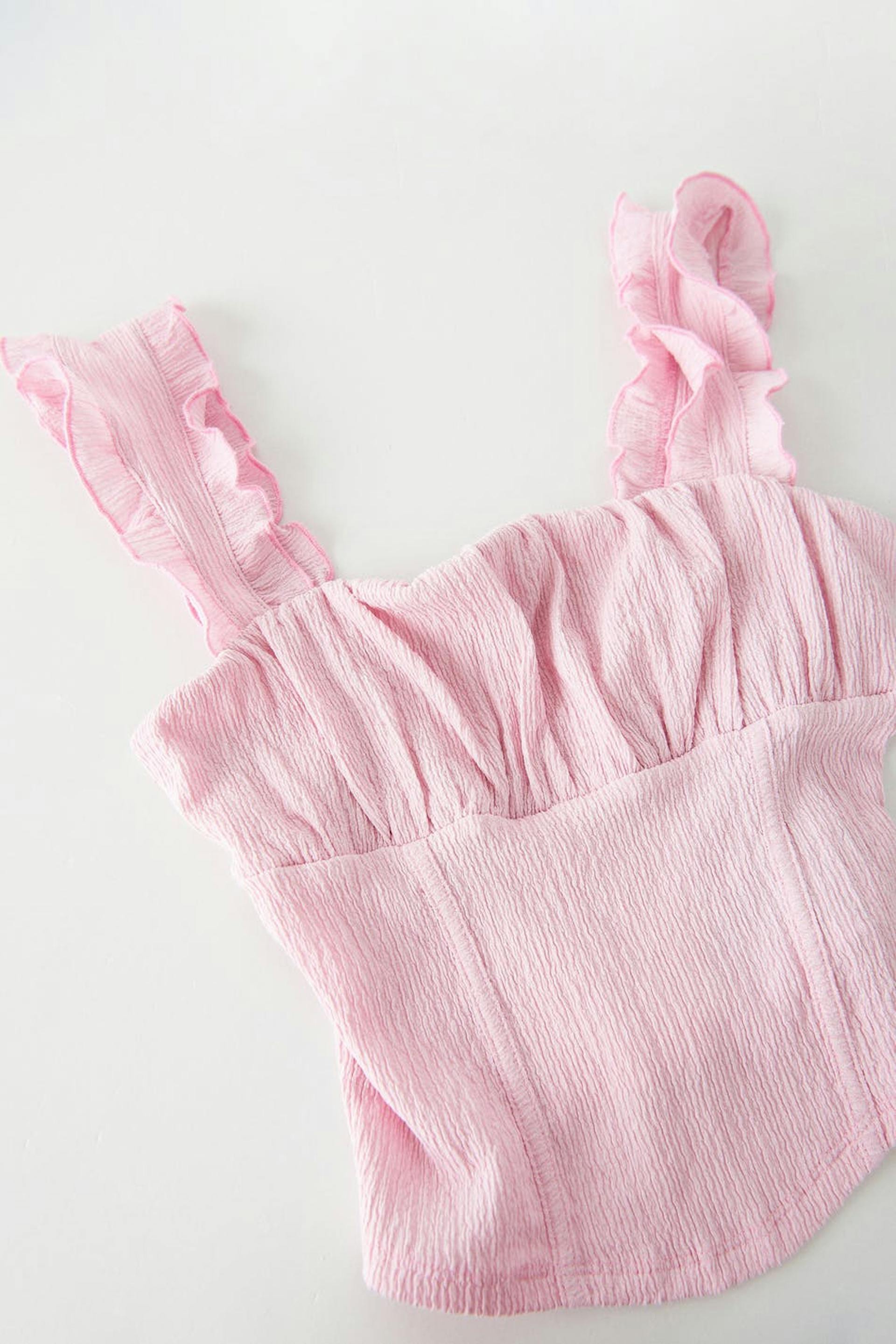 Sleeveless top with ruched bust. The top is pink and has wide shoulder straps with elastic and frills. It has fitted fit and a corsetlike detail at the waist.