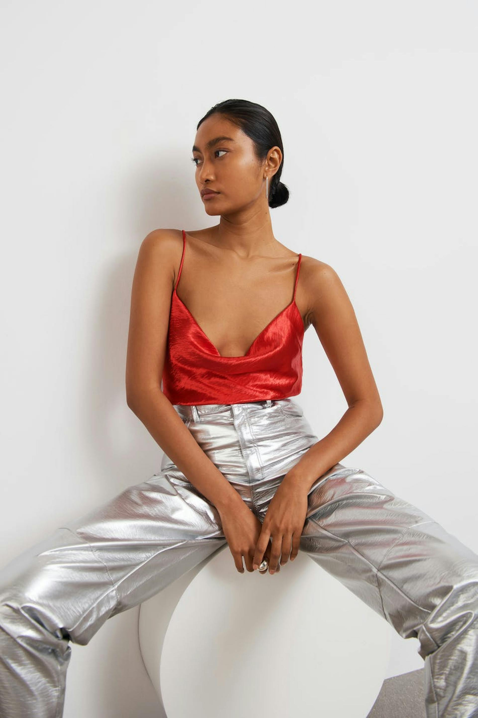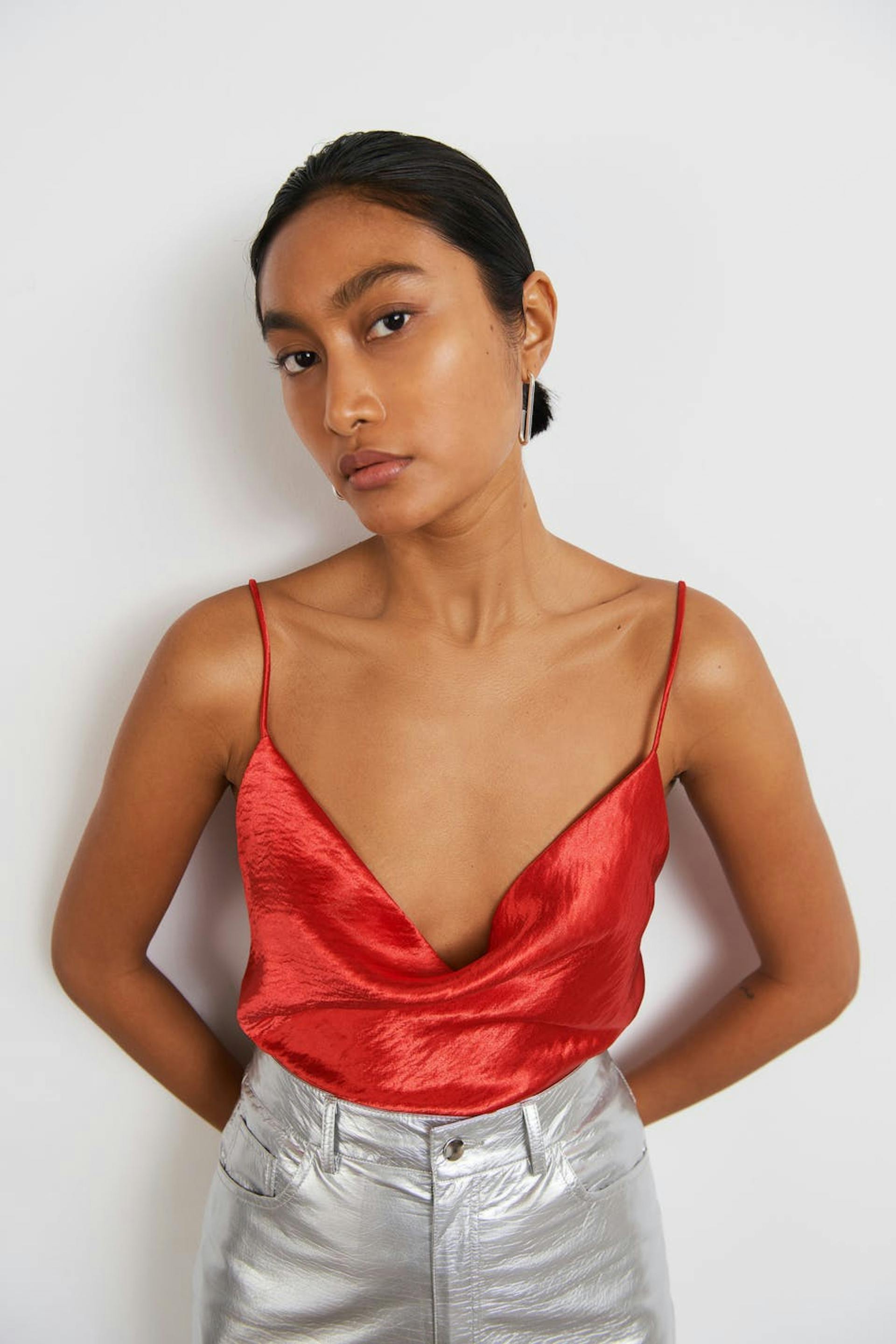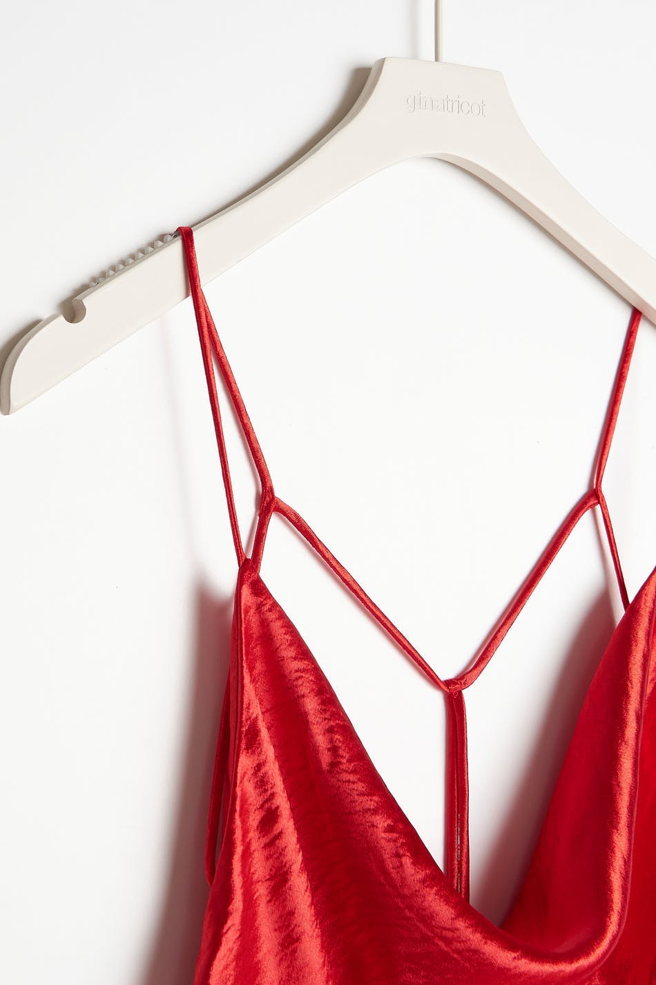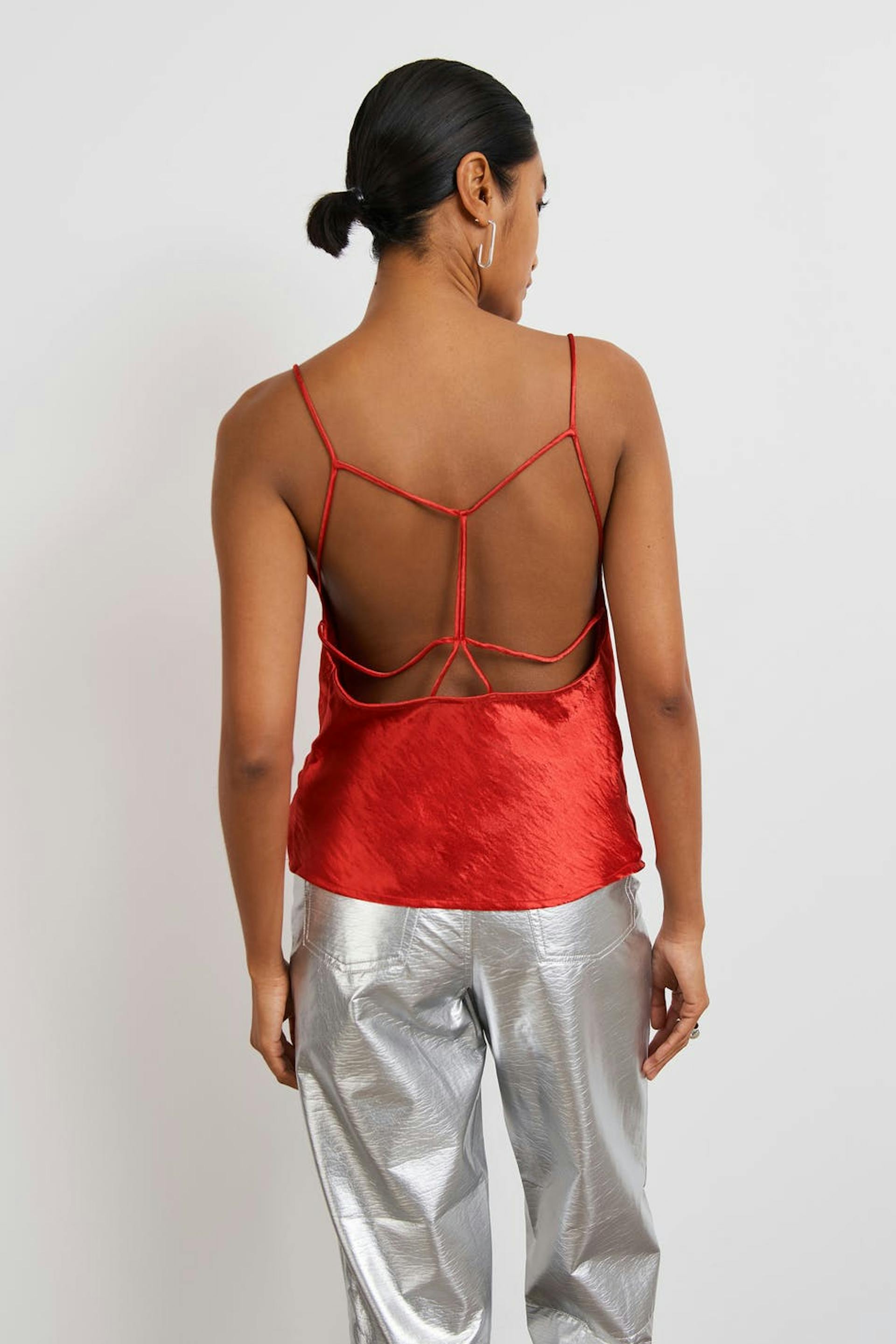 Top with an open back. The top is perfect for the party and red and has thin, criss crossed shoulder straps in the back. It has a loose fit at the front.