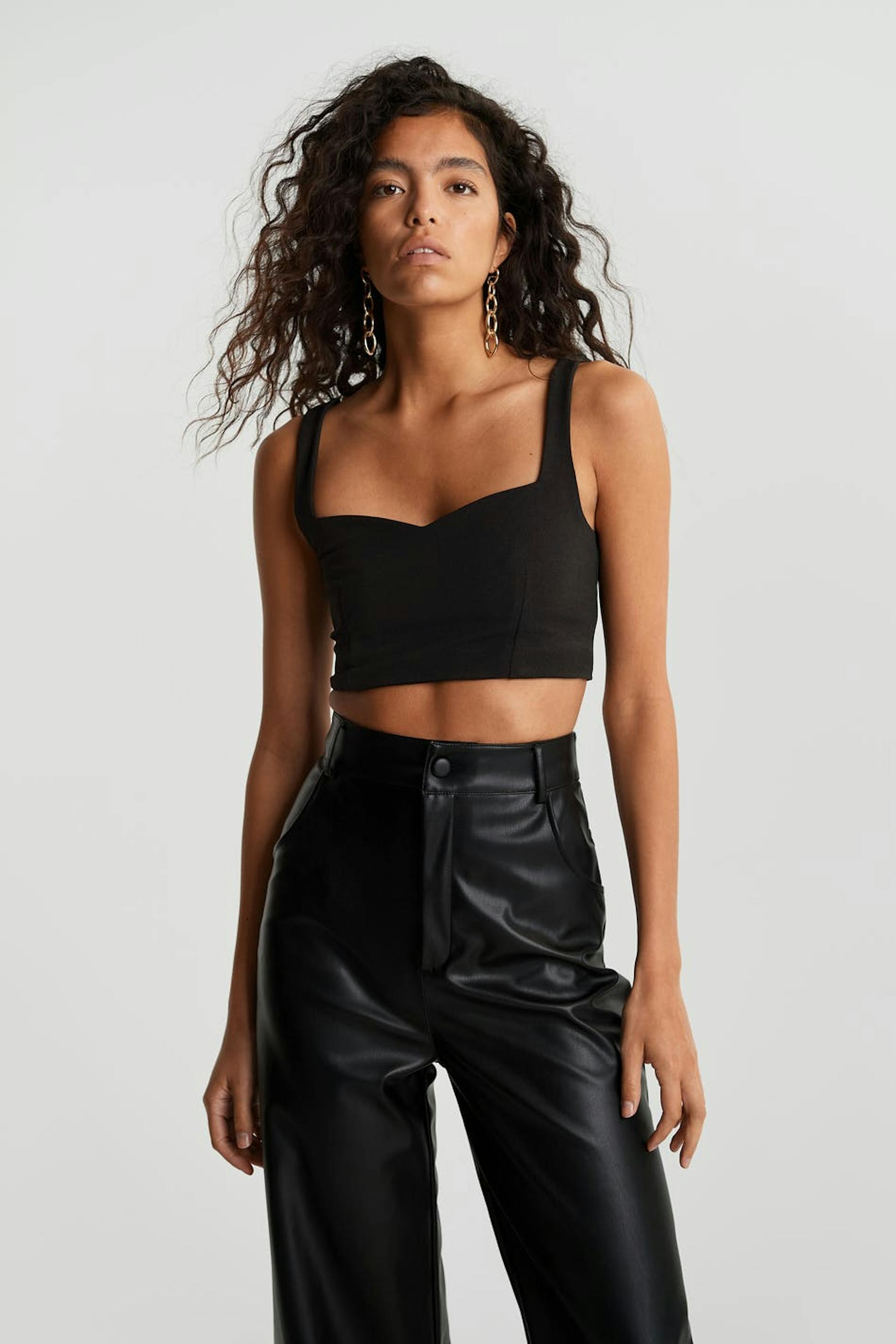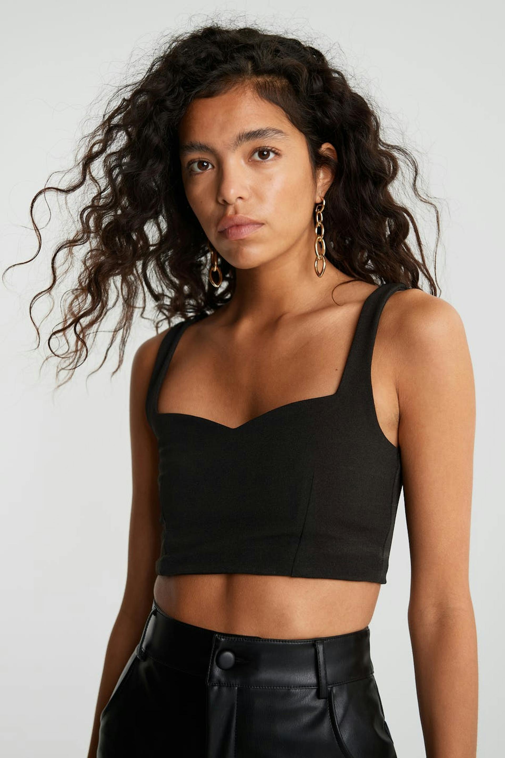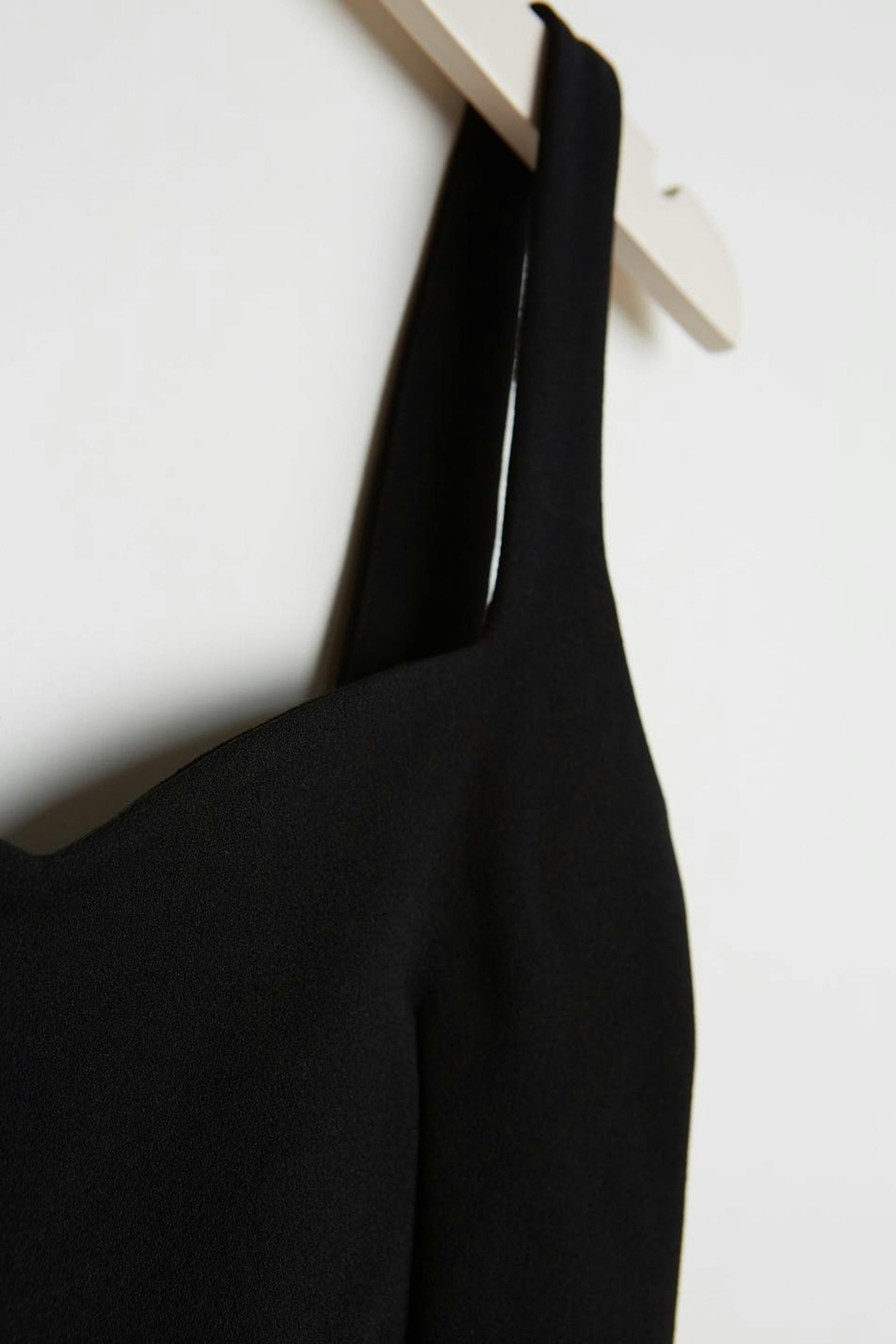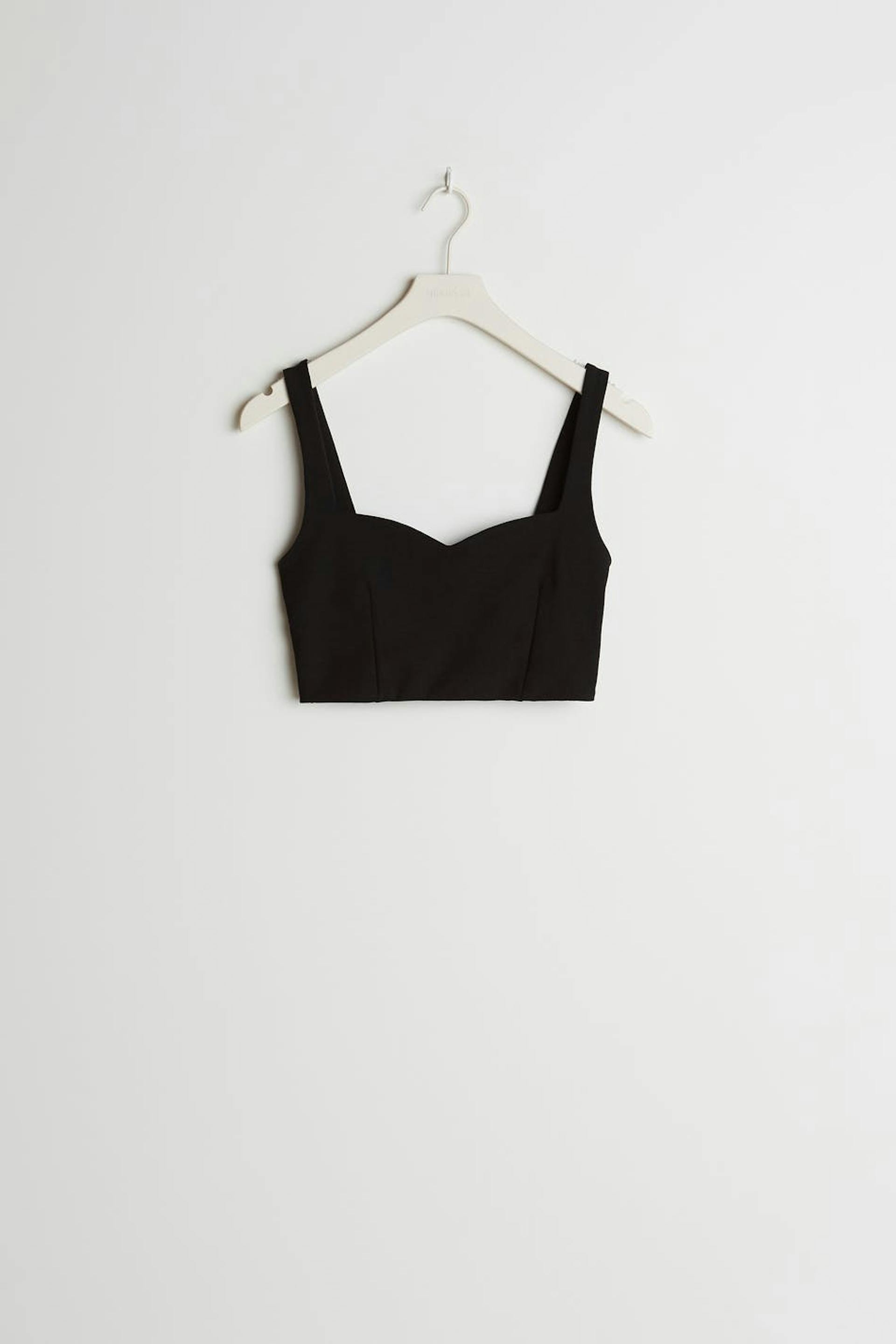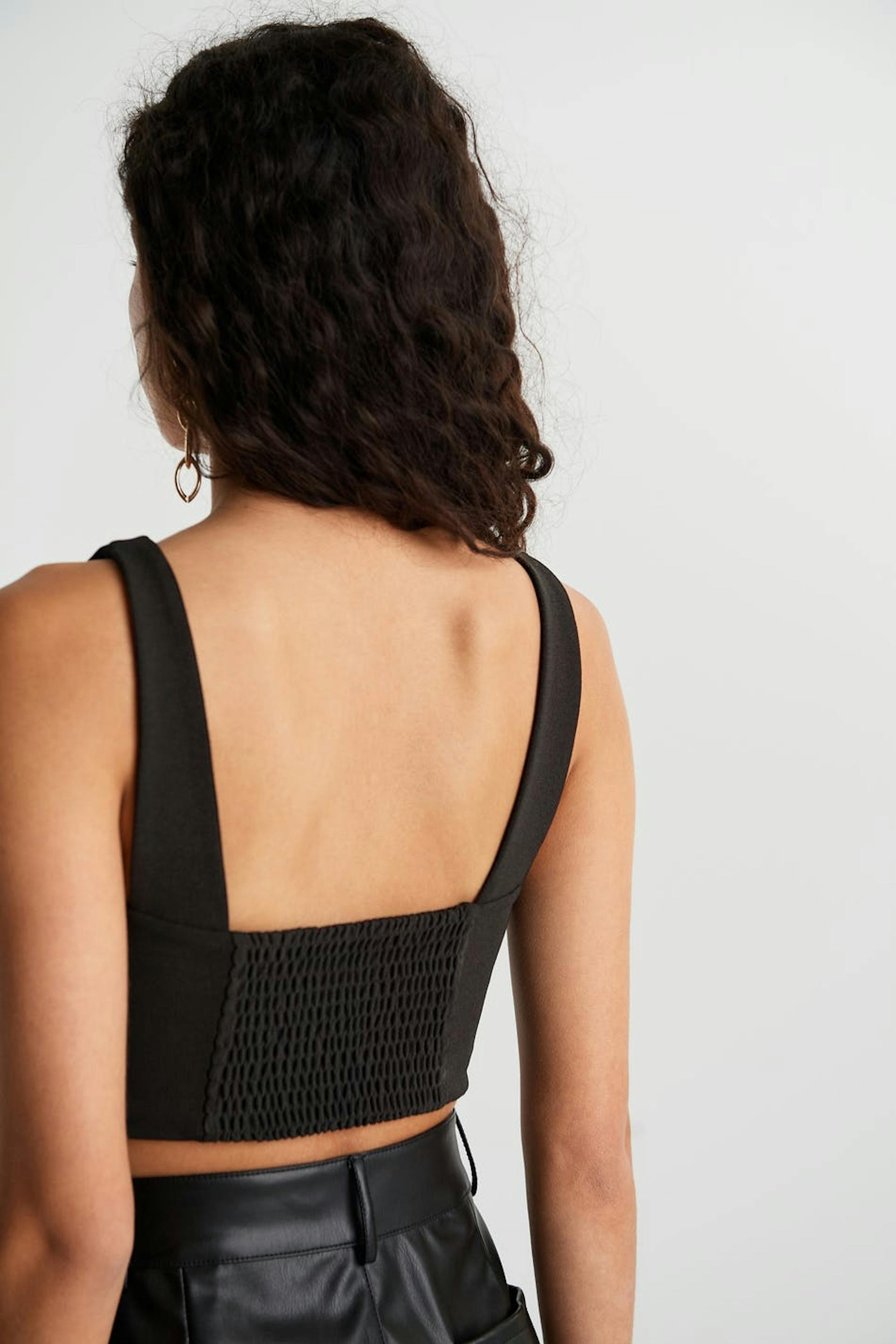 Short tank with a sweetheart neckline. The tank is perfect for the party, black and sleeveless. It has a smocking in the back and seam details down the front.