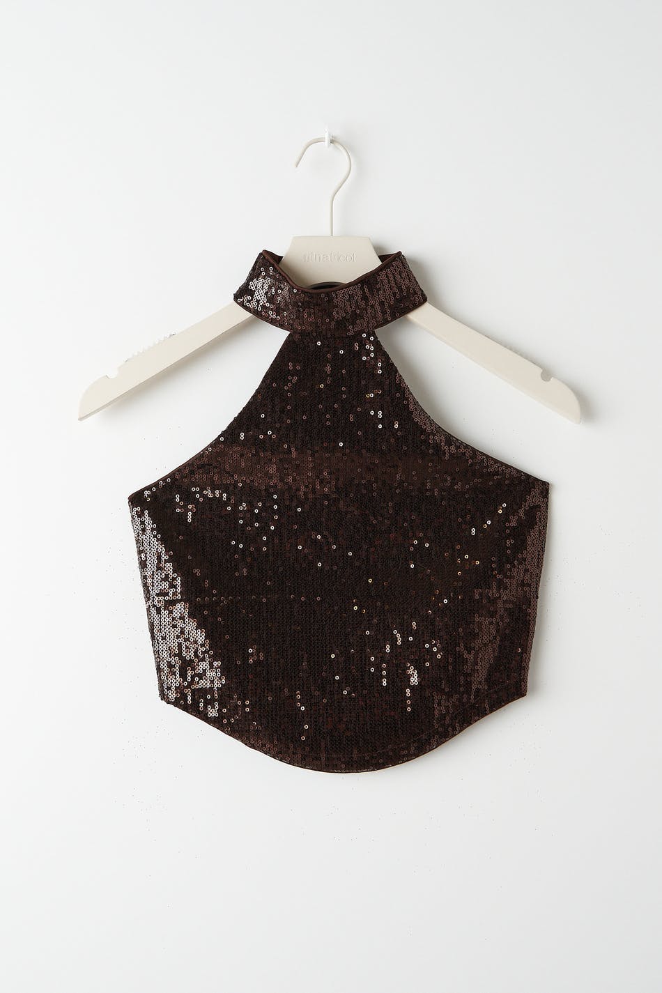 Sequin top with open back. The sequin top is brown and has halterneck design. It has button placket at neck and a cropped length.