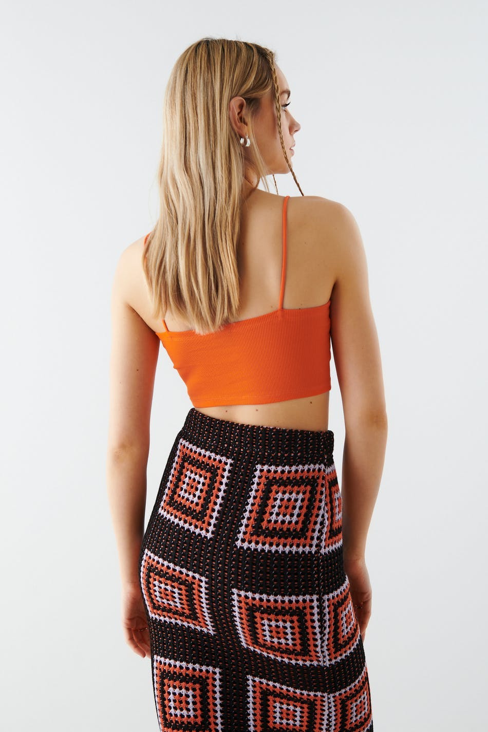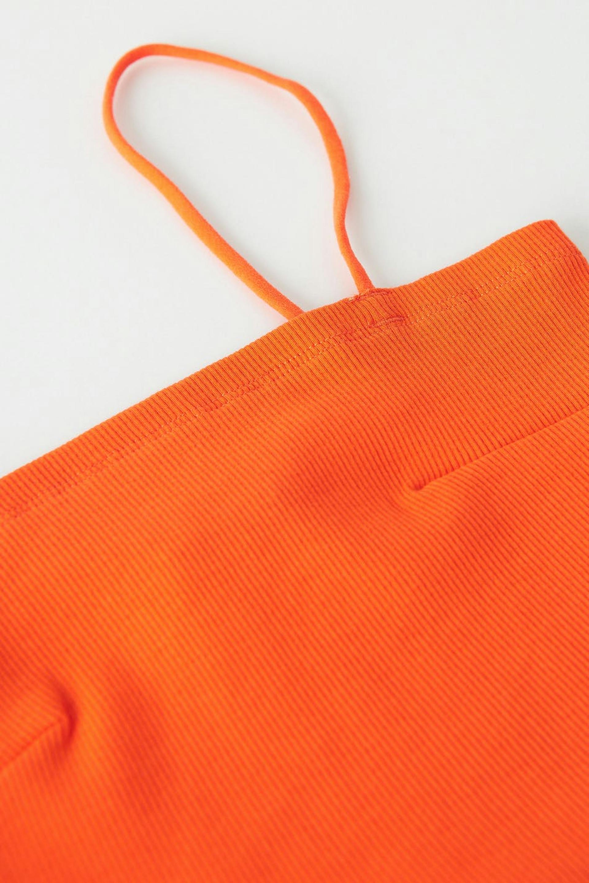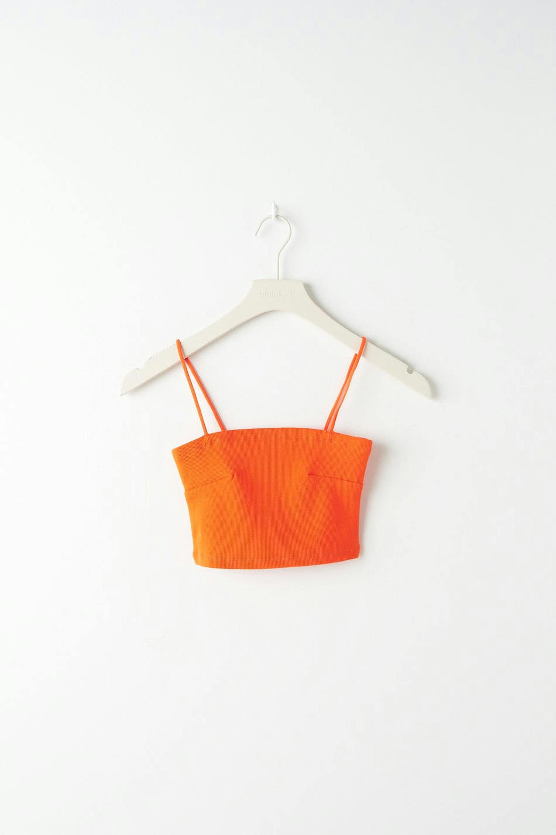Cropped tank in organic cotton with thin shoulder straps. The tank is orange and has a ribbed quality in jersey.