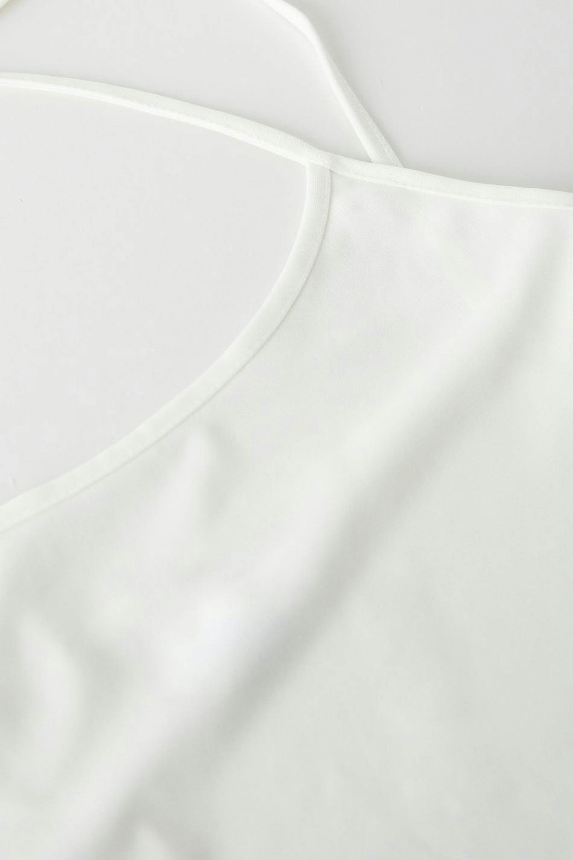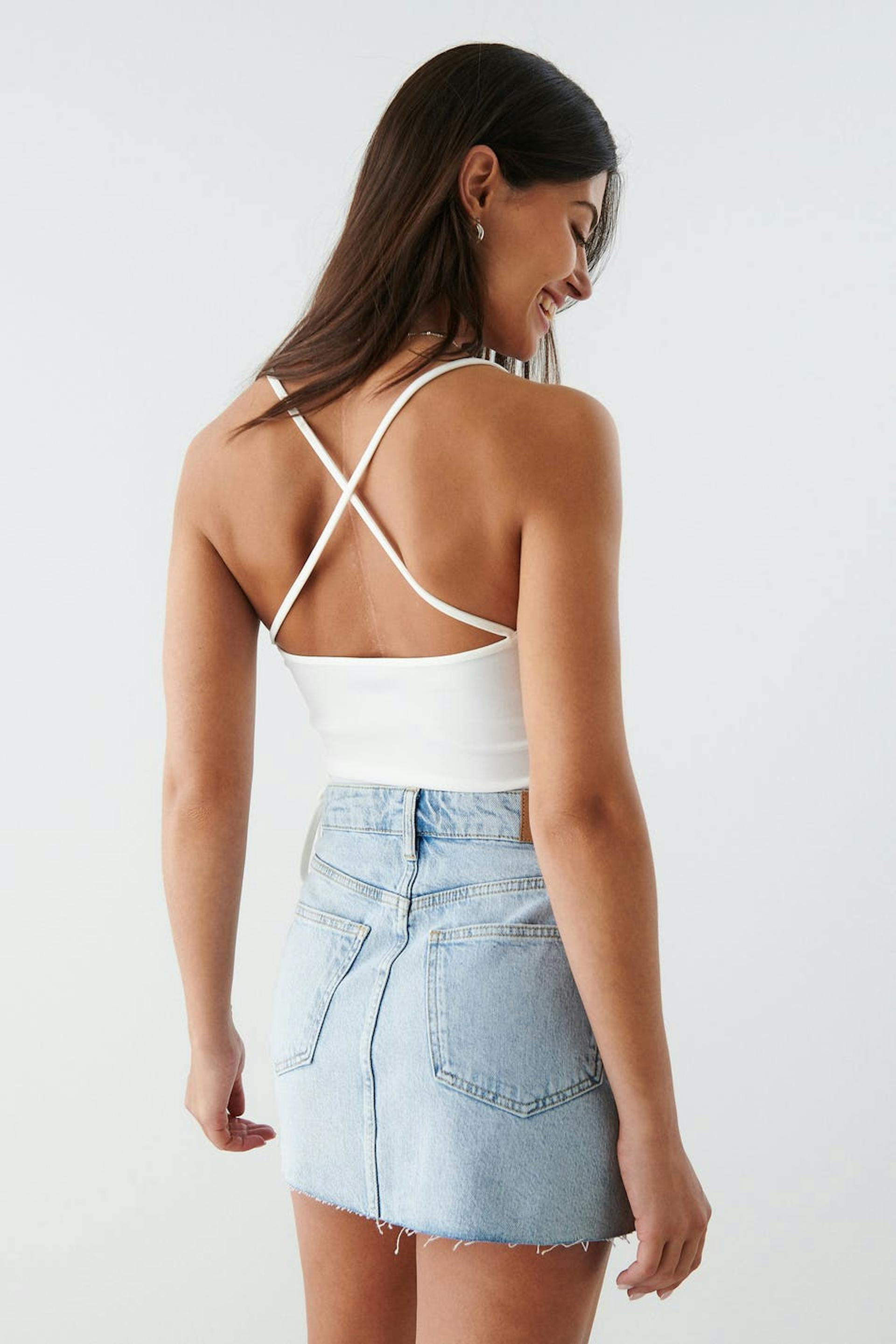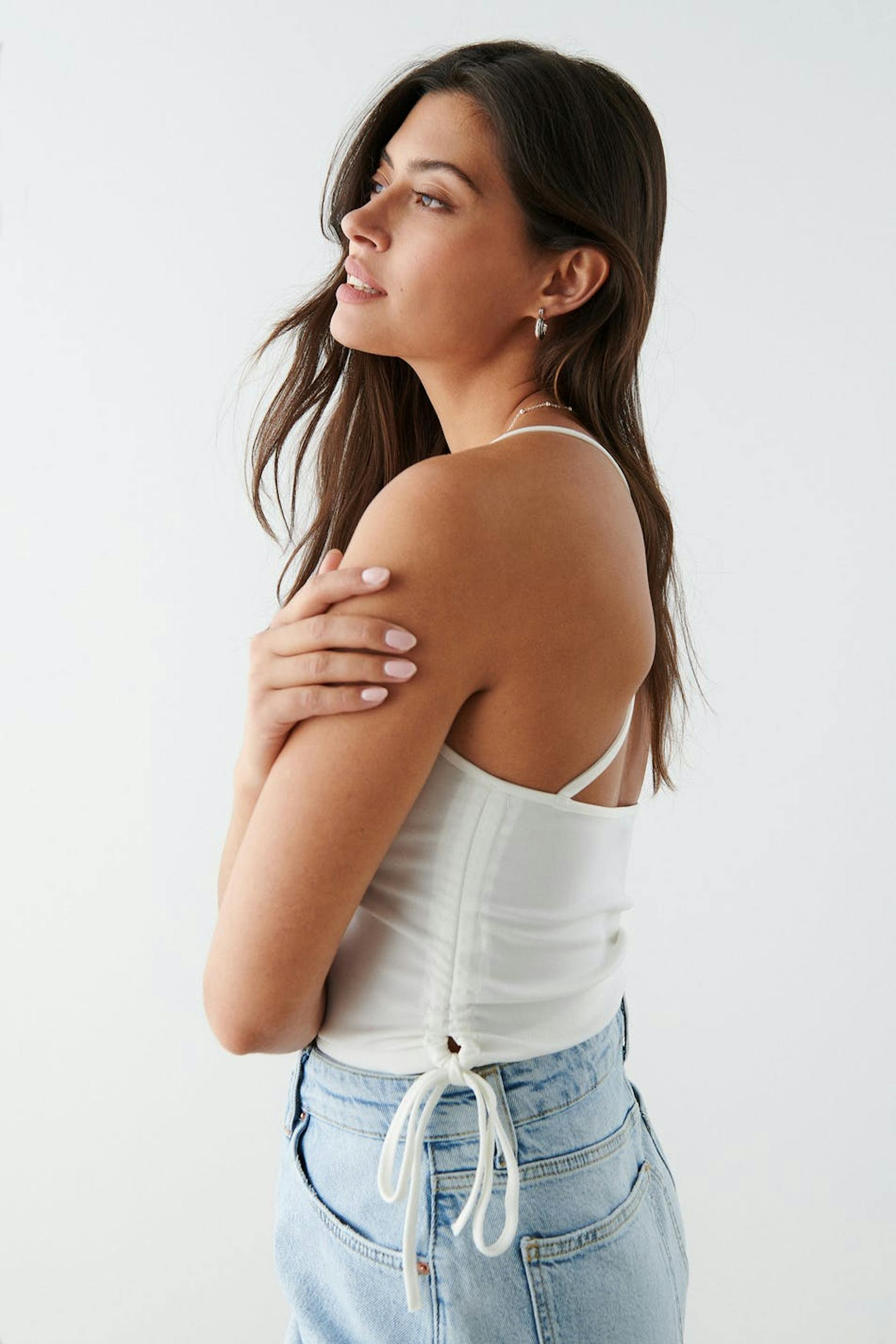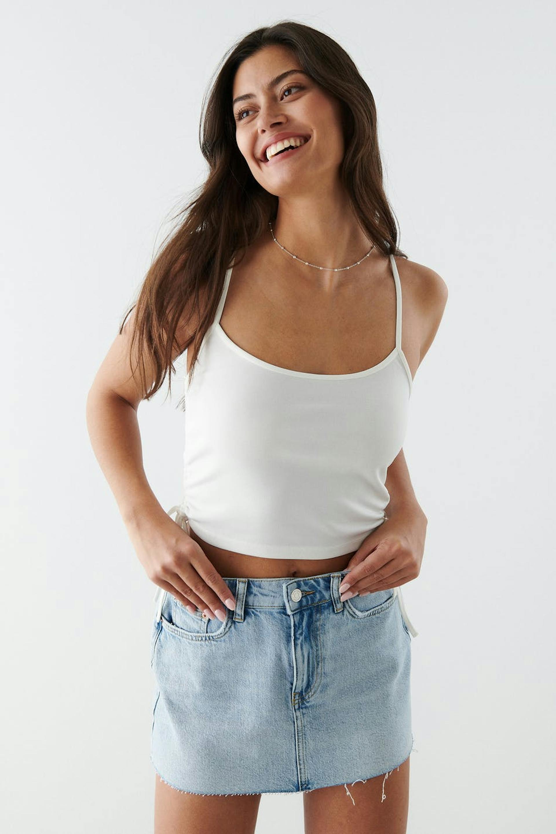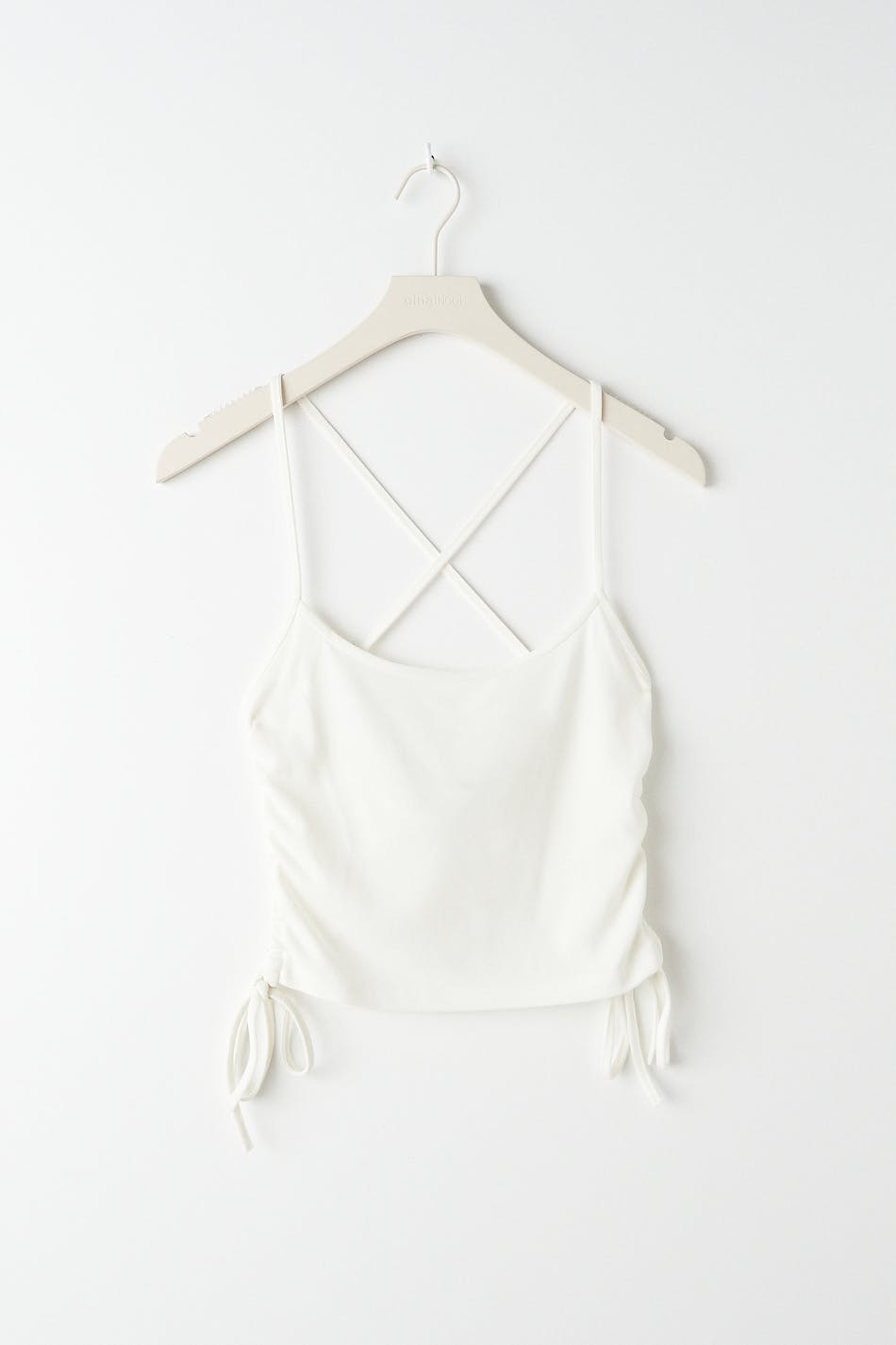 Cropped tank with thin shoulder straps crossing at the back. The tank is white and has ruching in the sides with self-tie drawstrings at hem.