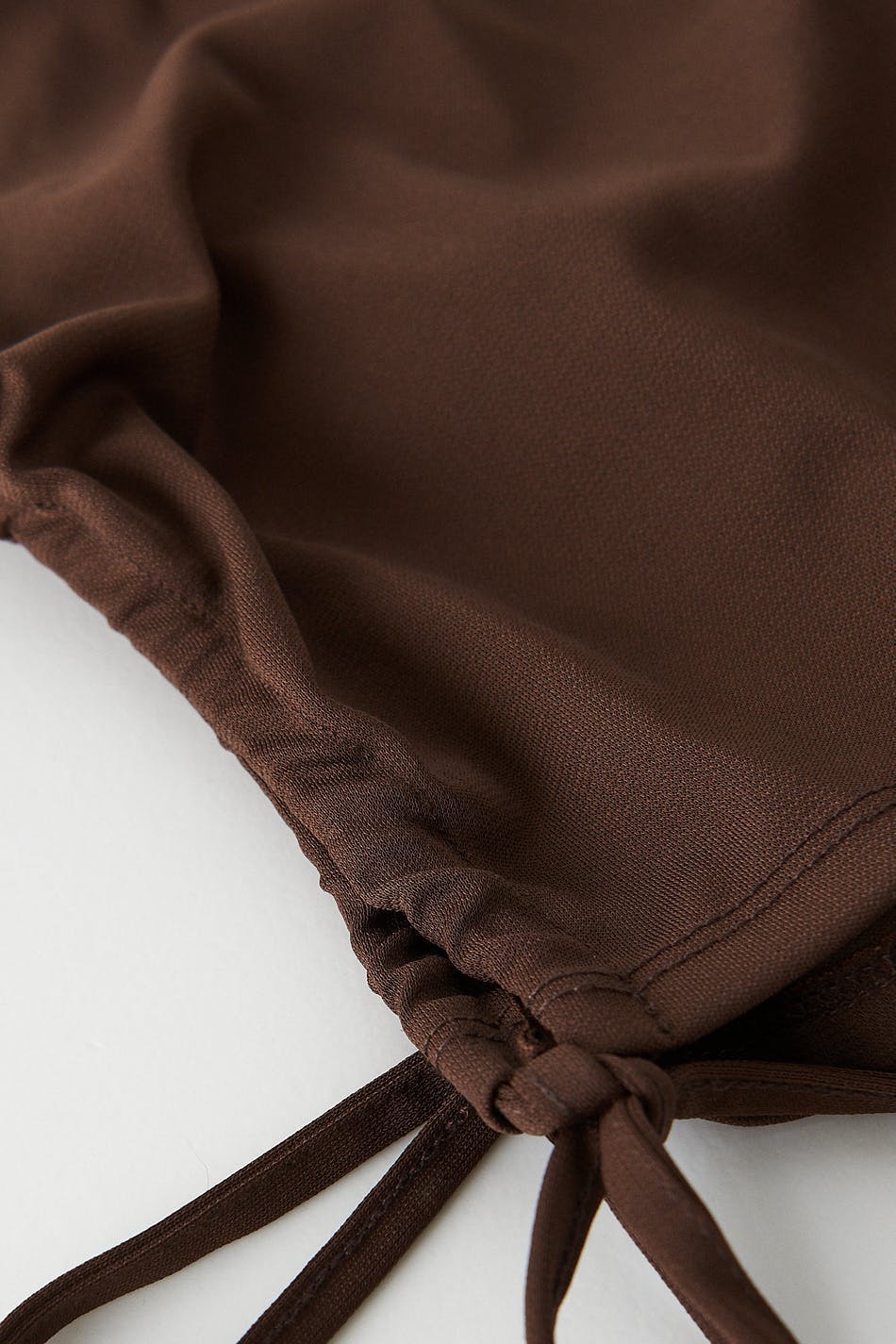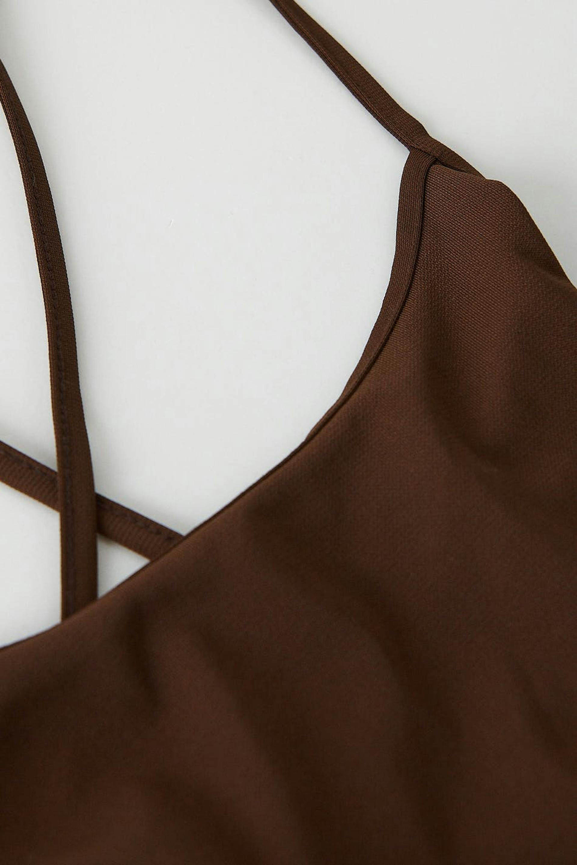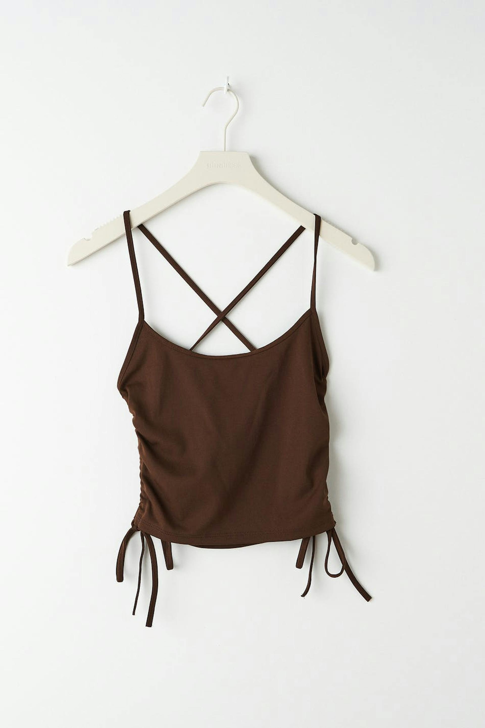 Cropped tank in recycled polyester with thin shoulder straps crossing at the back. The tank is brown and has ruching in the sides with self-tie drawstrings at hem.