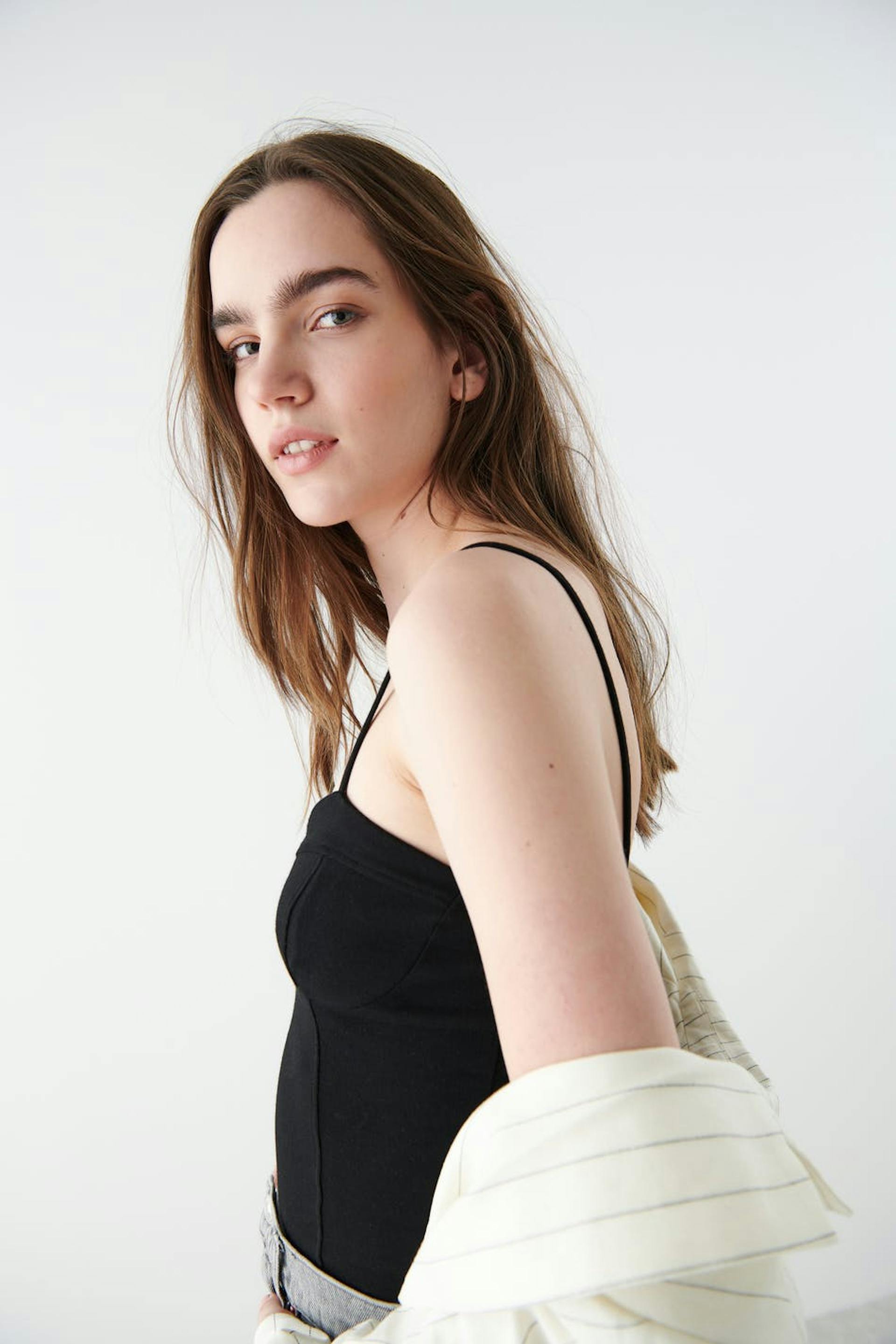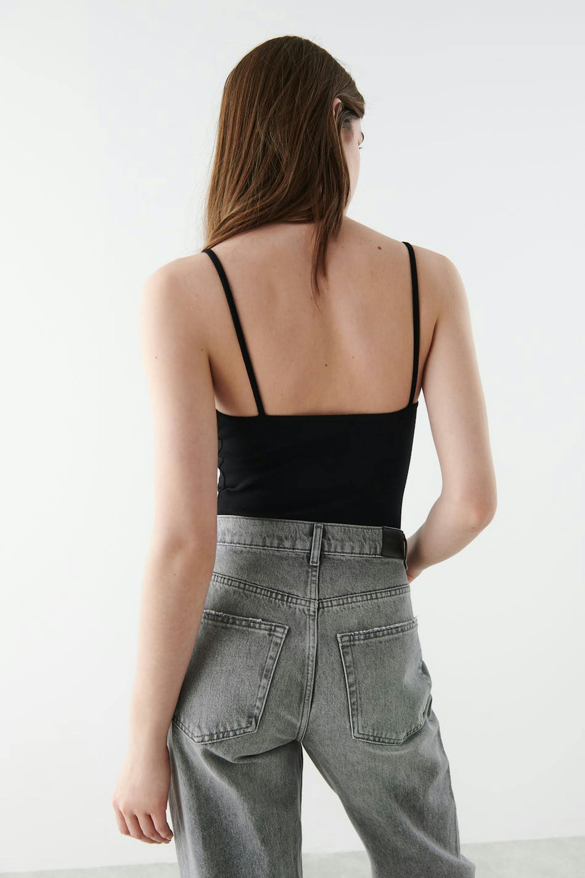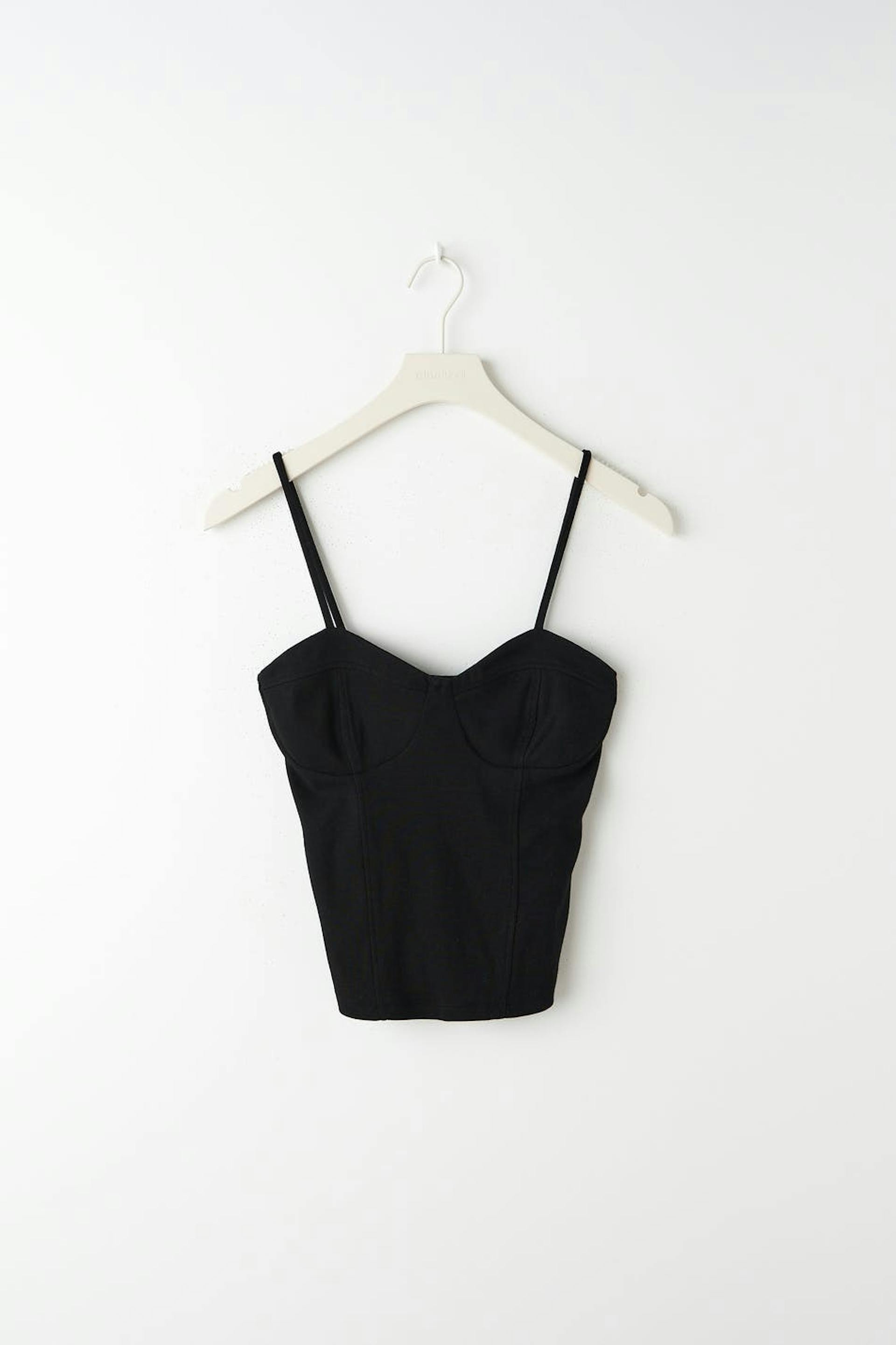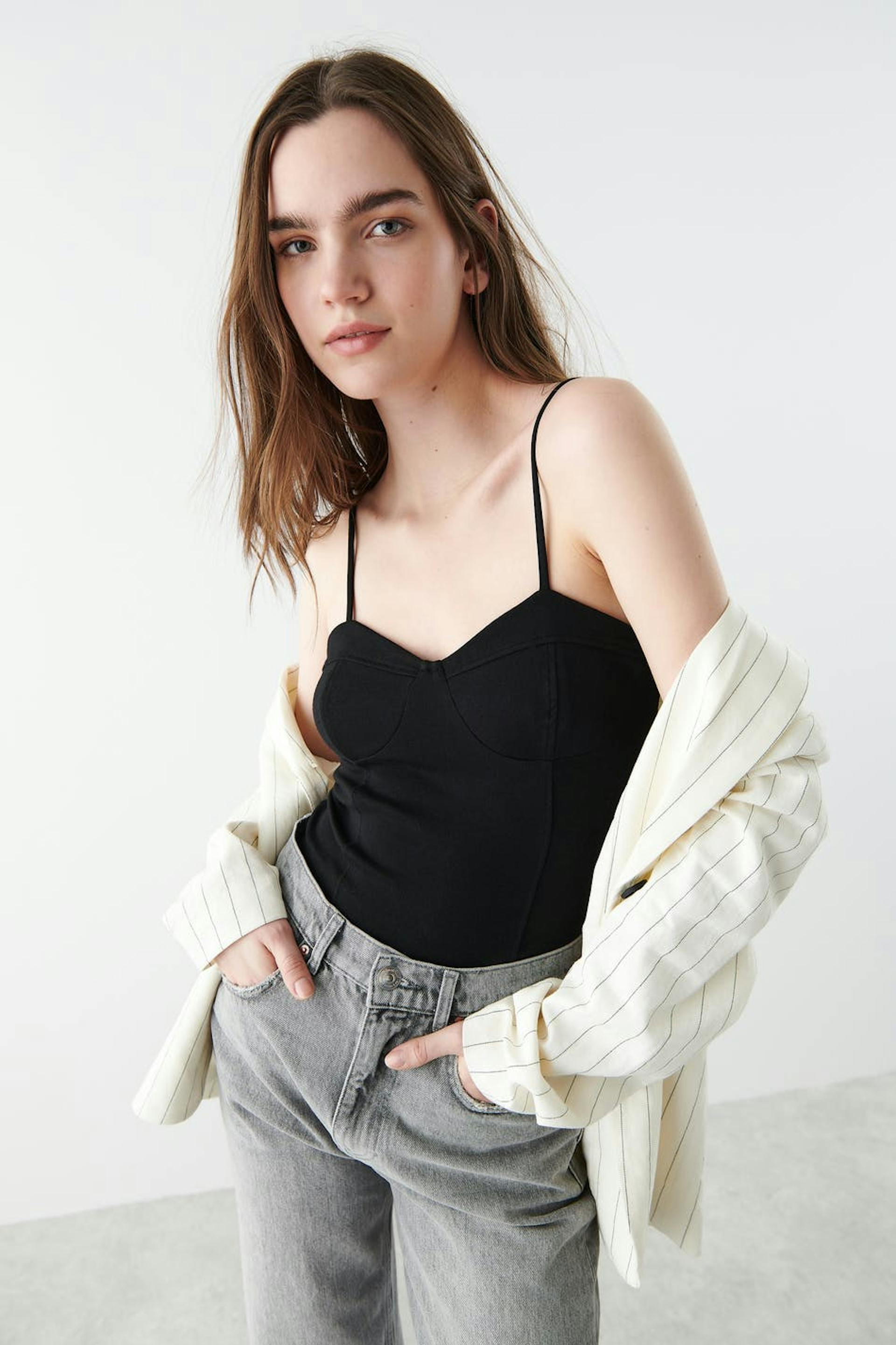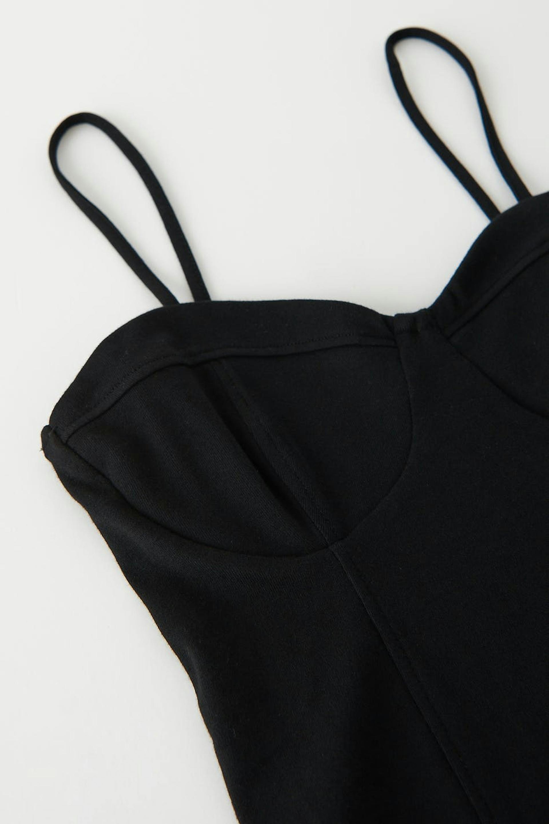 Bustier with fitted fit. The bustier is black and has thin shoulder straps. It is made of jersey and has decorative seam details below the bust.