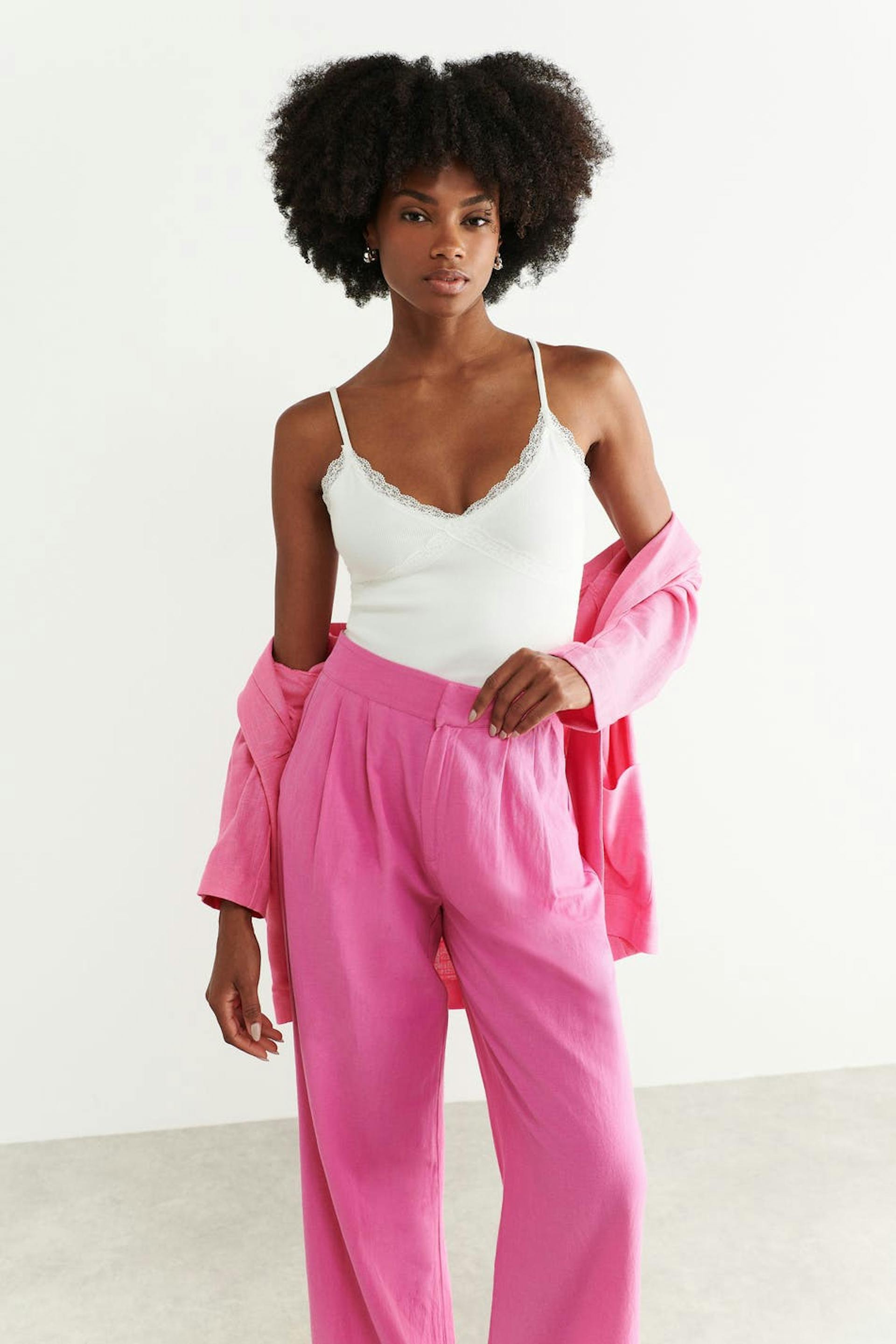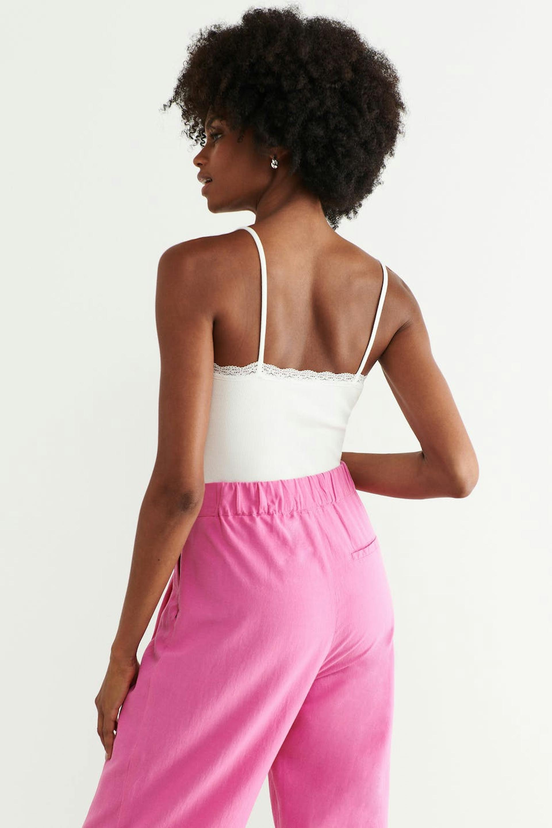 Cropped tank in jersey with a fitted fit. The tank is white and has a curled hemline.