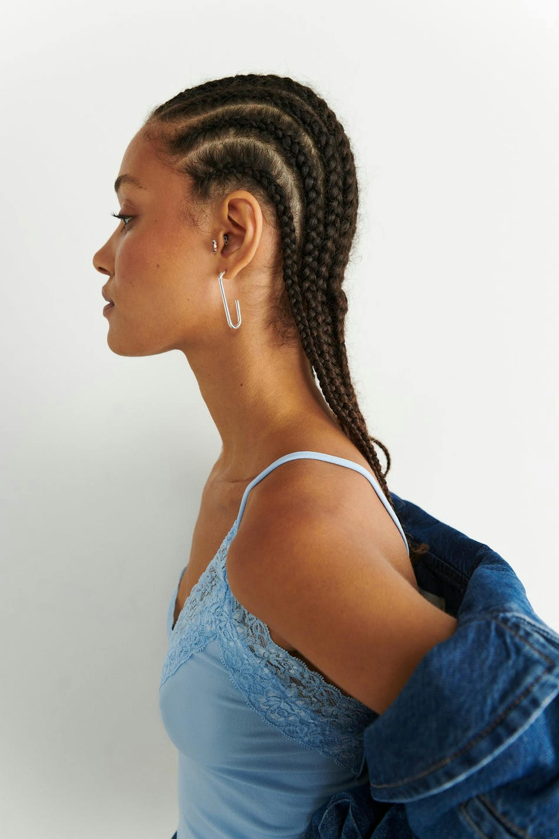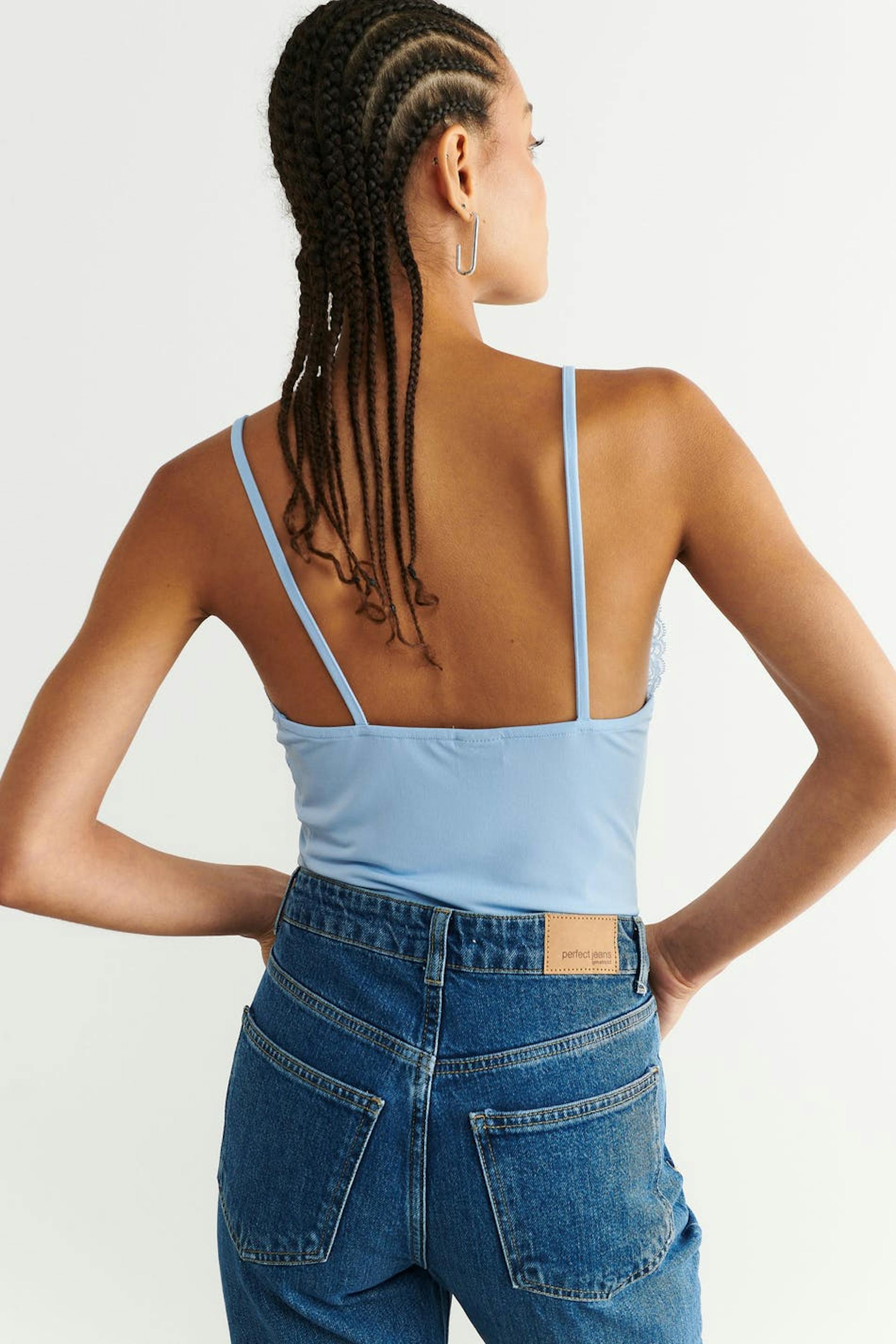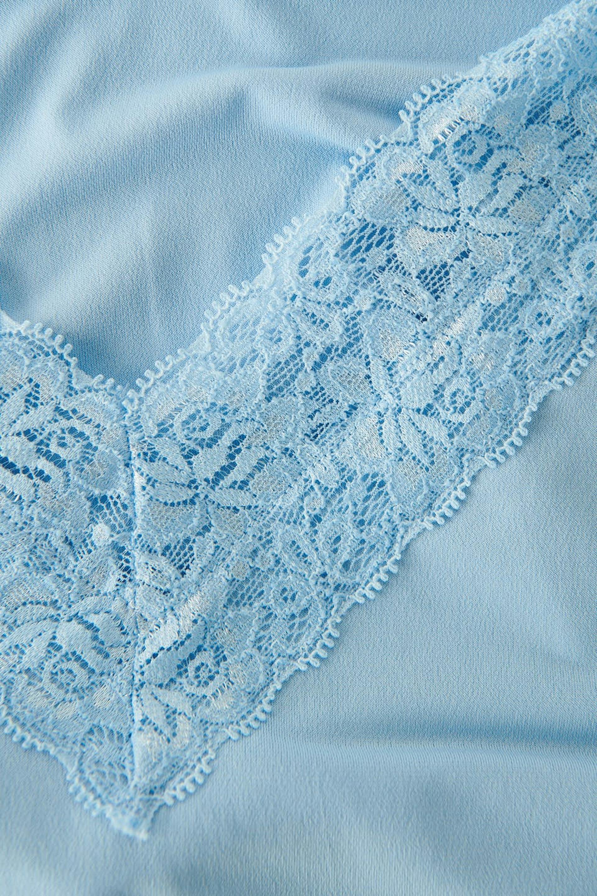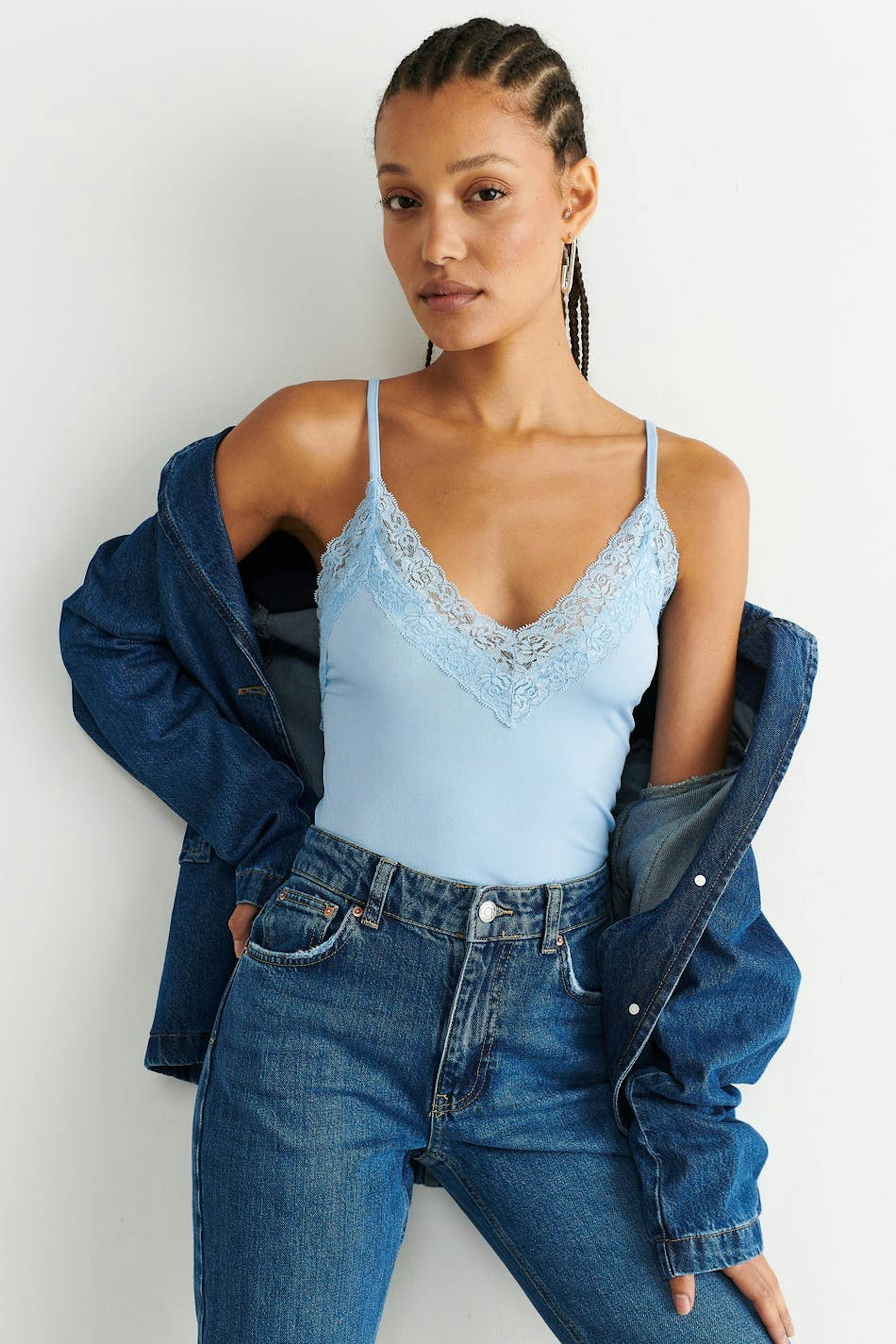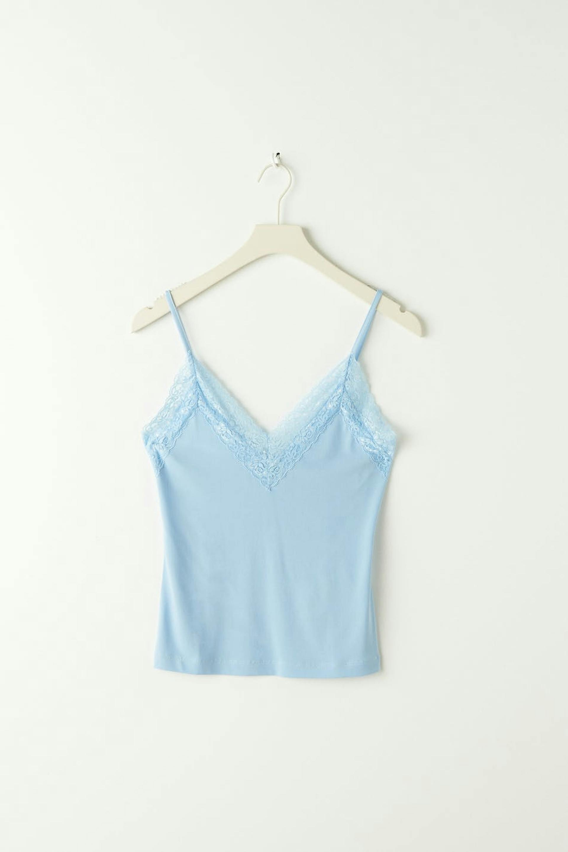 Tank in jersey with lace details. The tank is blue and has thin shoulder straps.