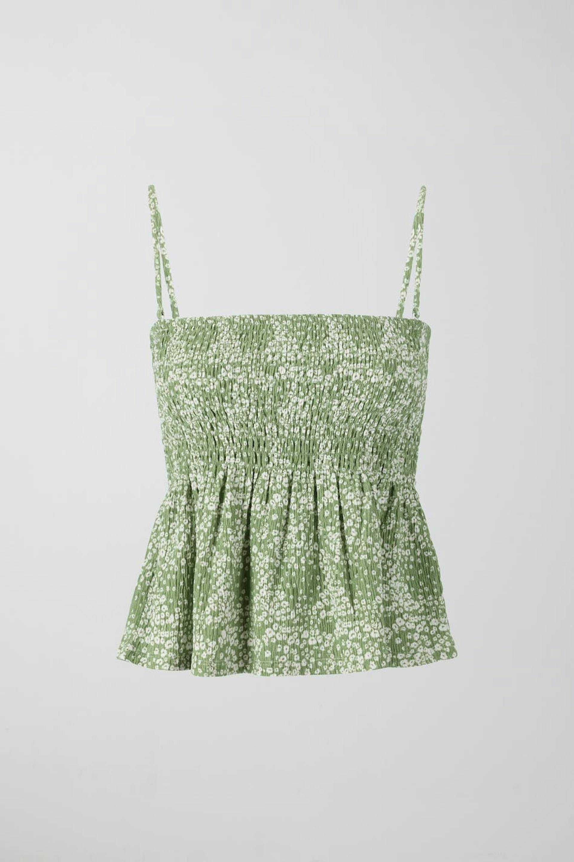 Cropped top with a regular fit. The top is green and has smocking on the chest. It has thin, removable straps and a flounce at the hem.