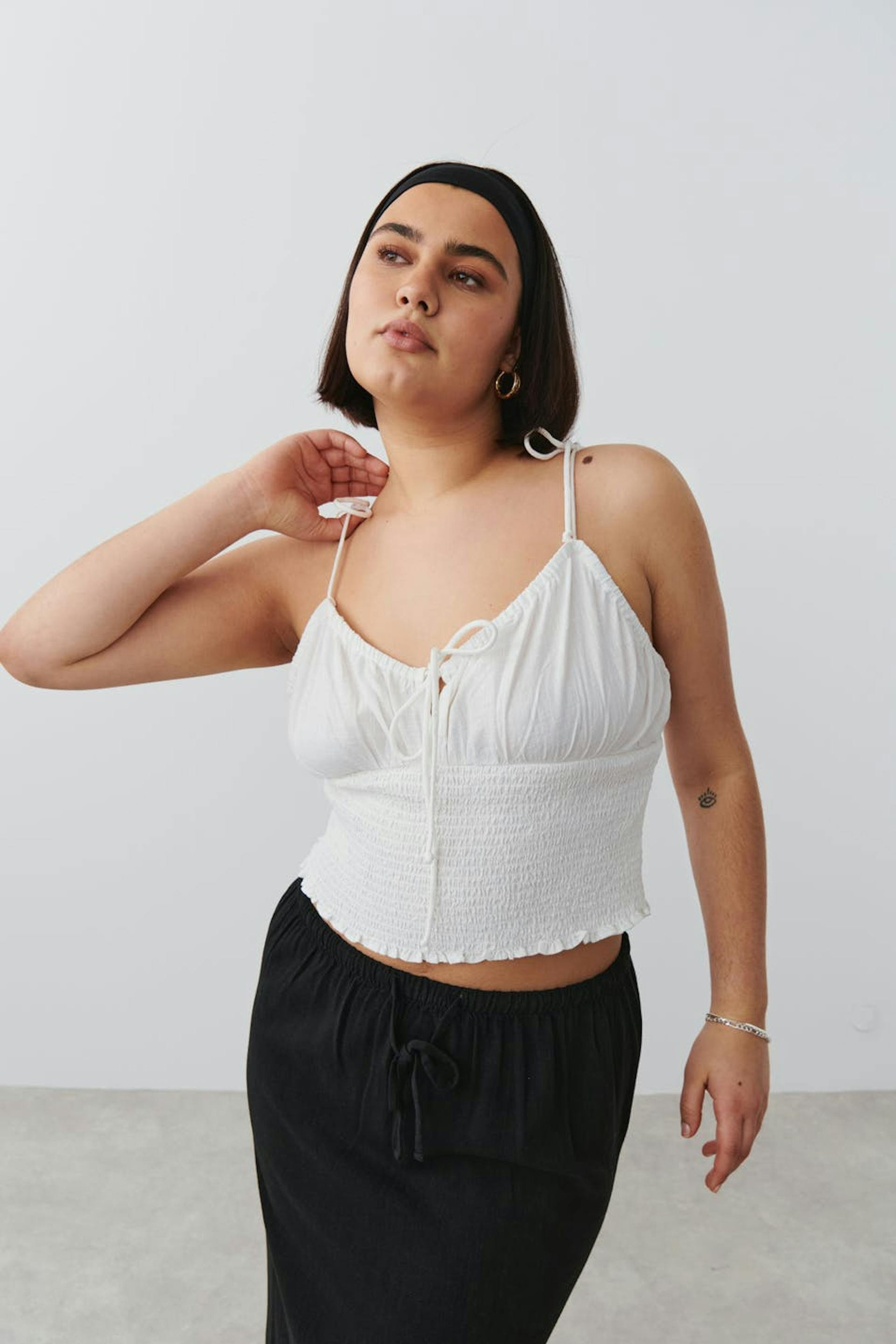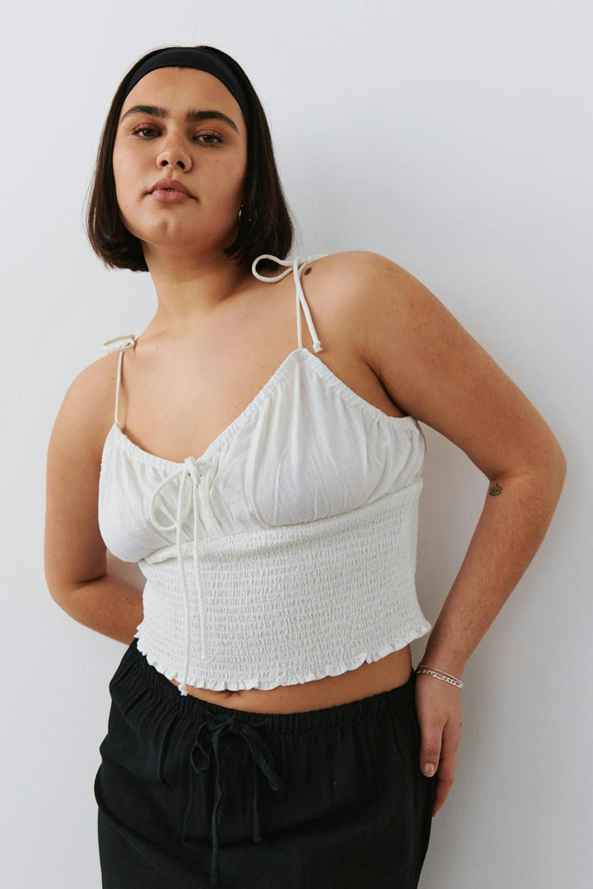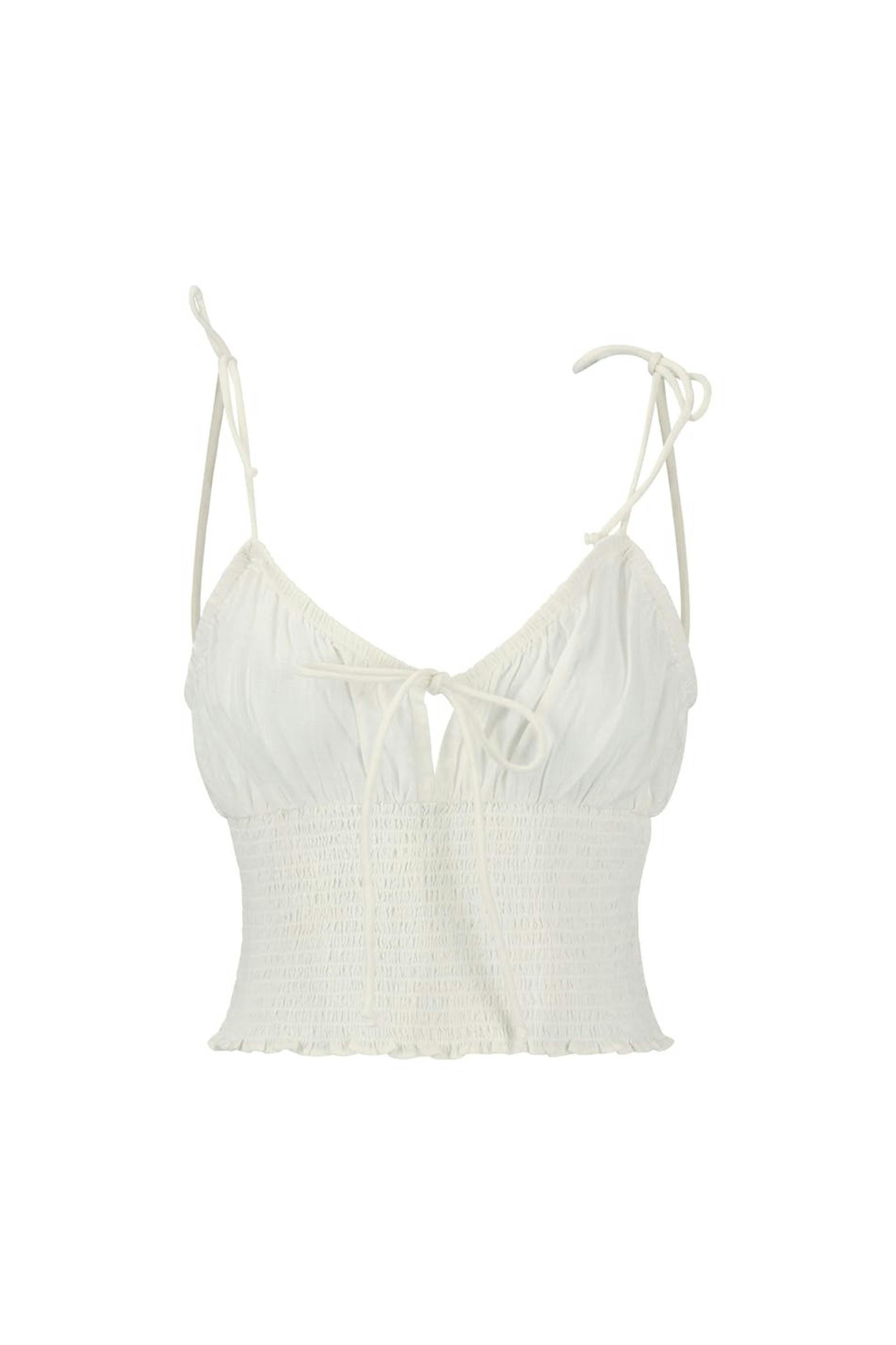 Top with smocking at the waist. The top is white and has adjustable shoulder straps with self-tie. It has figure-hugging fit and knot detail at the front.