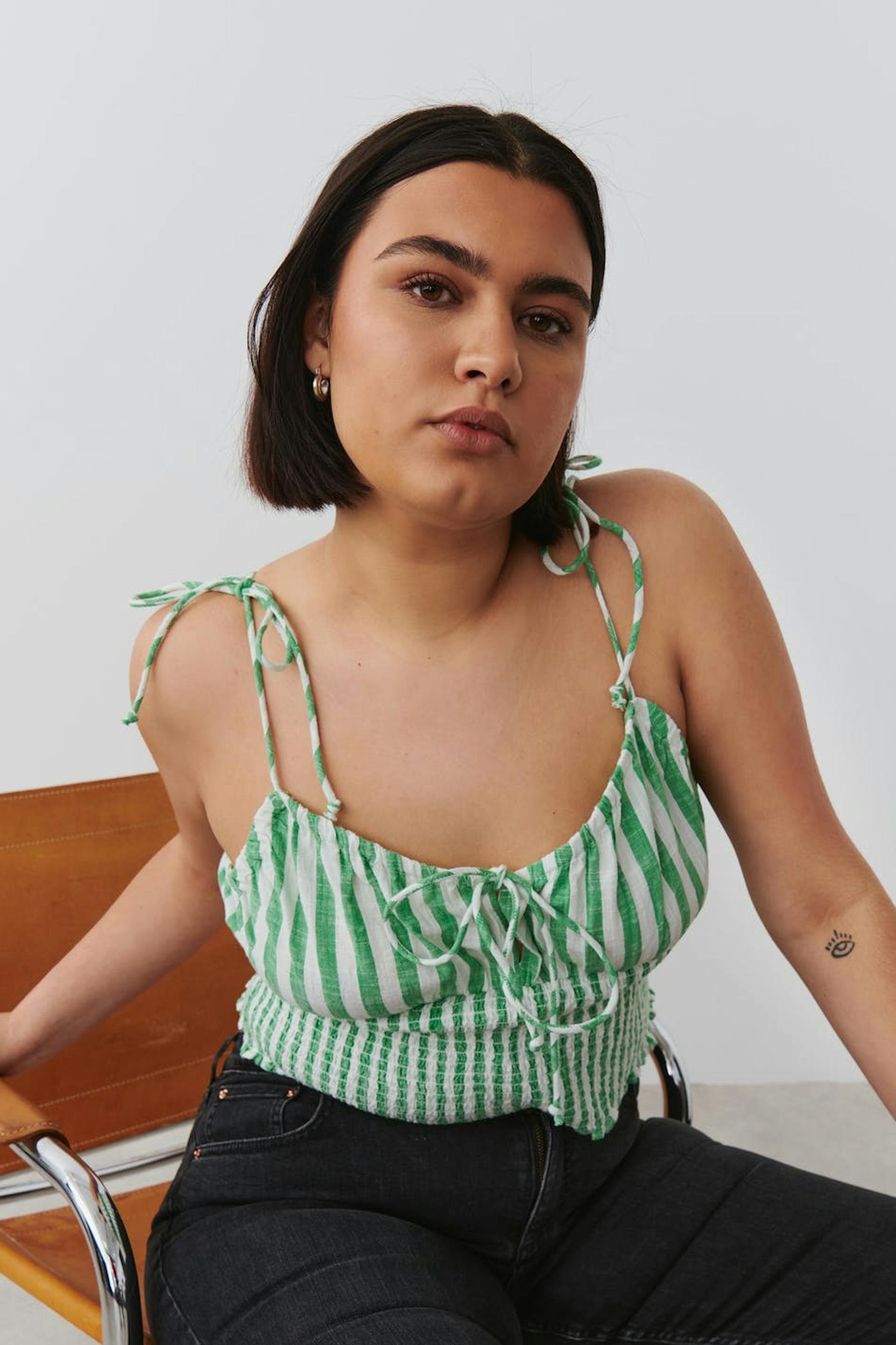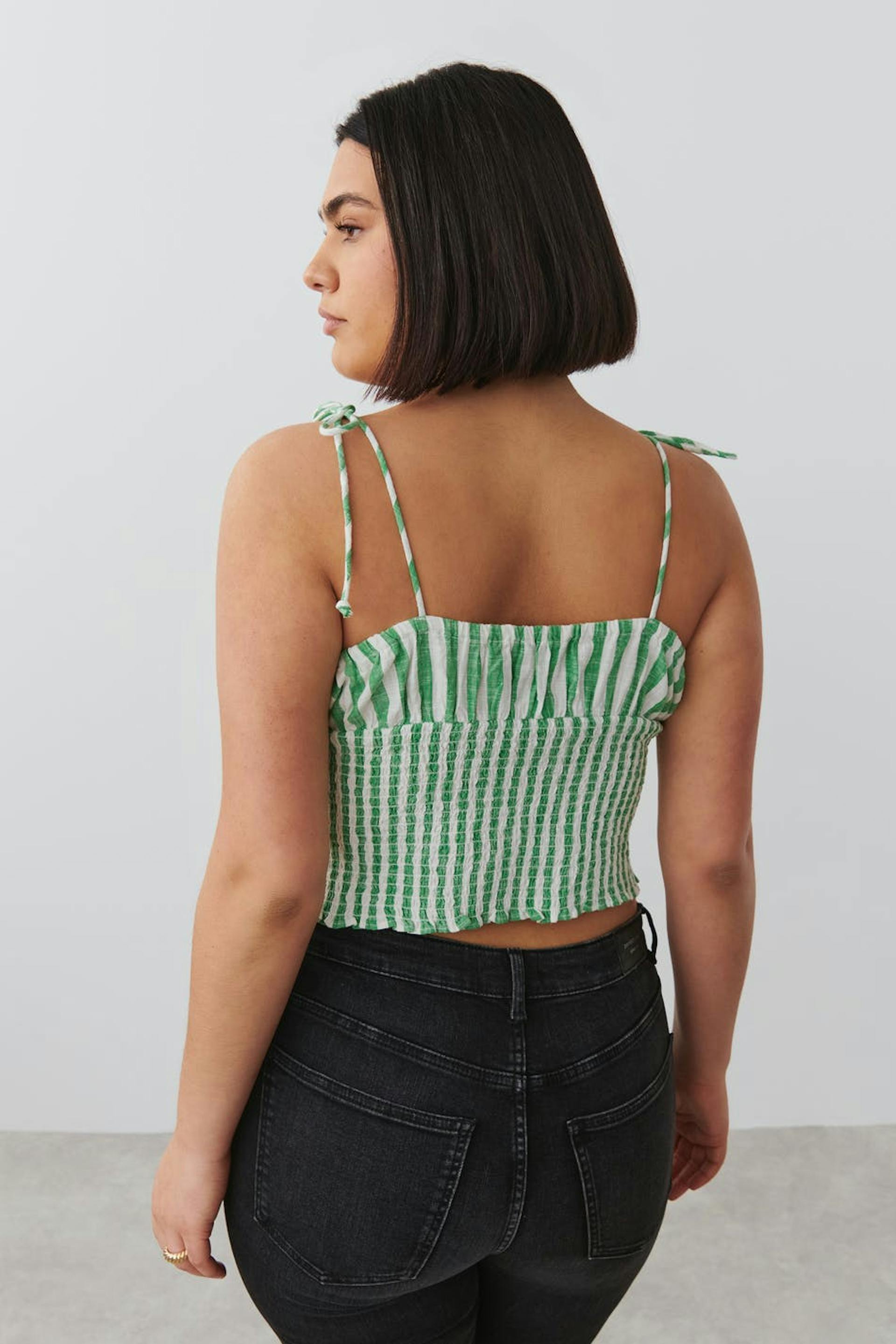 Top with smocking at the waist. The top is green and has adjustable shoulder straps with self-tie. It has figure-hugging fit and knot detail at the front.