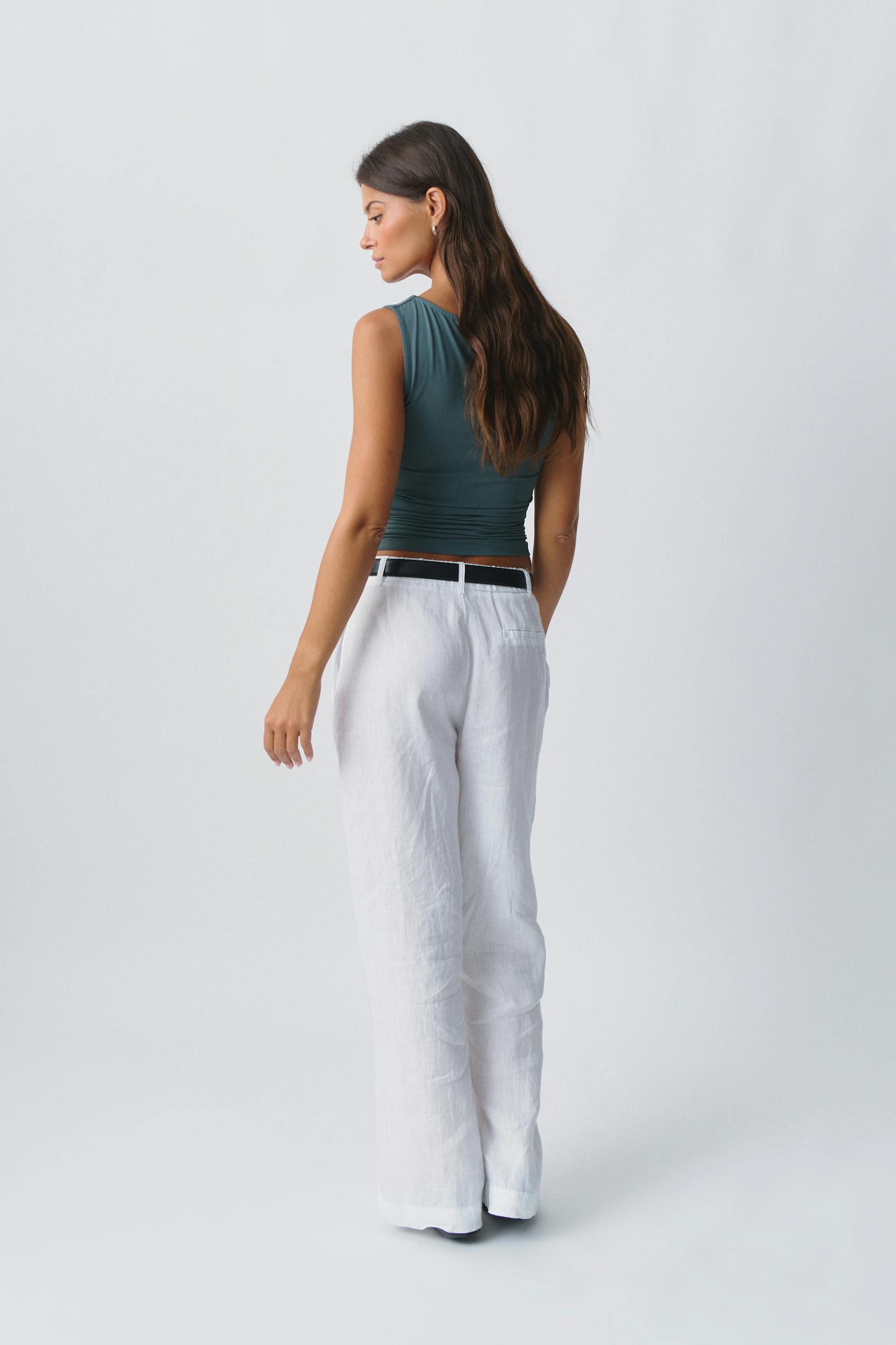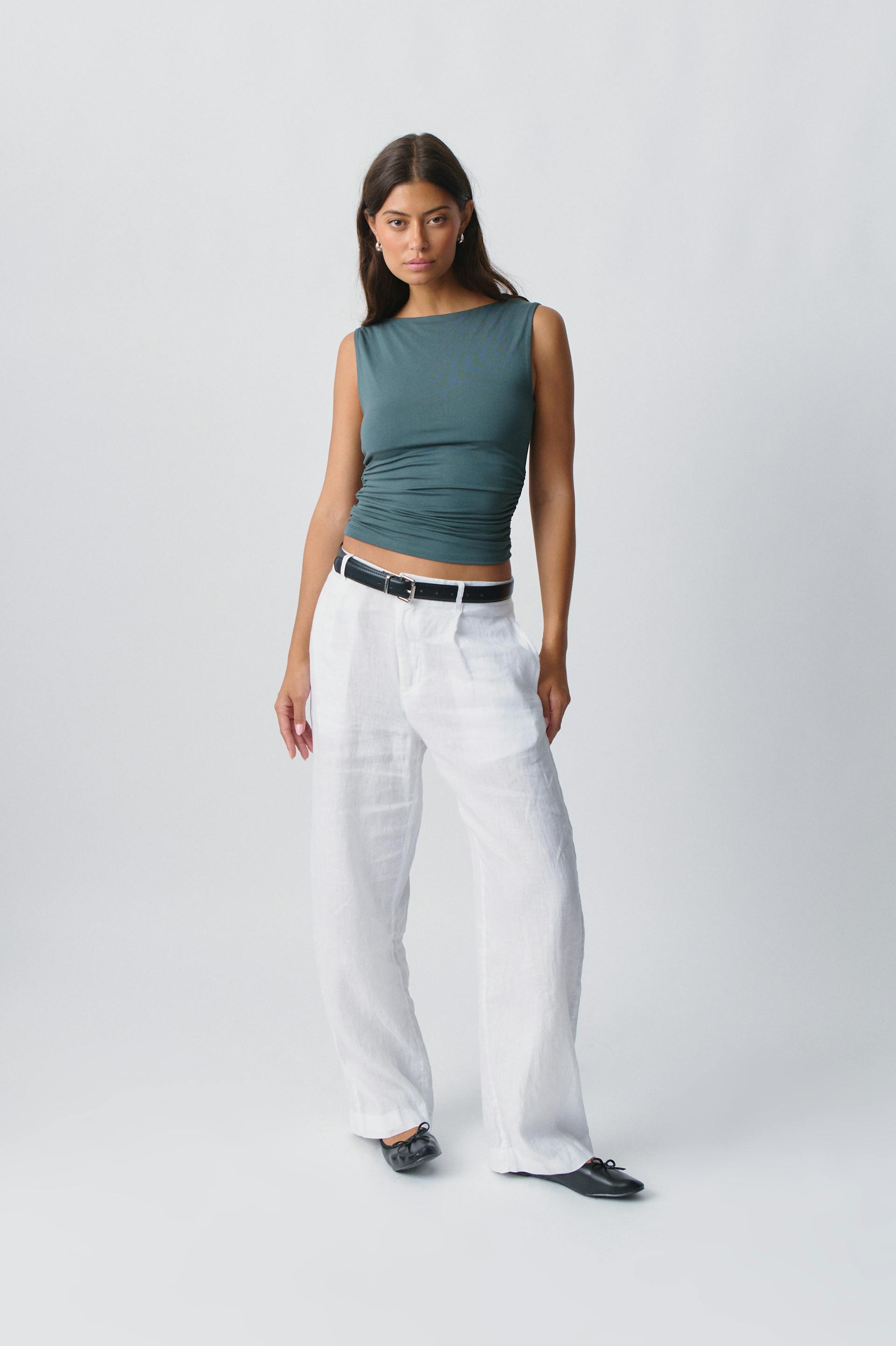 Soft touch – second skin comfort. Sleeveless top in soft viscose with ruching in the sides. The top is green and has boat neckline. It has figure-hugging fit and stretchy quality.