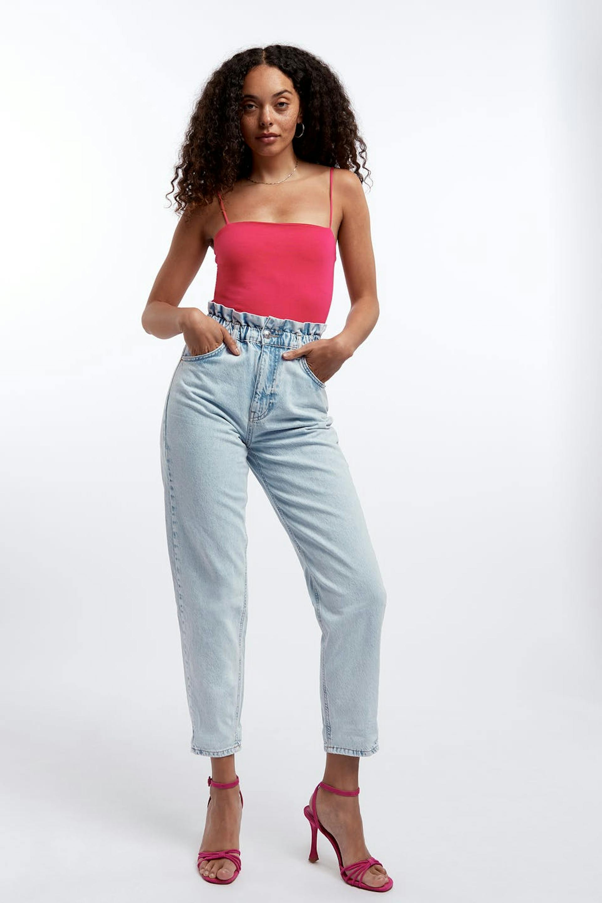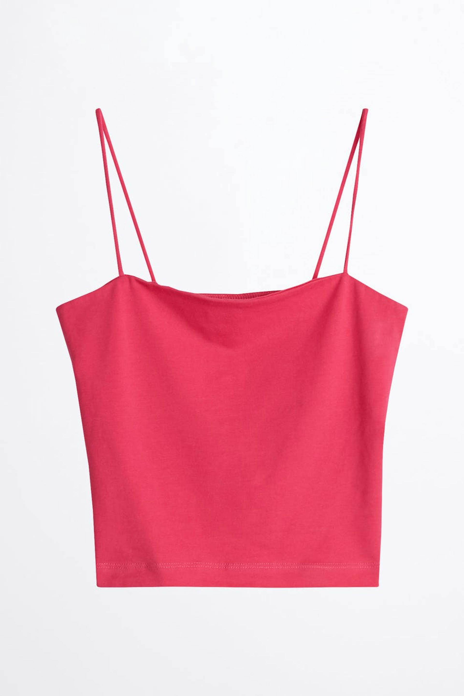 Short tank with a fitted fit. The tank is dark pink and has a straight upper edge. It has thin shoulder straps.