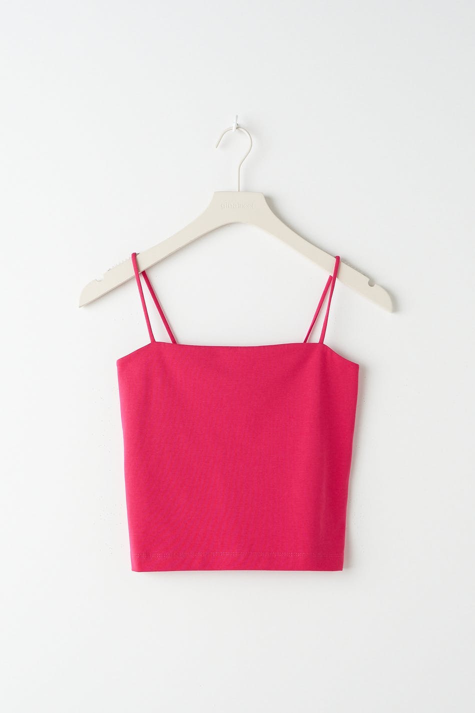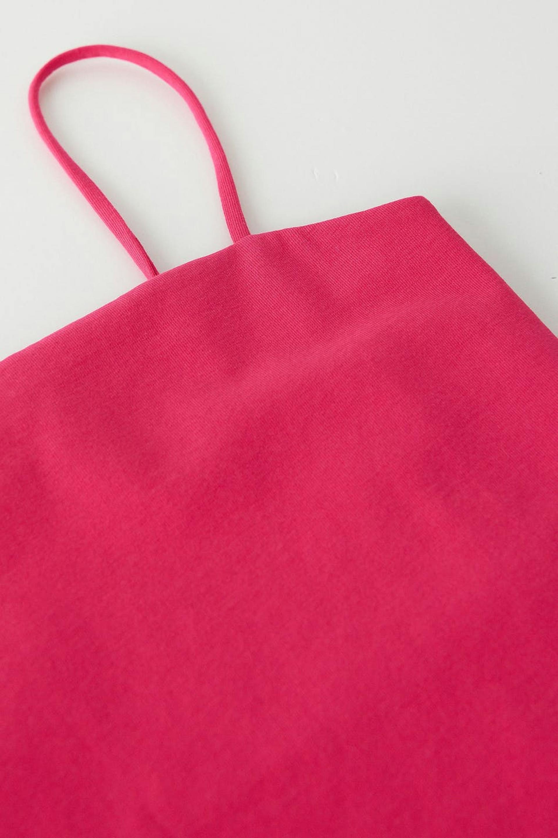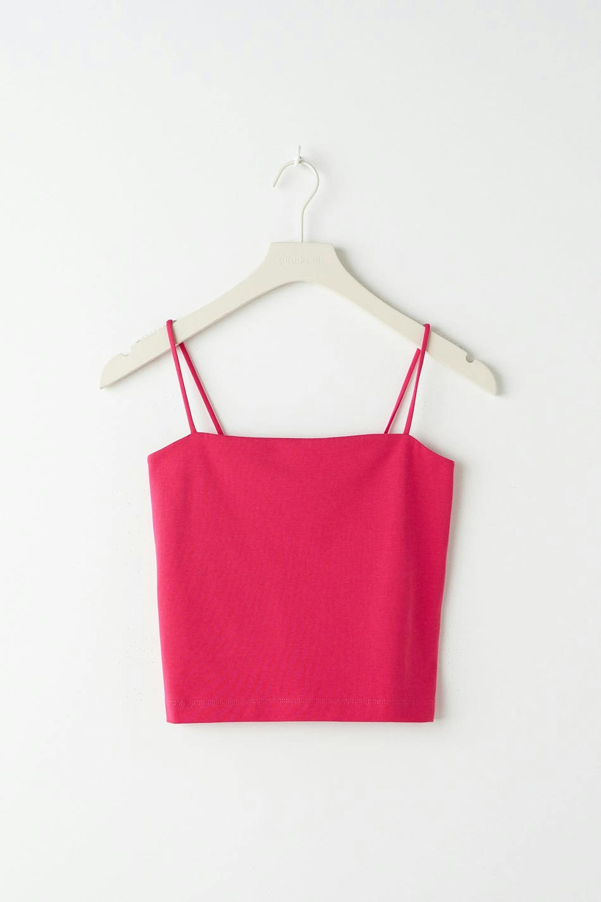 Short tank with straight upper edge. The tank is pink and has slim shoulder straps.