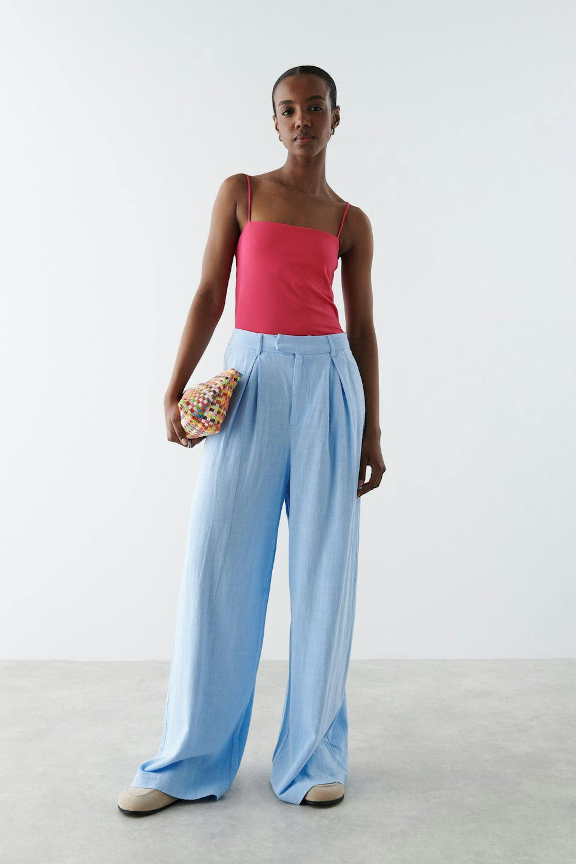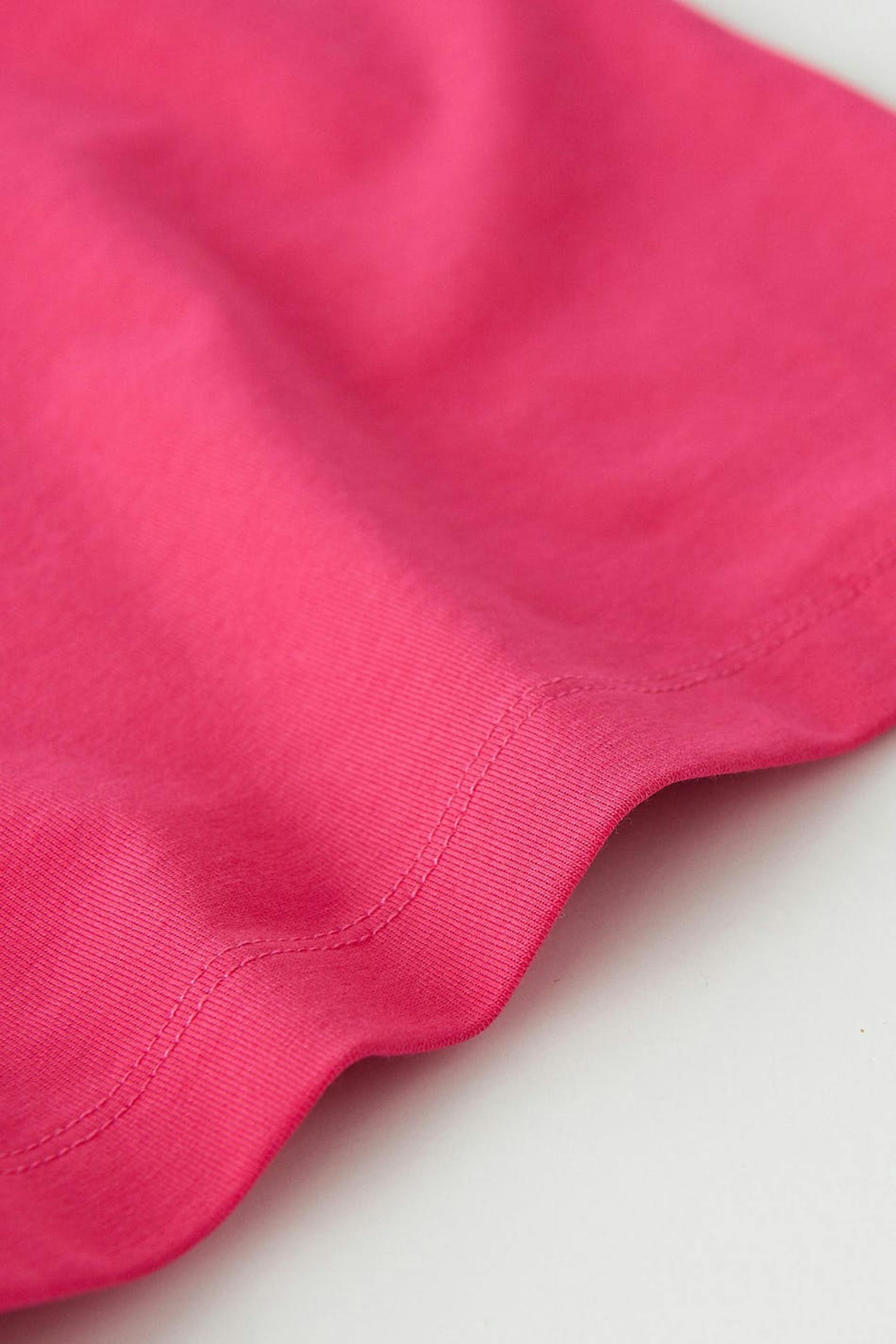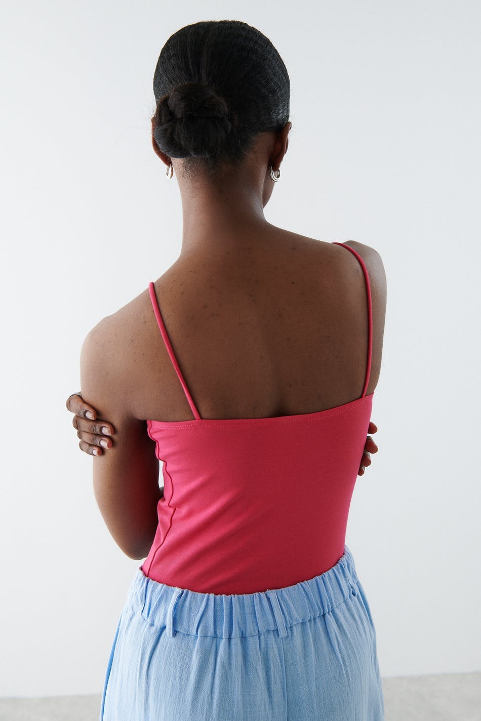 Short tank with straight upper edge. The tank is pink and has slim shoulder straps.