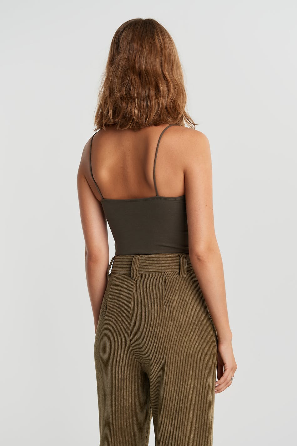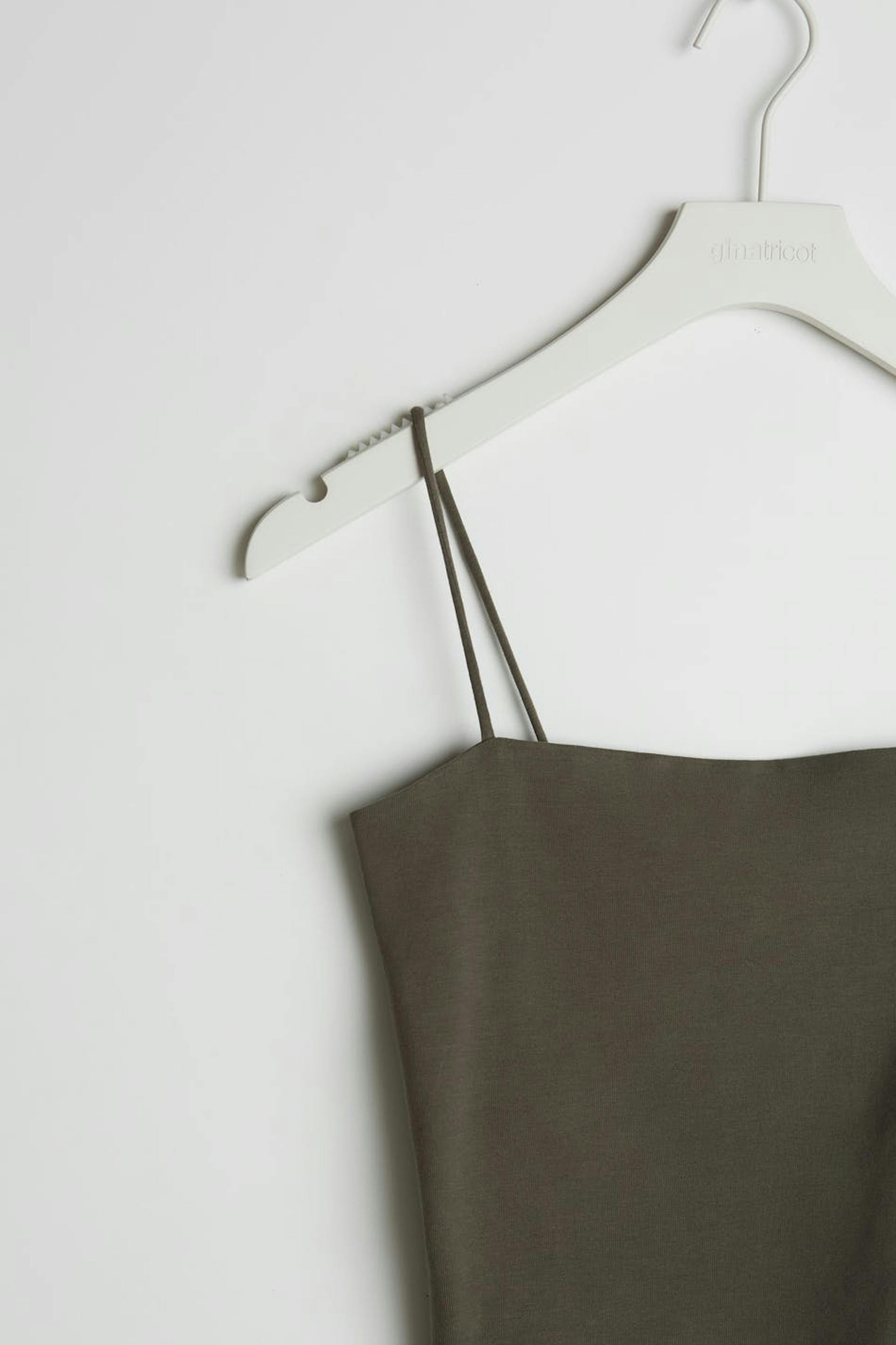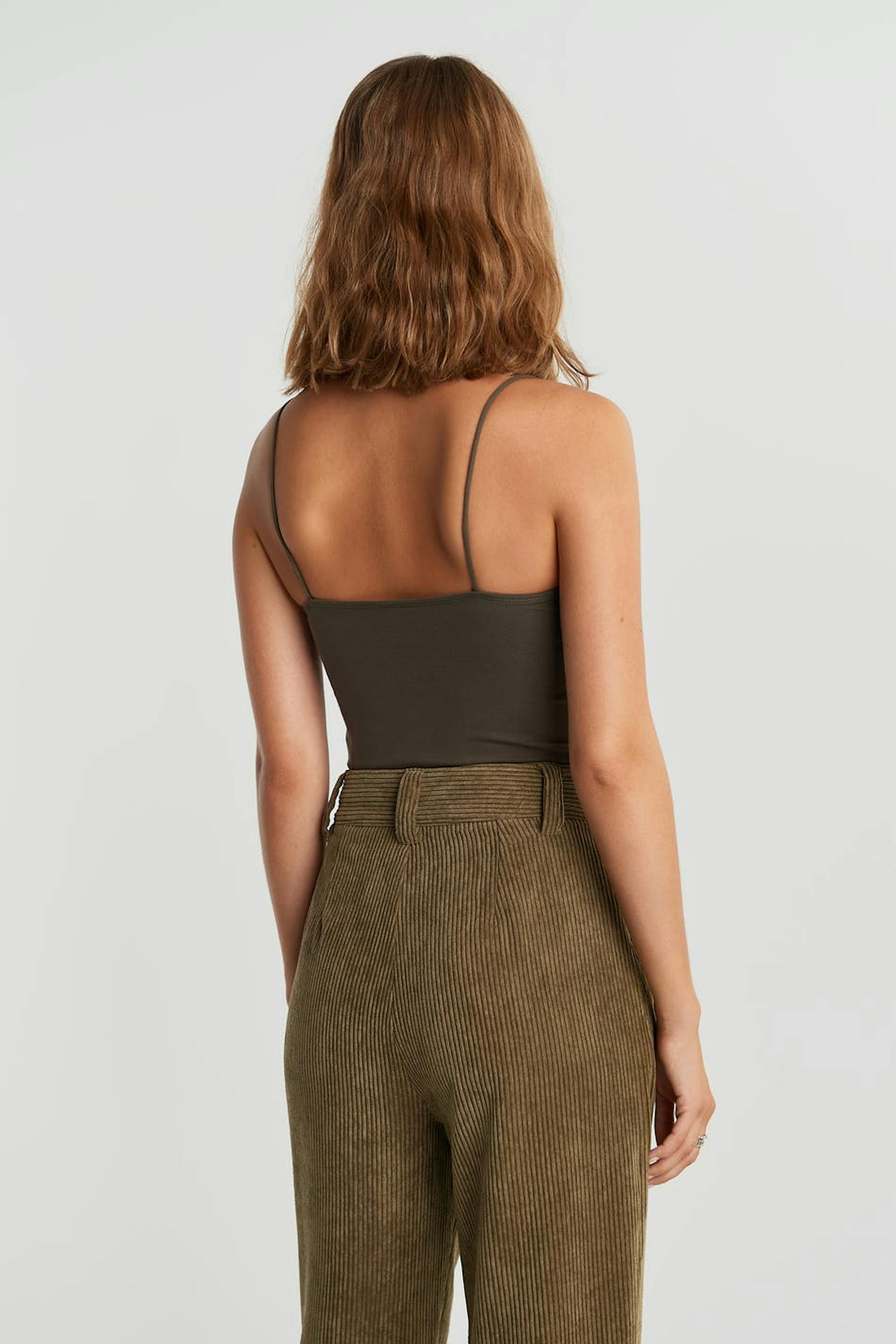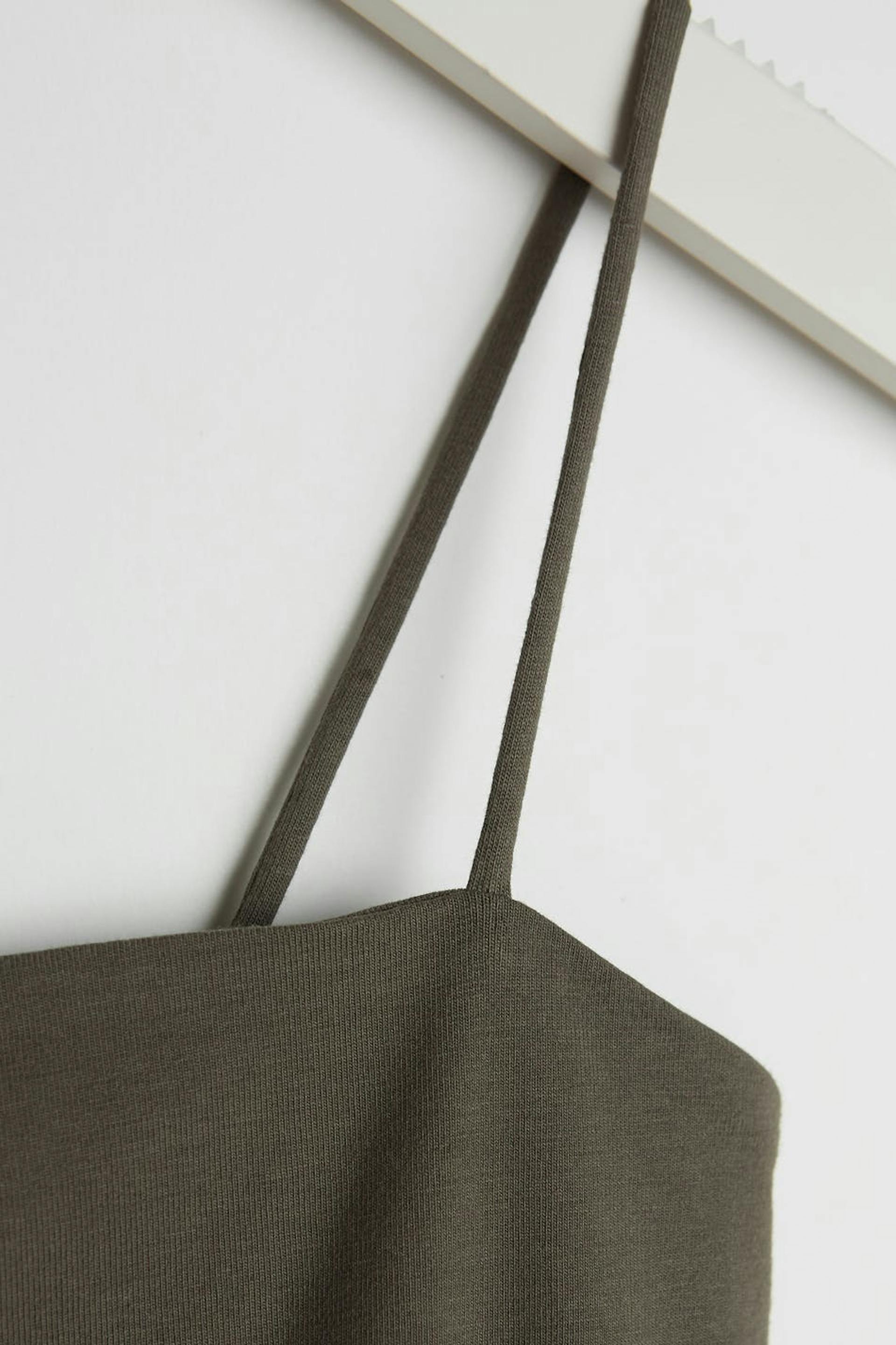 Short tank with a fitted fit. The tank is dark green and has a straight upper edge. It has thin shoulder straps.