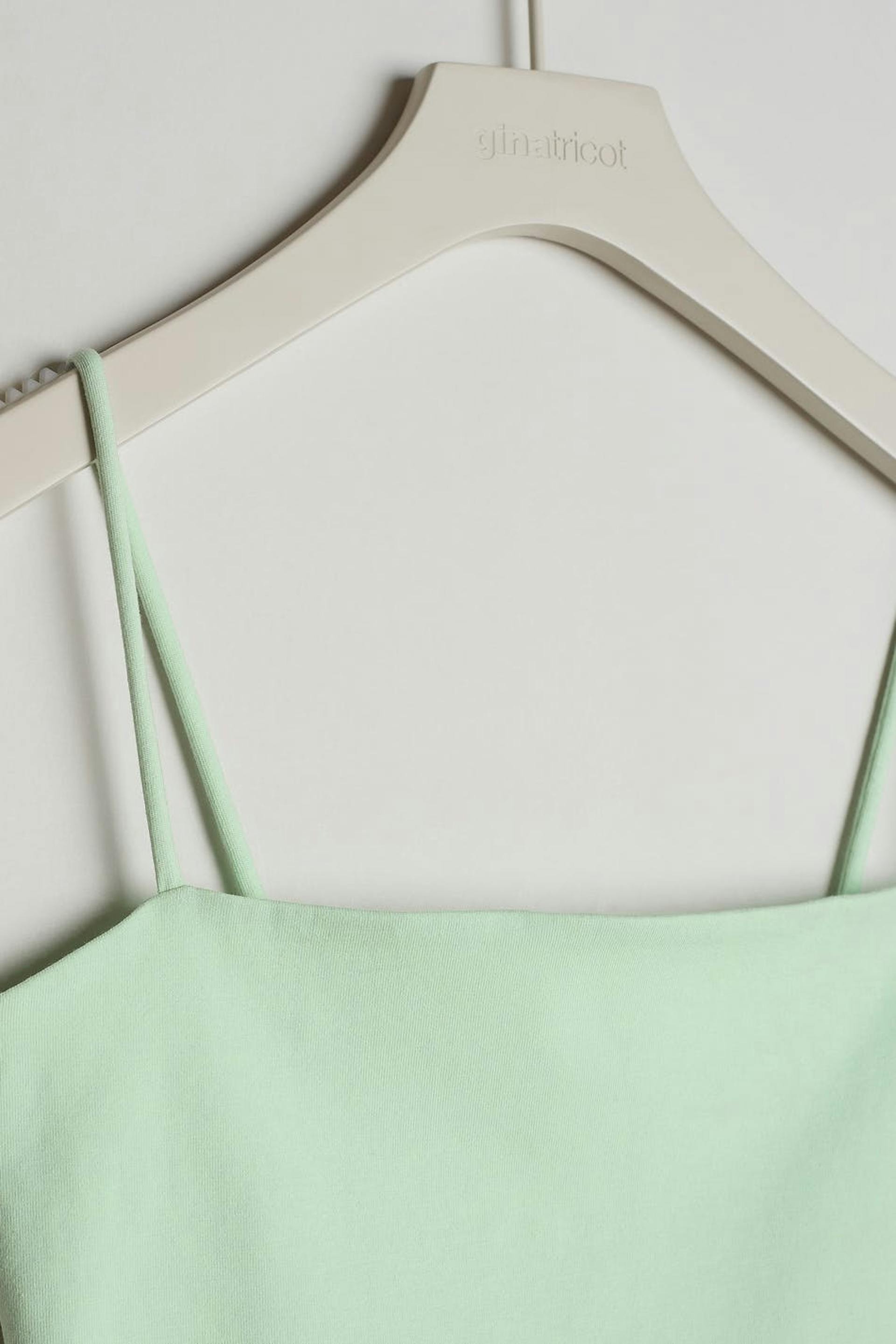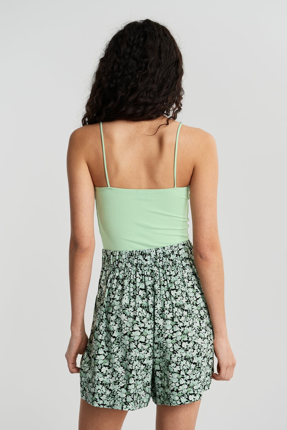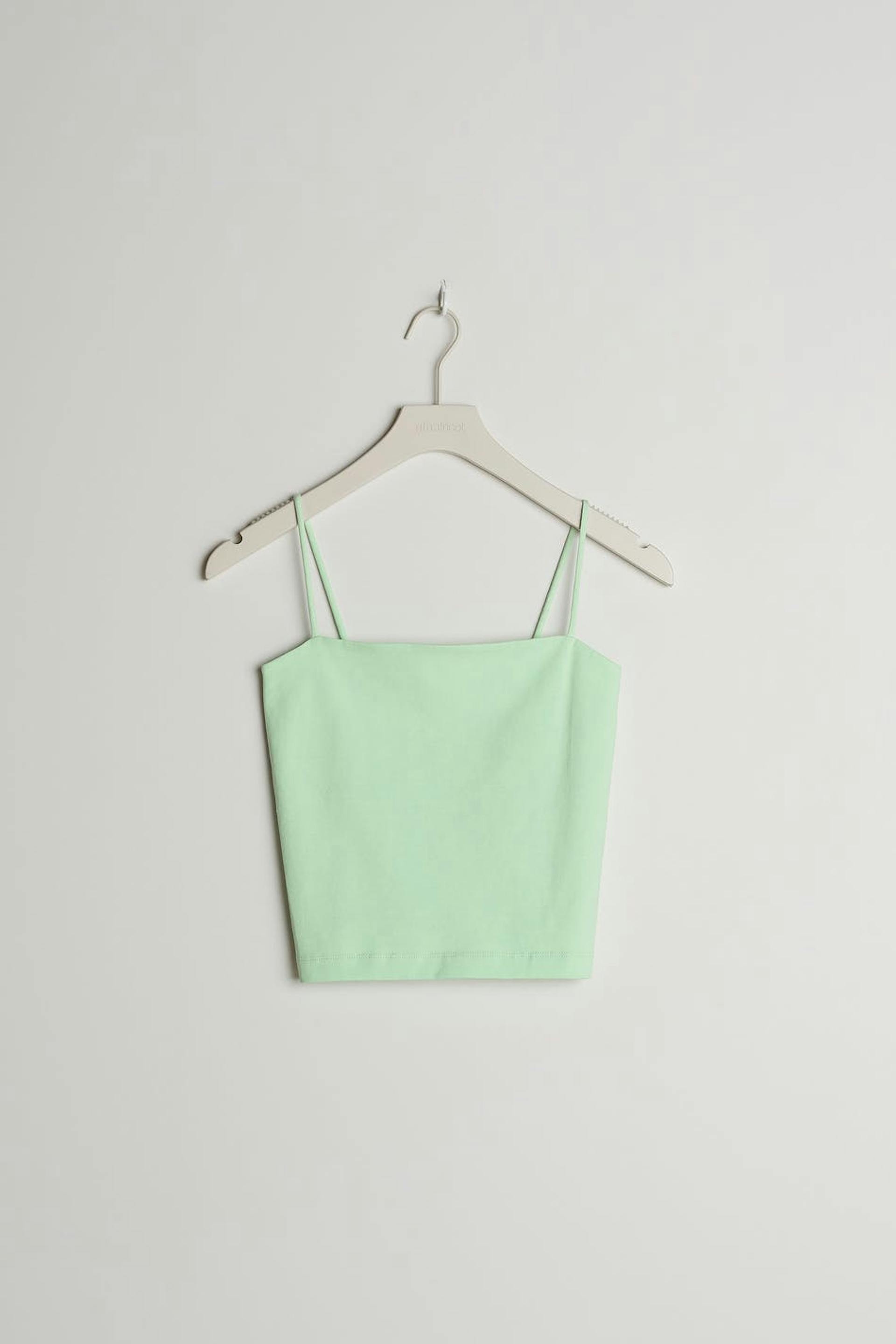 Short crop top with a fitted fit. The top is green and has a straight upper edge. It has thin shoulder straps.