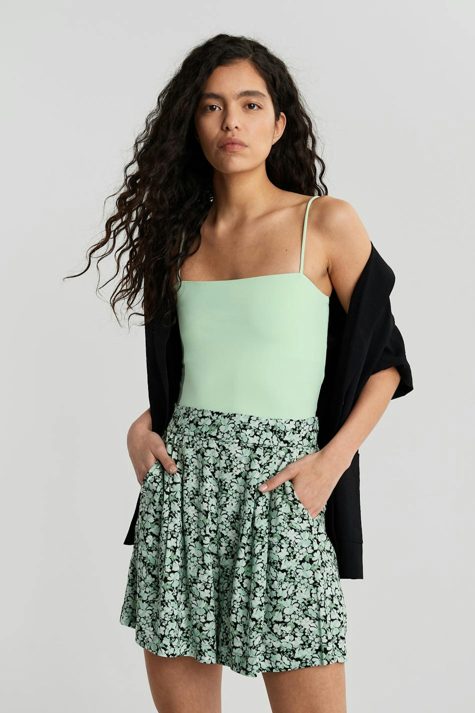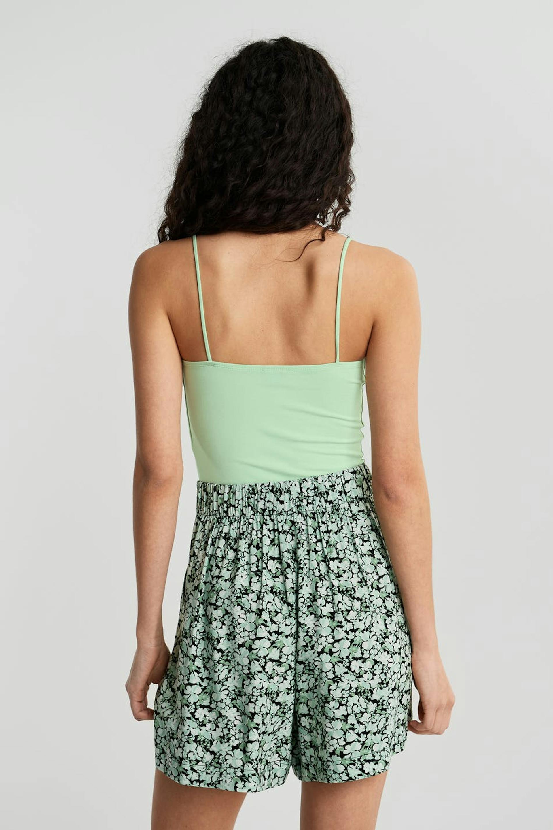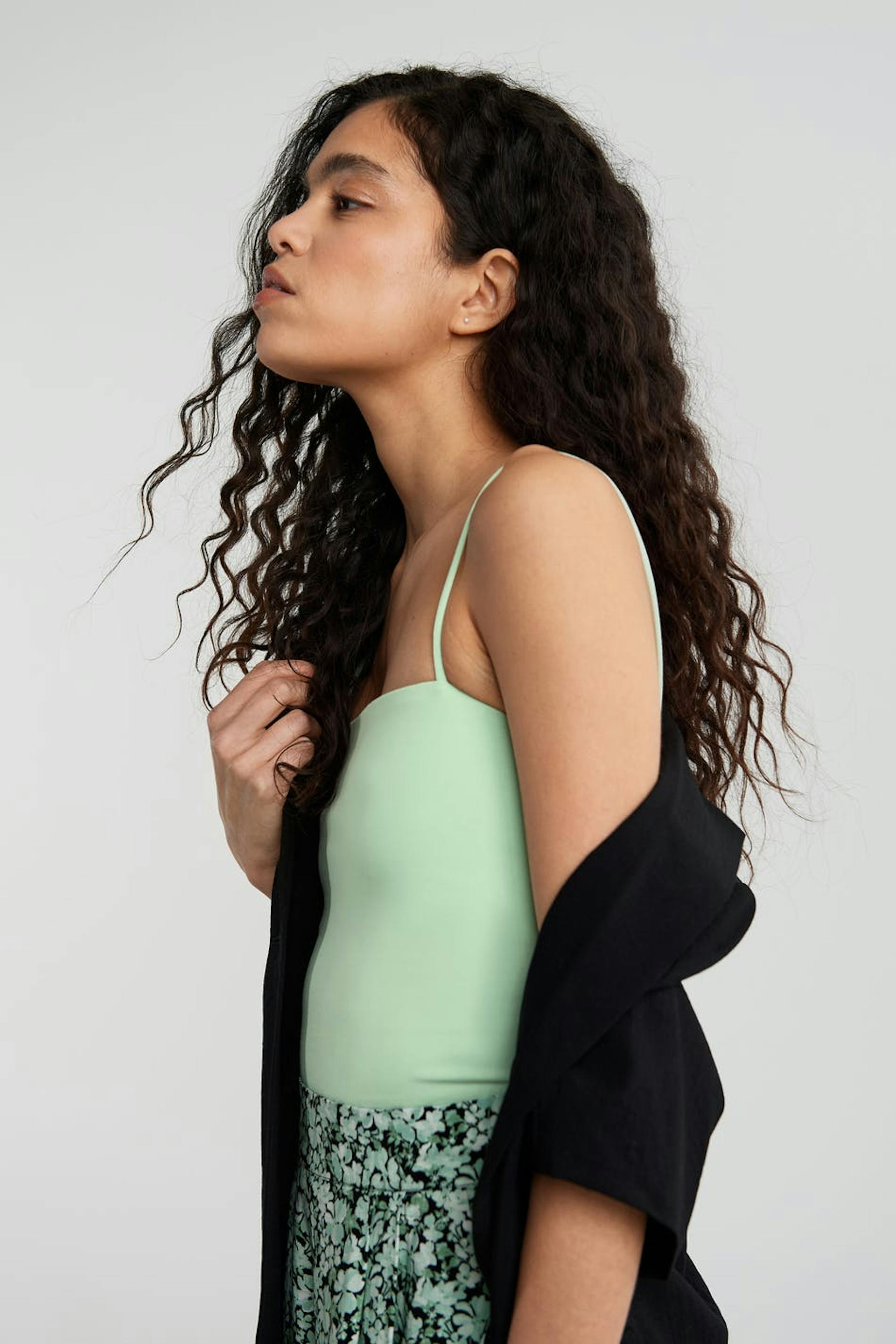 Short crop top with a fitted fit. The top is green and has a straight upper edge. It has thin shoulder straps.