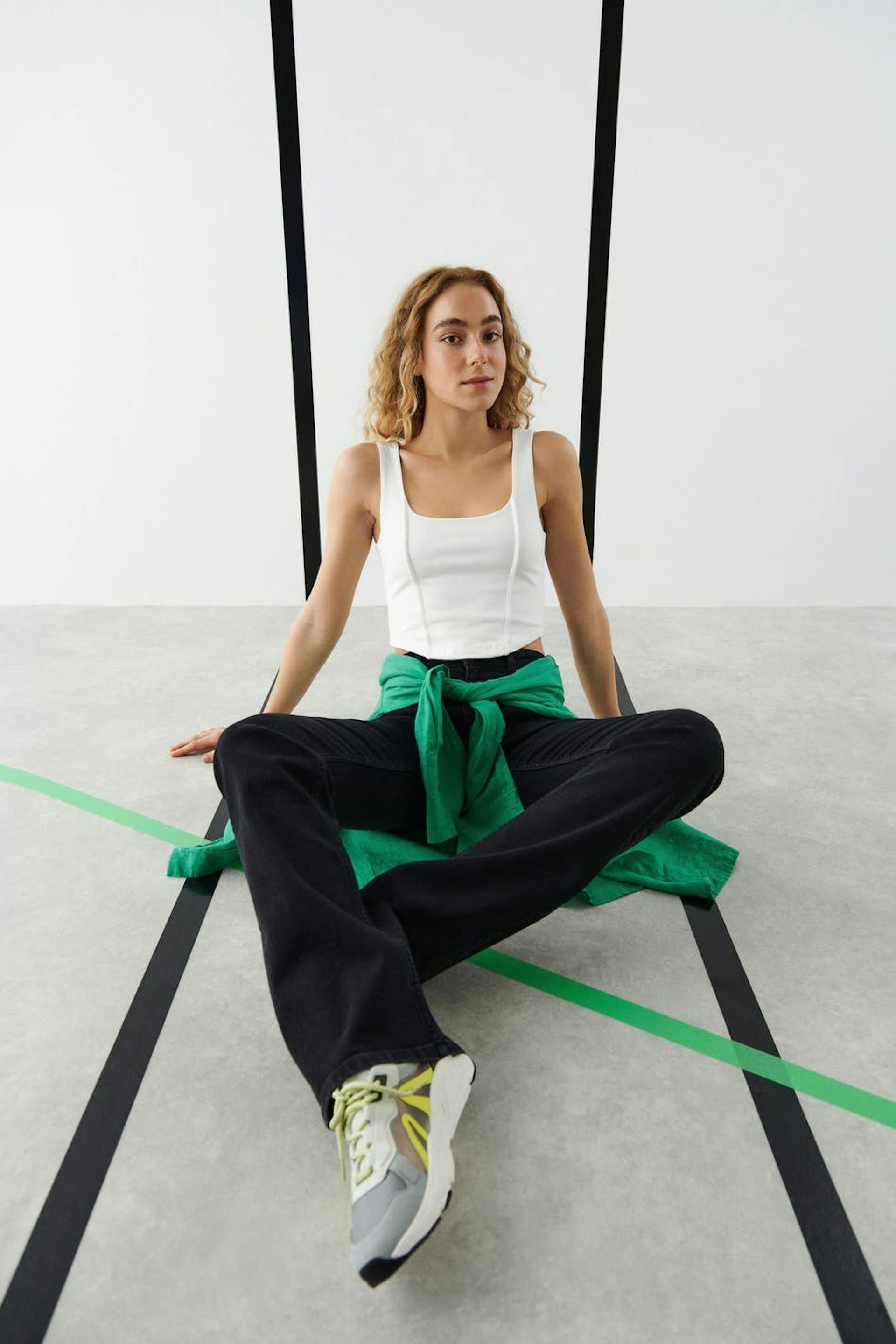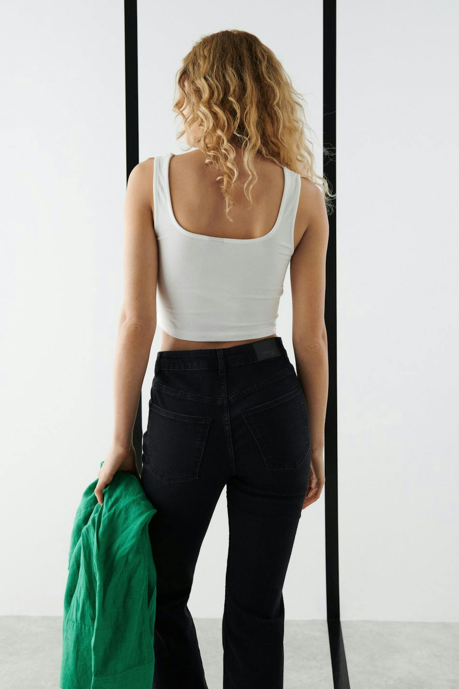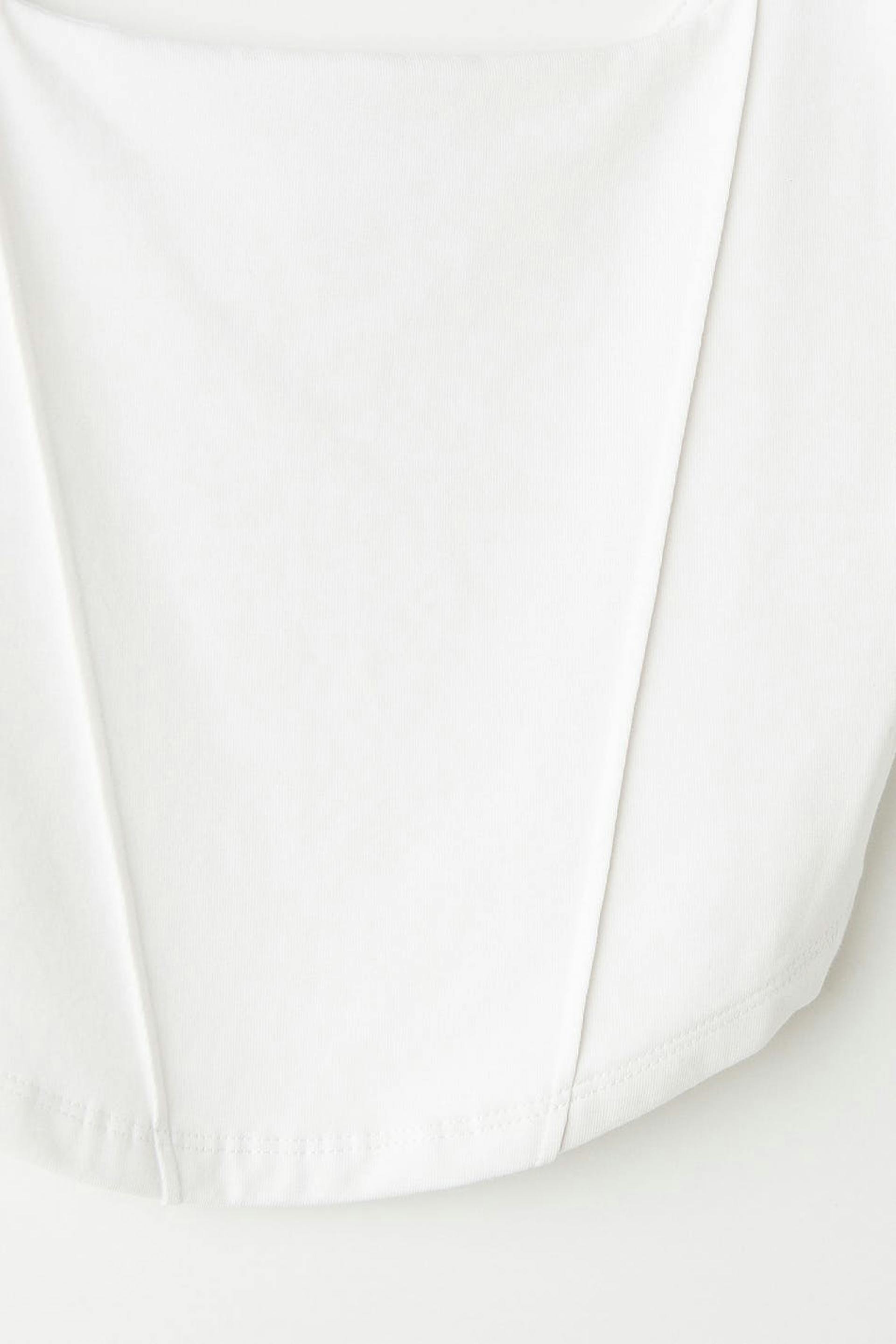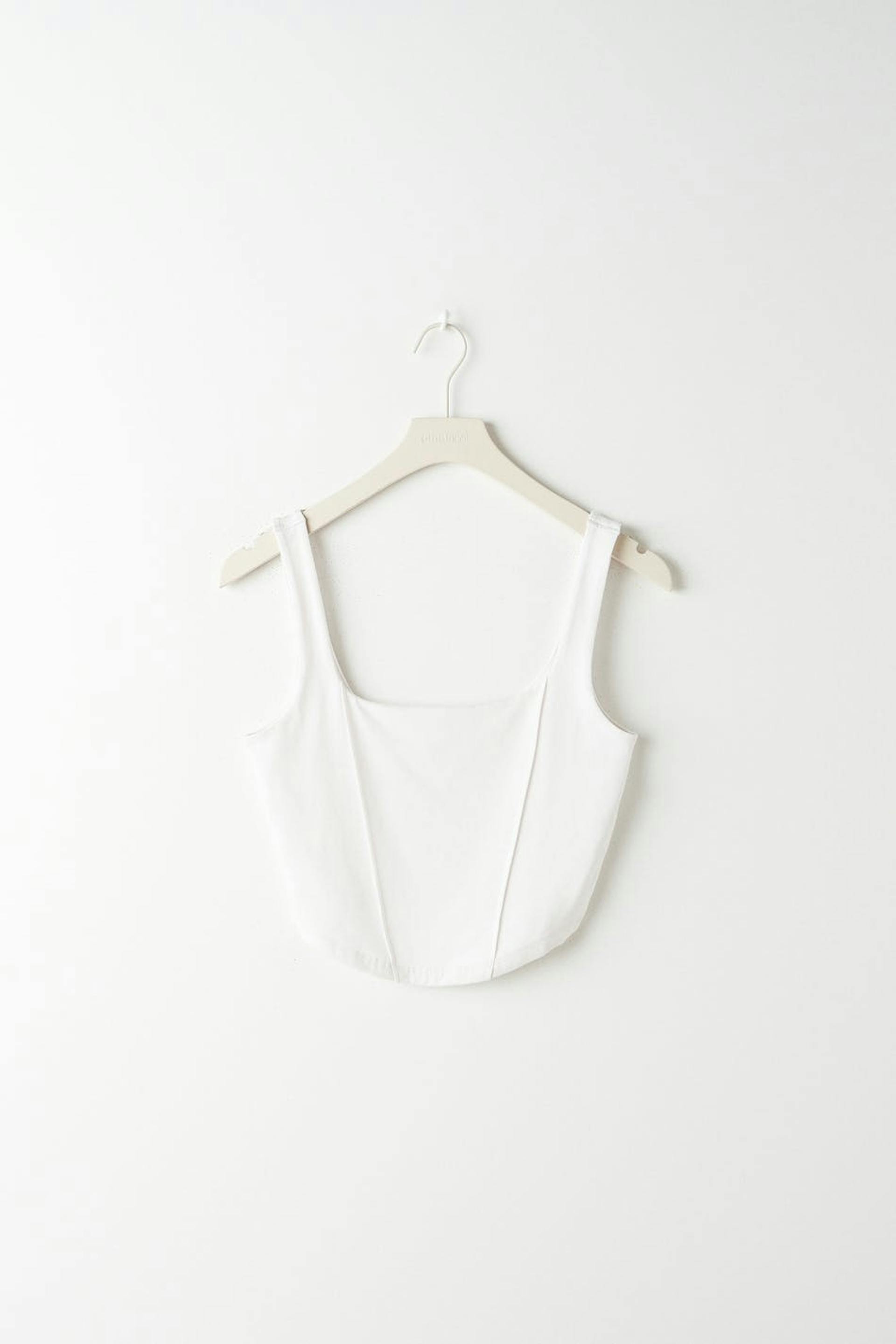 Cropped tank with wide shoulder straps. The tank is white and has stitched crease details in front. It has a fitted fit and double layer at the front.
