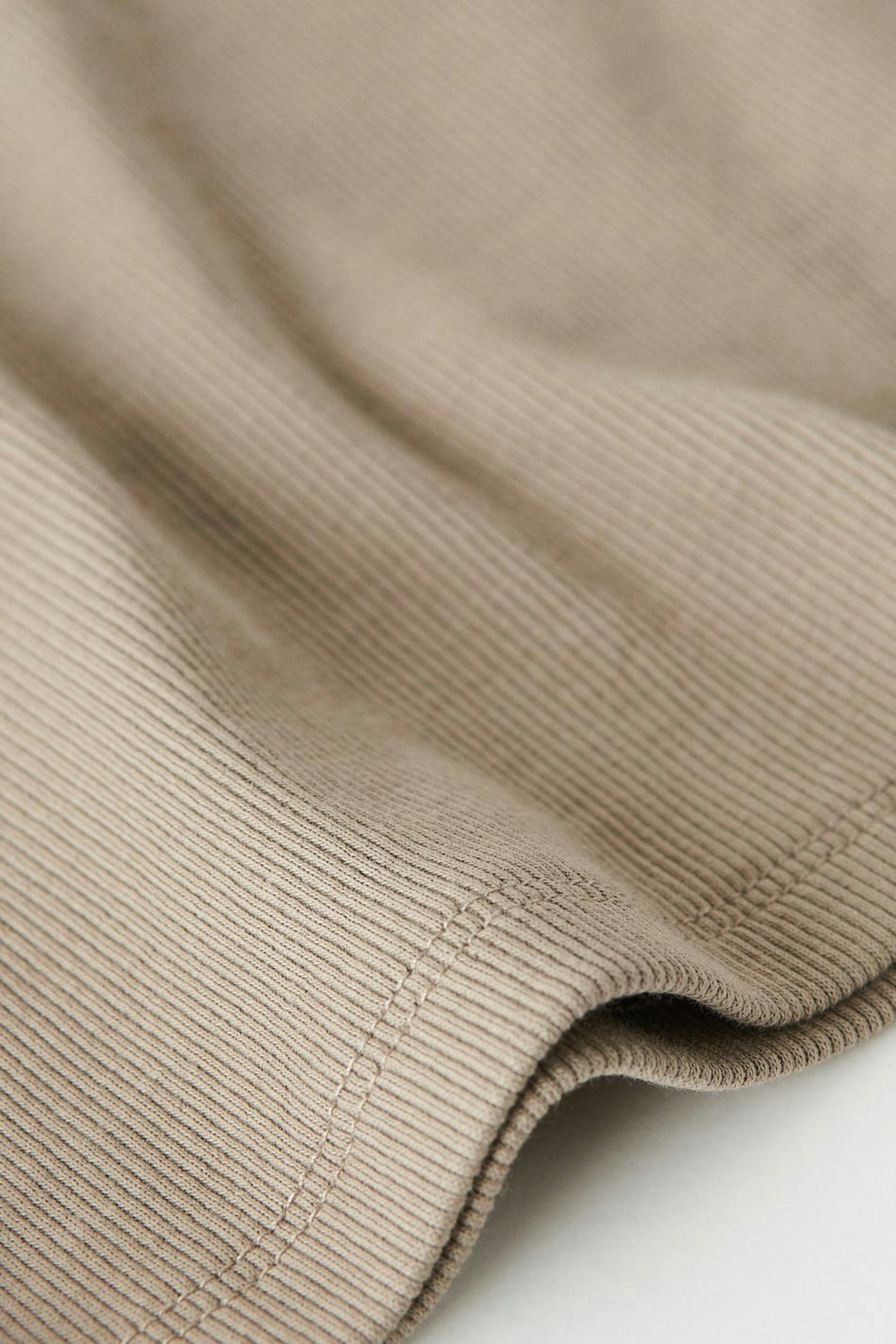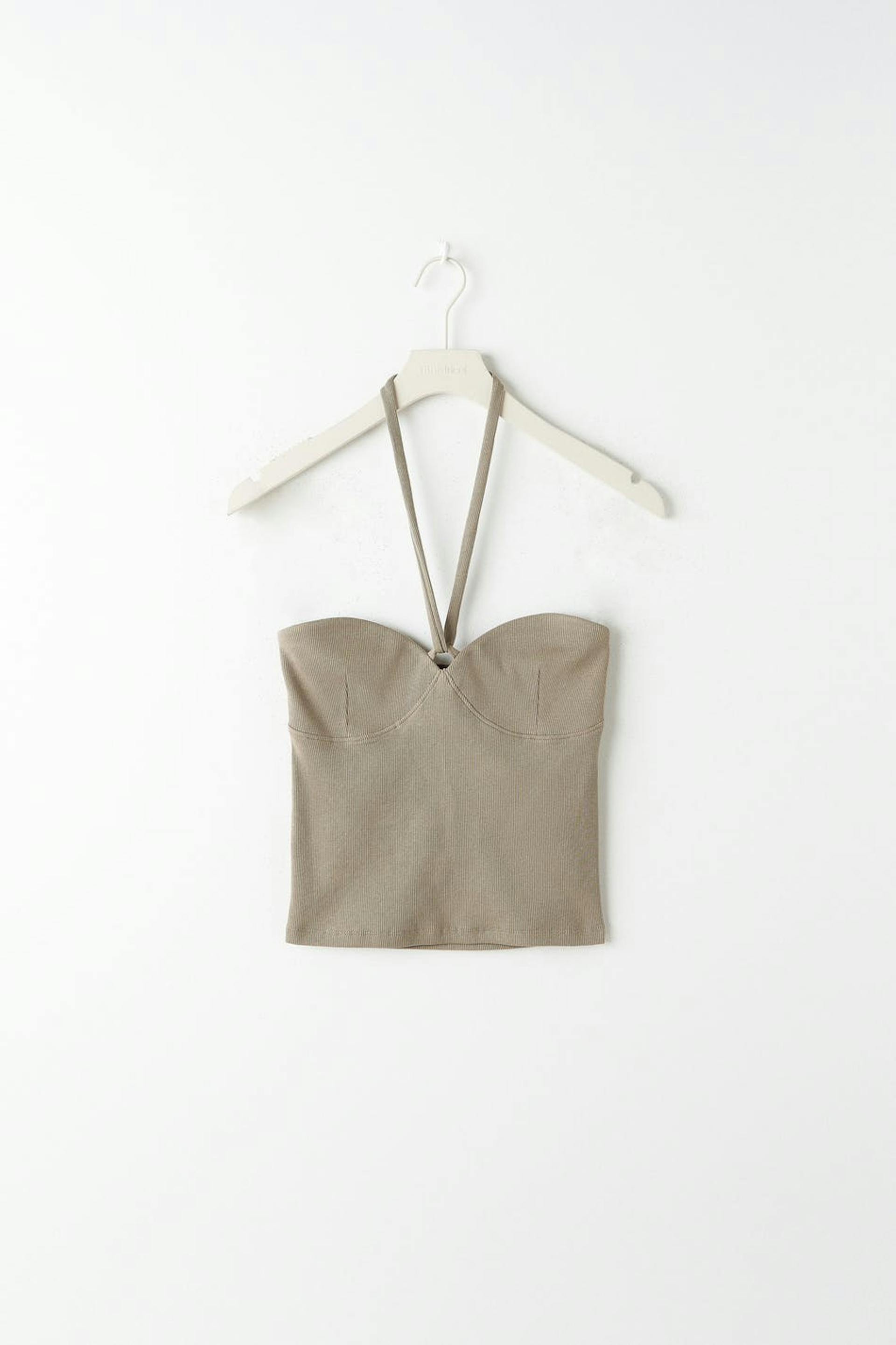 Top in jersey with halterneck tie. The top is beige and has open back. It has a fitted fit, ribbed quality and sweetheart neckline with bandeau style.