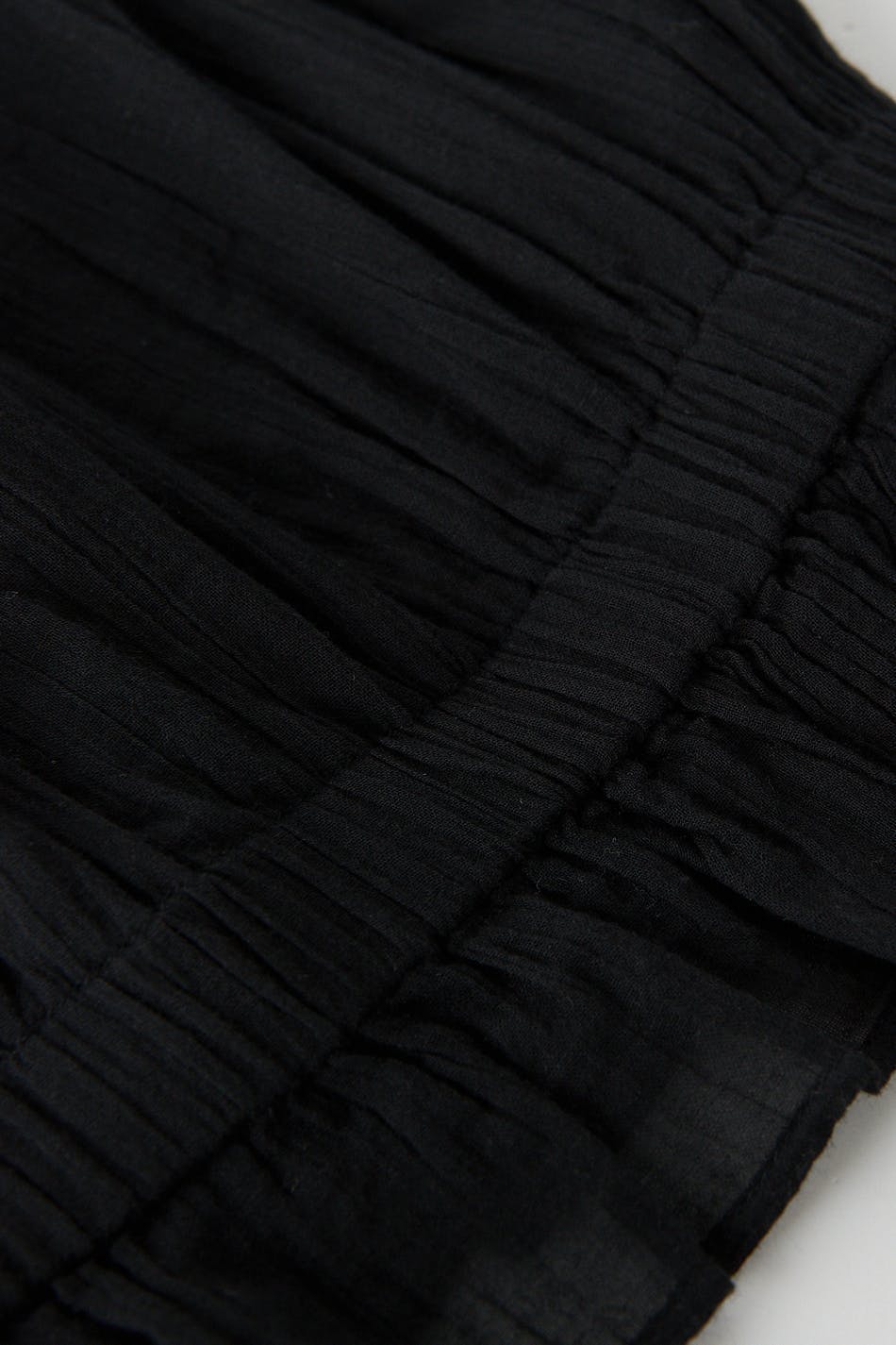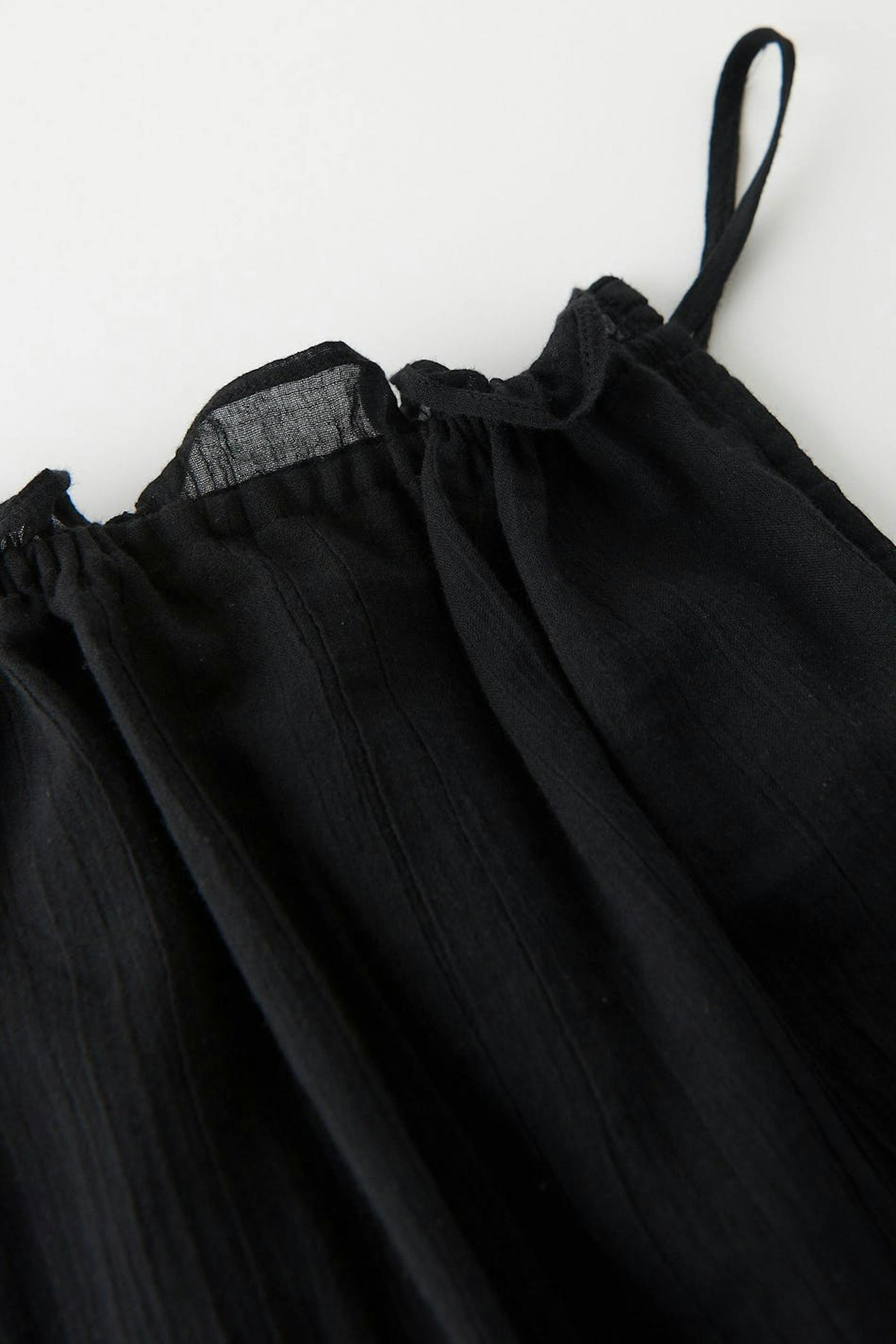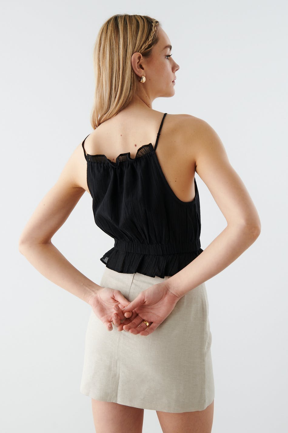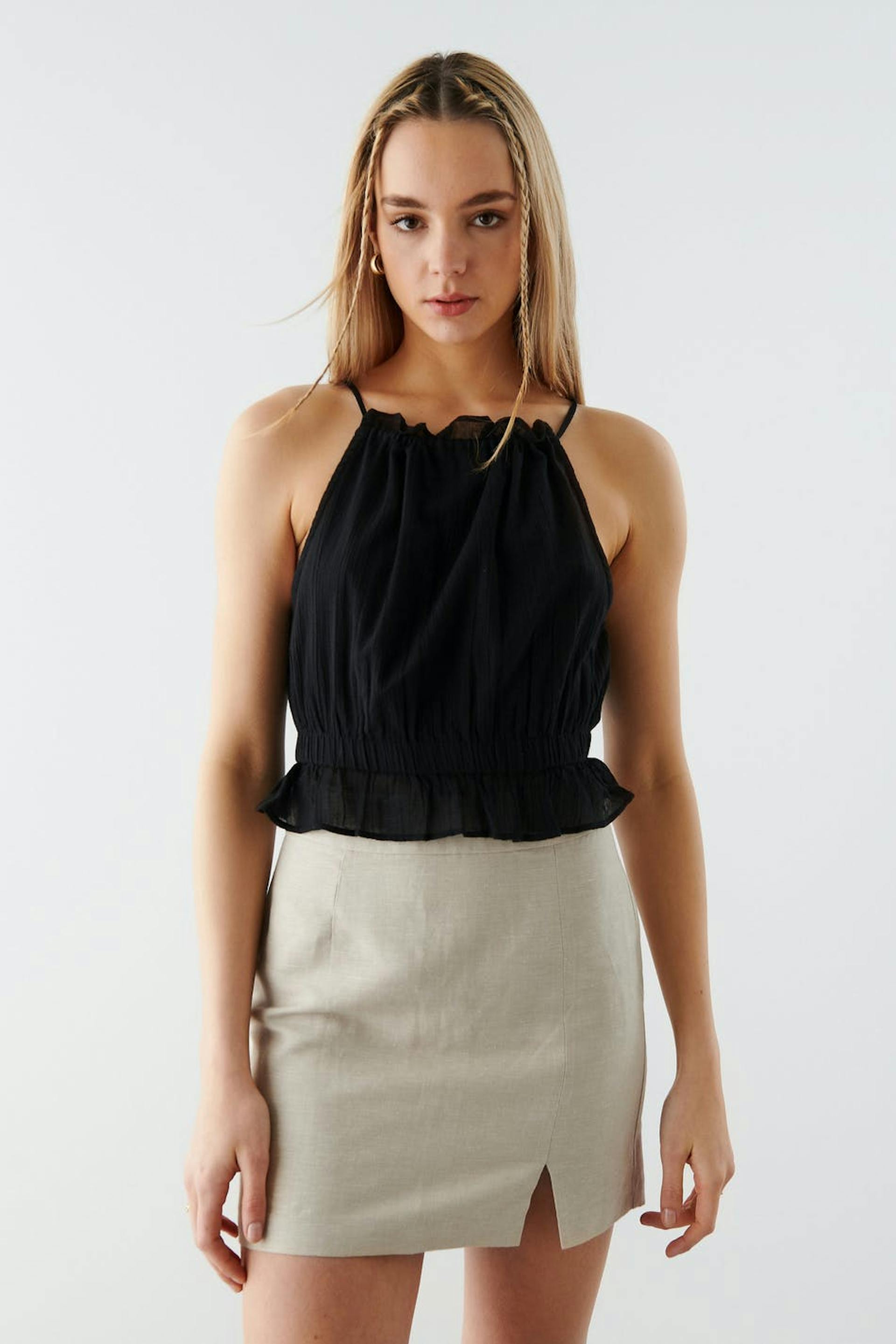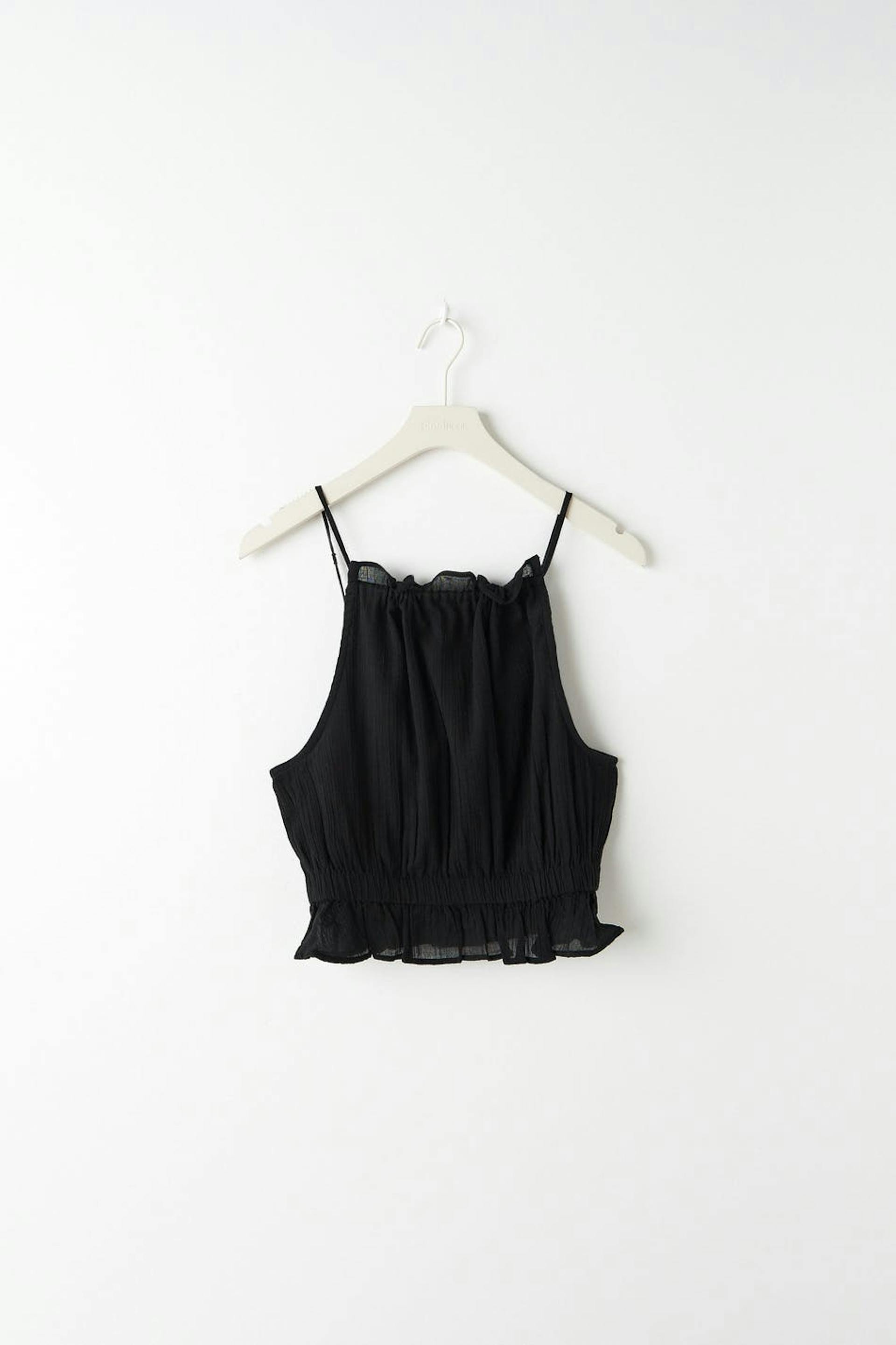 Sleeveless top with gathered effect at the waist. The top is black and short and has thin shoulder straps. It has an elastic at the waist.
