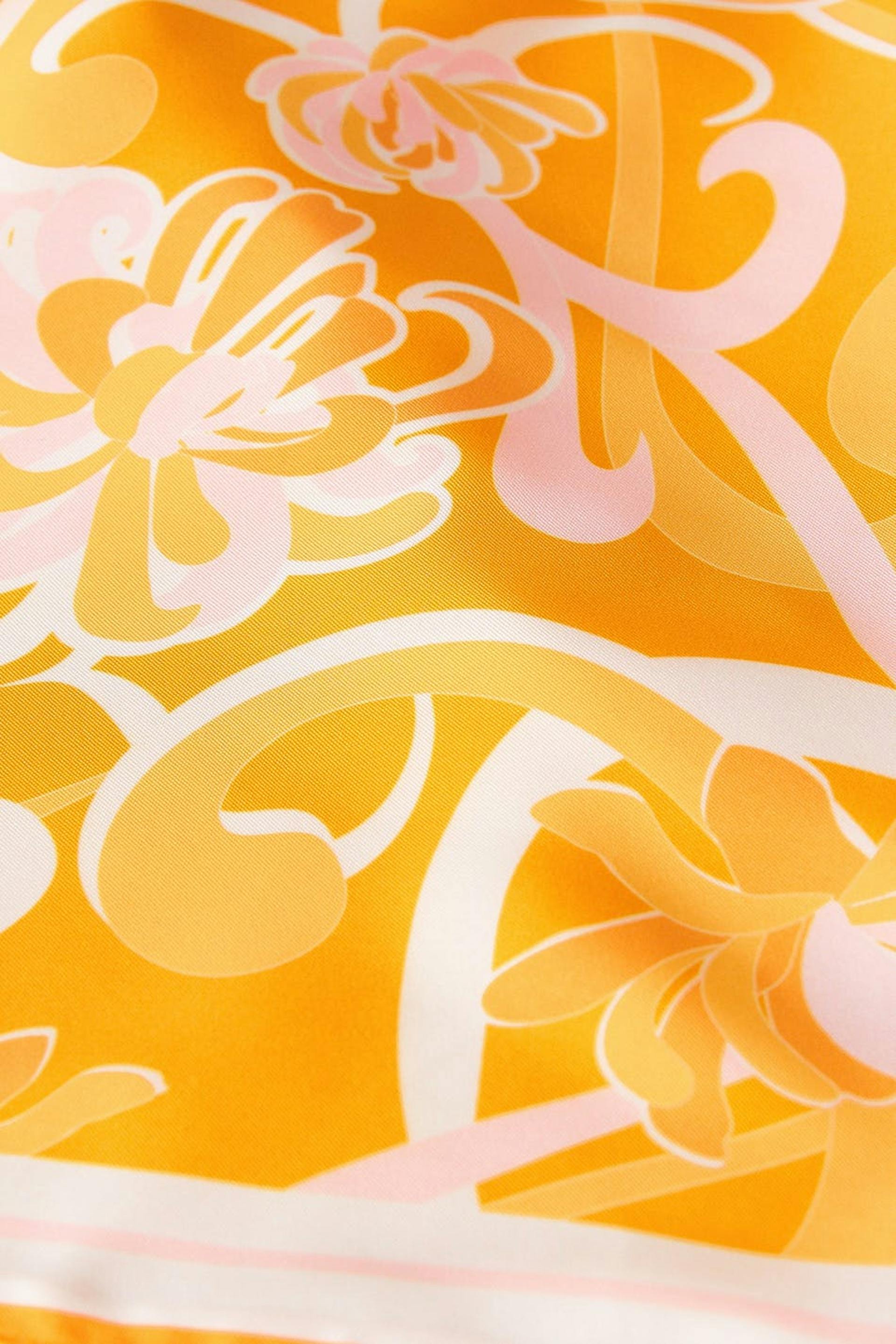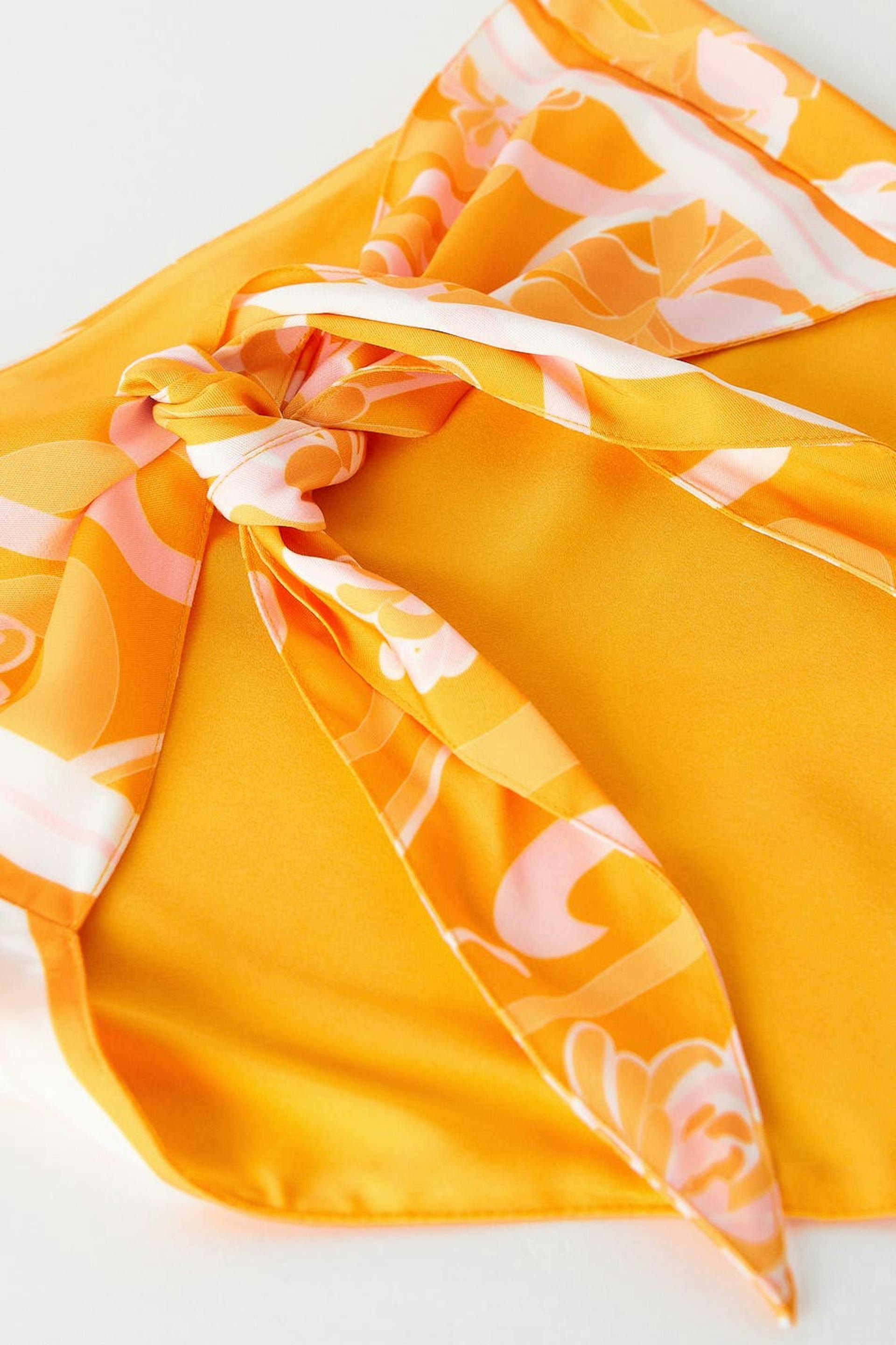 Patterned scarf top in recycled polyester with self-tie in the back. The top is perfect for the party and orange and has a pointy edge at the bottom.