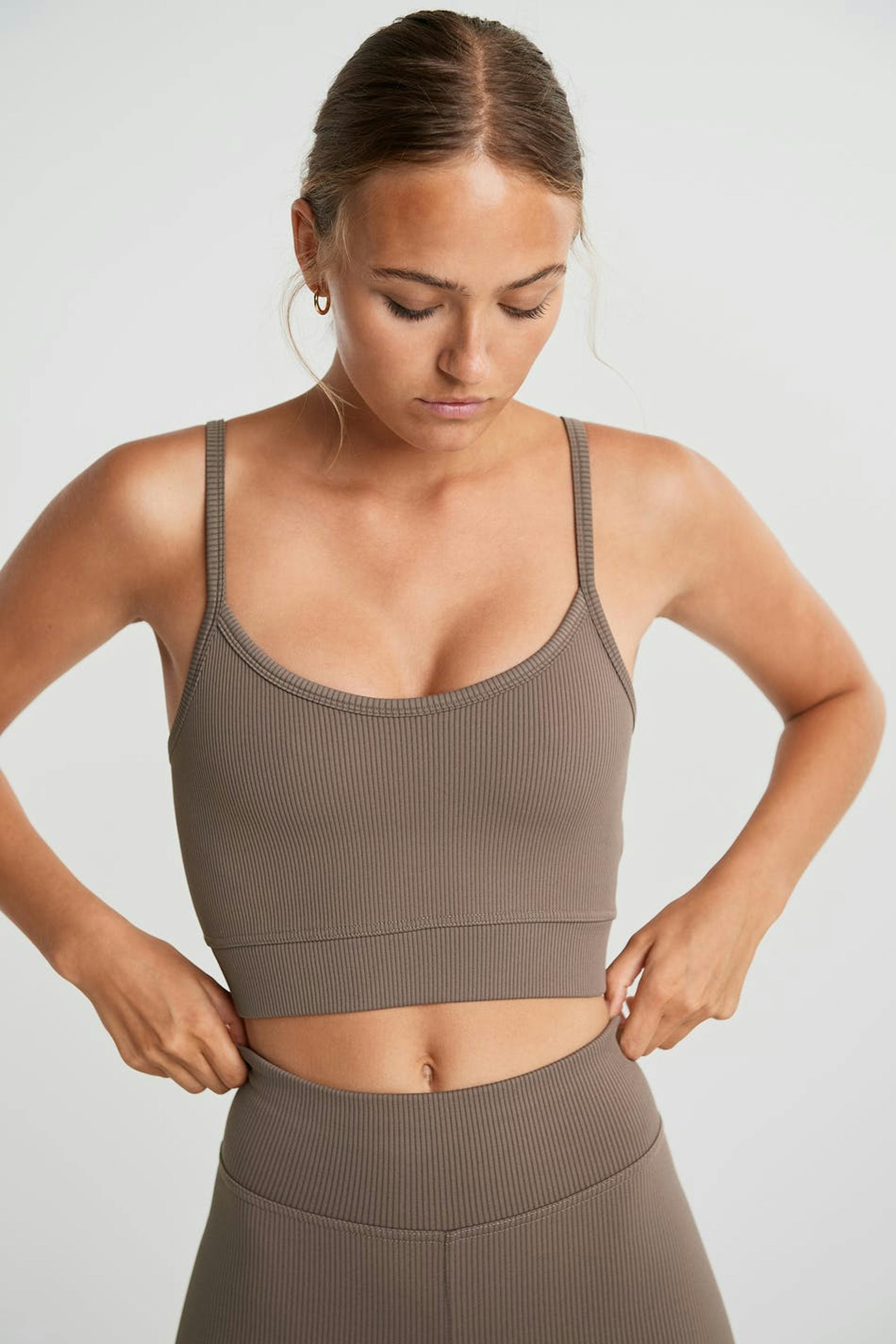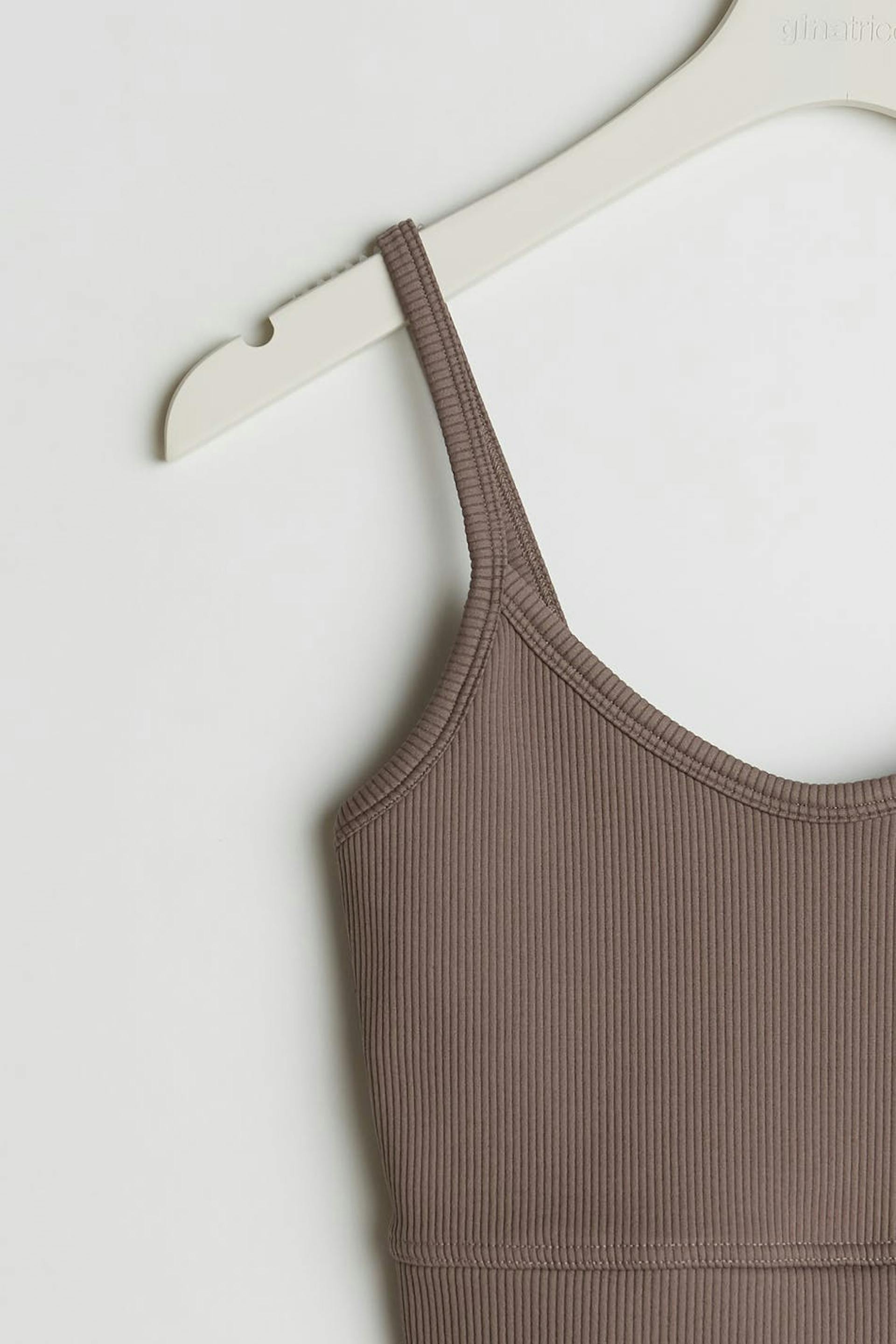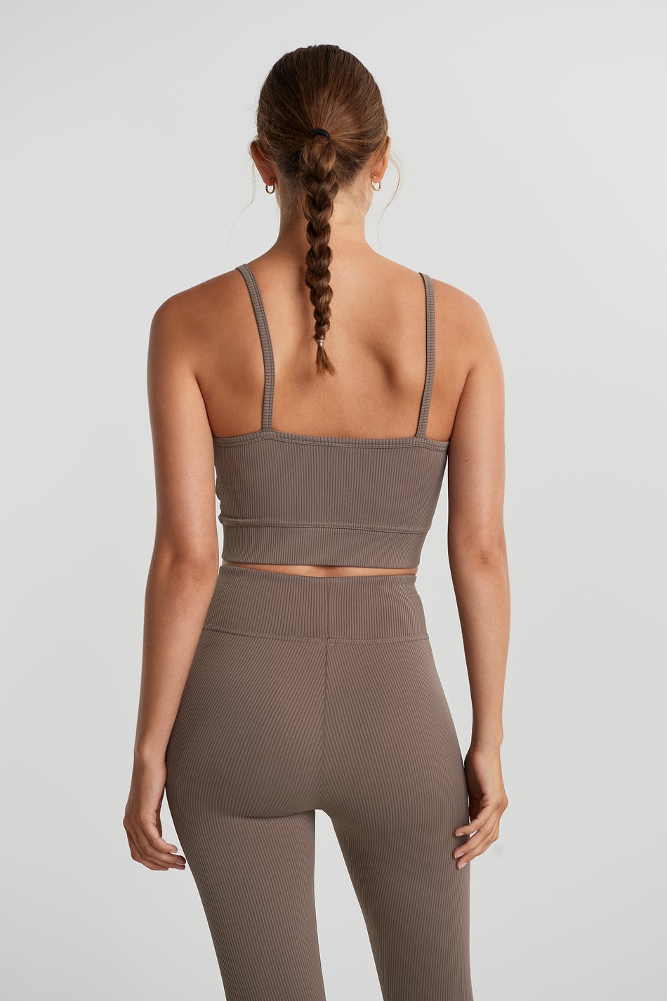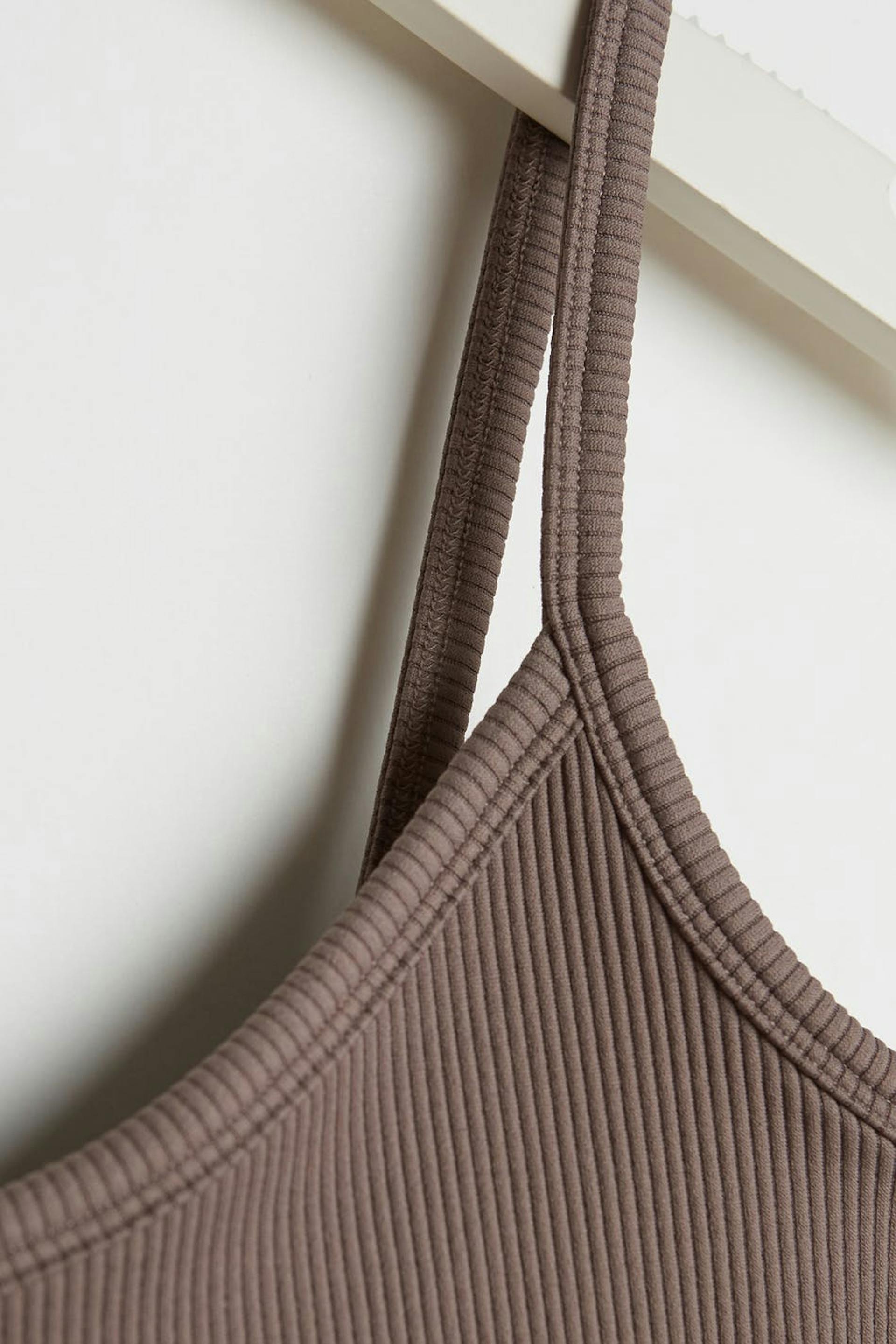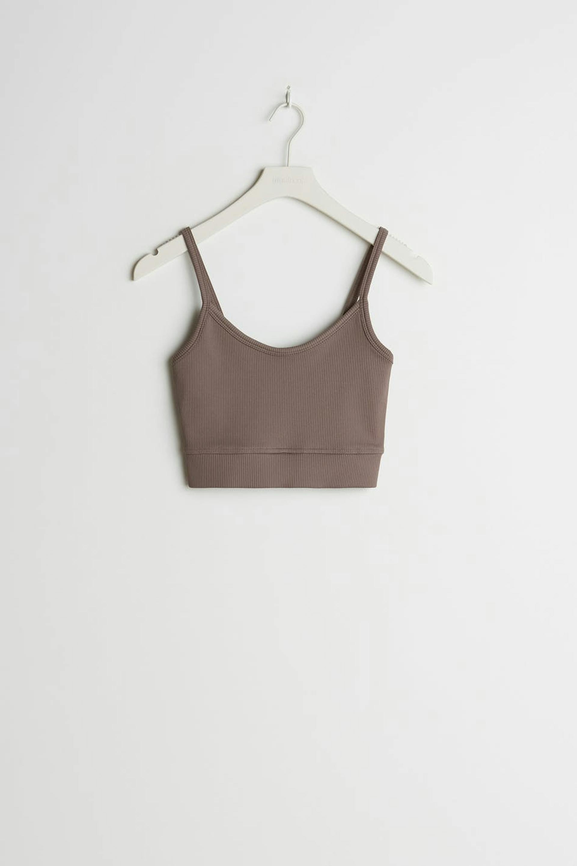 Sleeveless crop top with a fitted fit. The top is brown and soft and has thin shoulder straps. It is made of jersey.