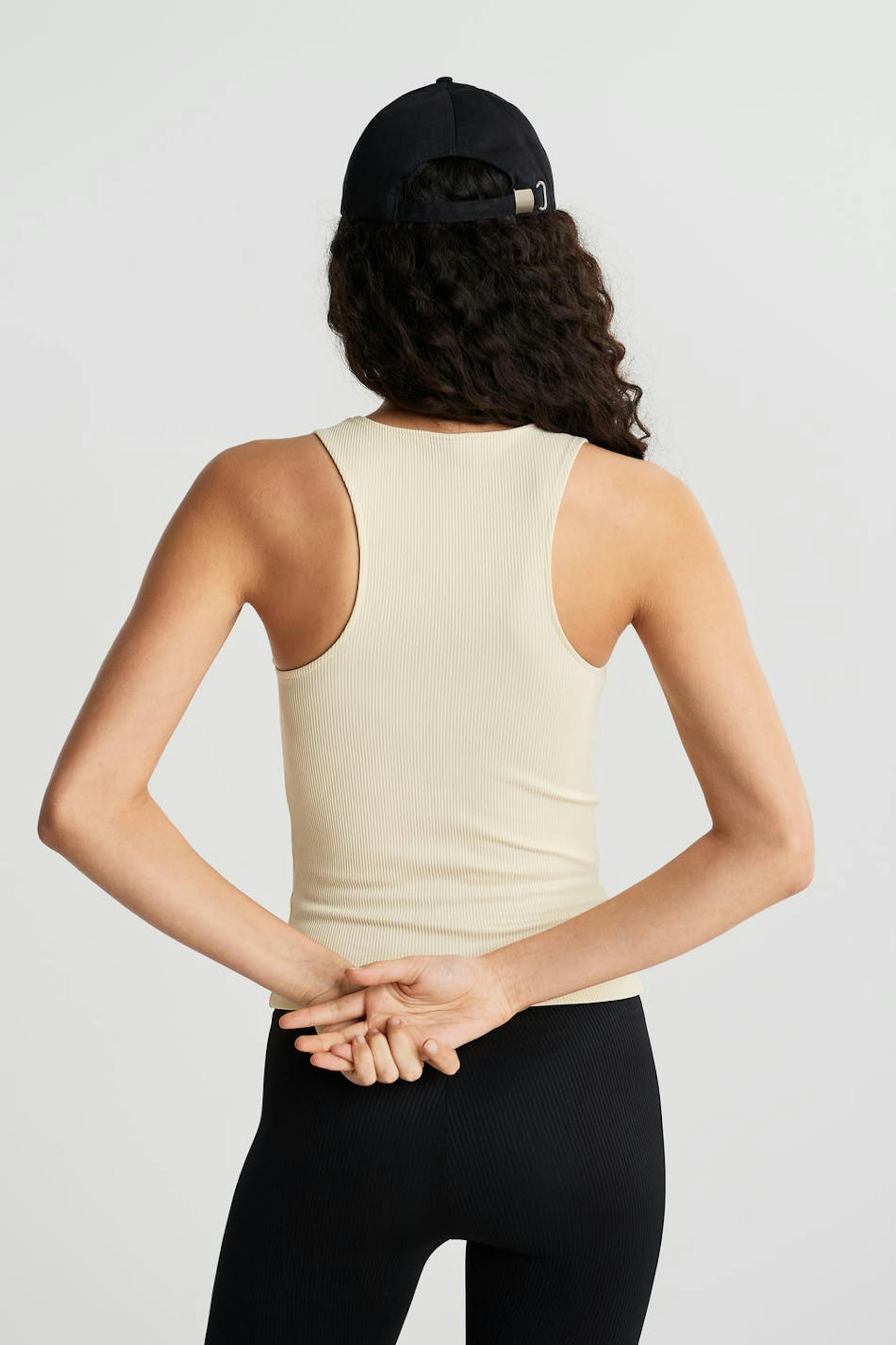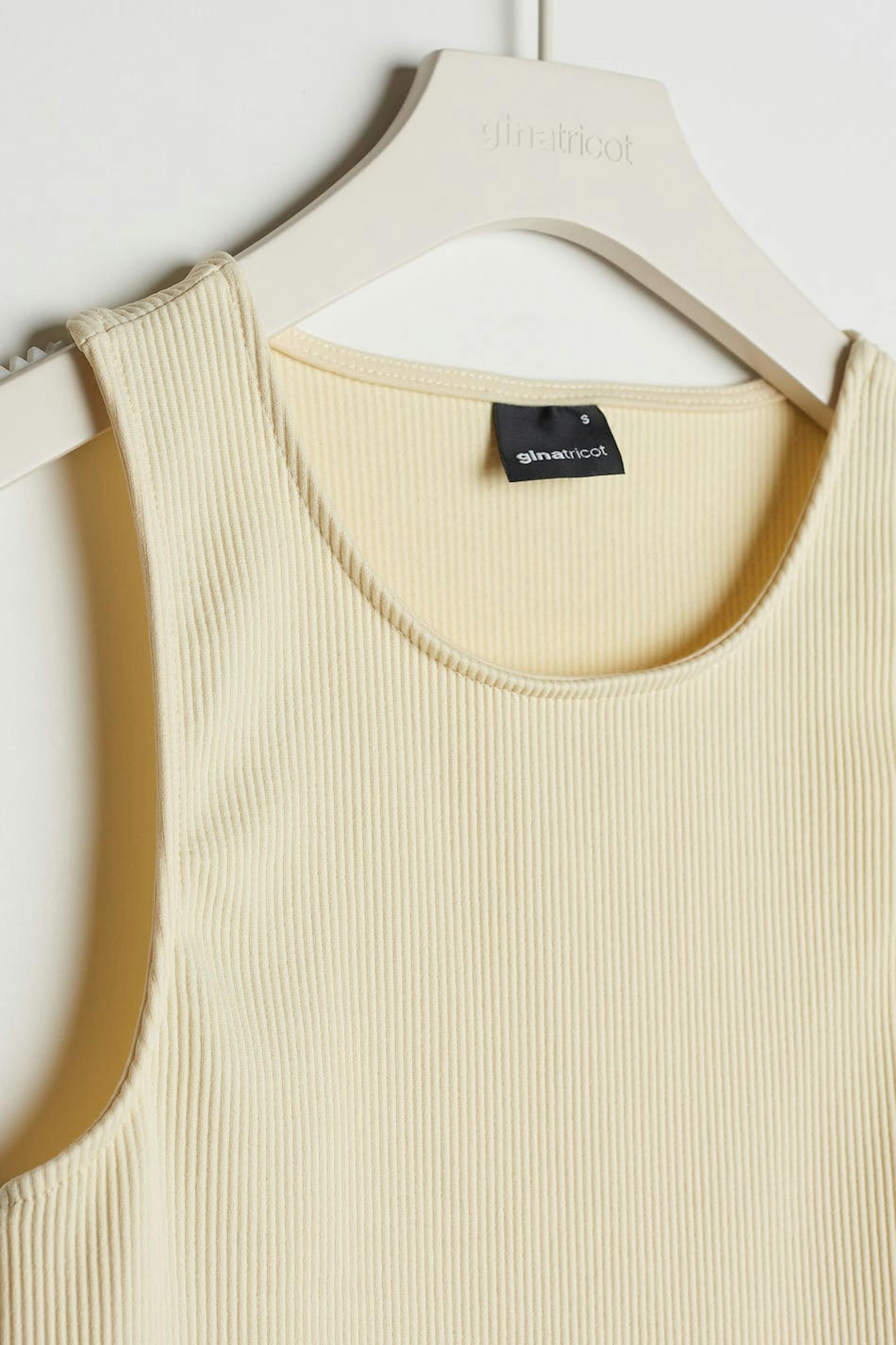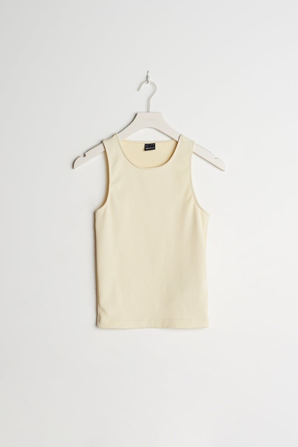 Ribbed tank with a fitted fit. The tank is beige. It is made of jersey.