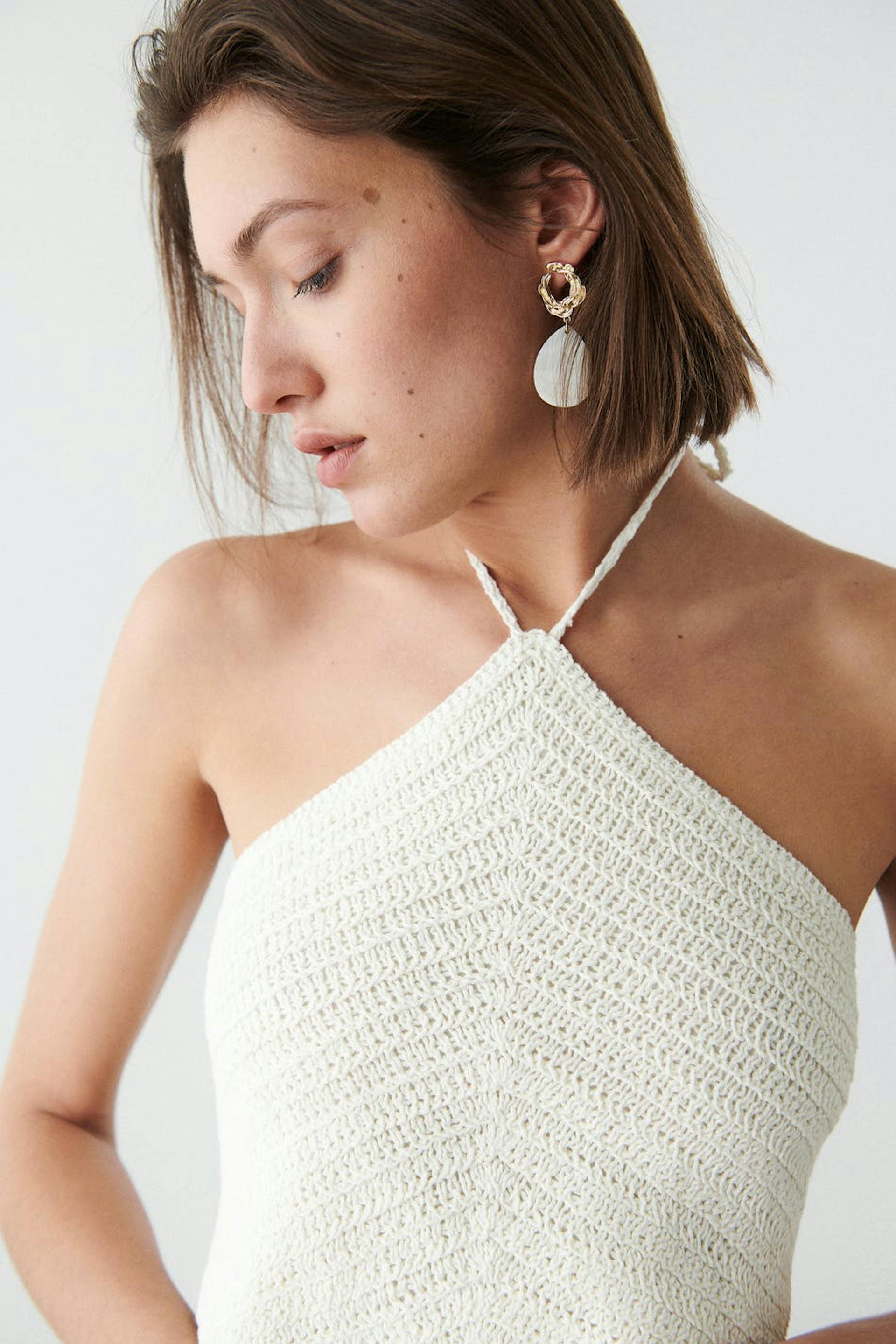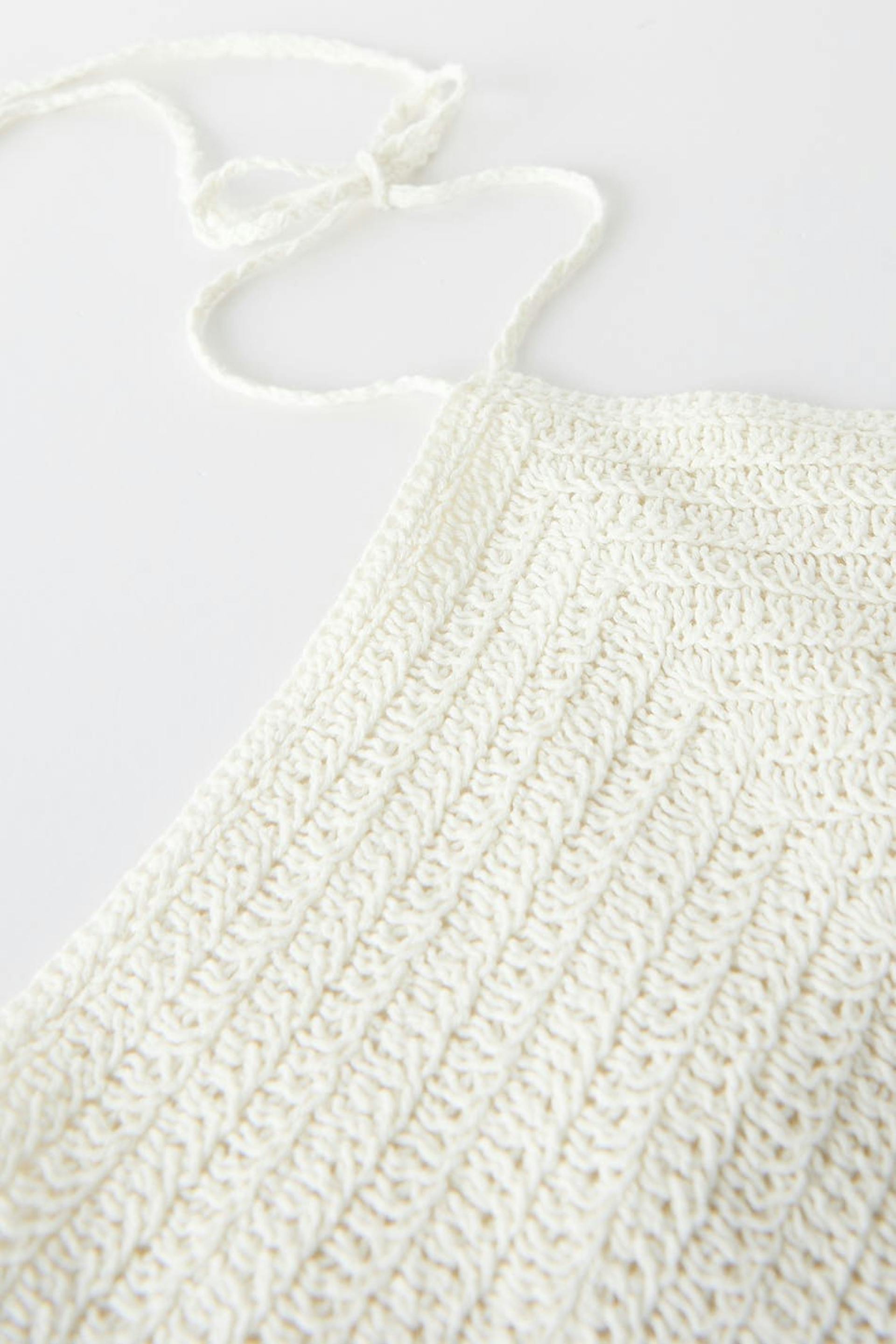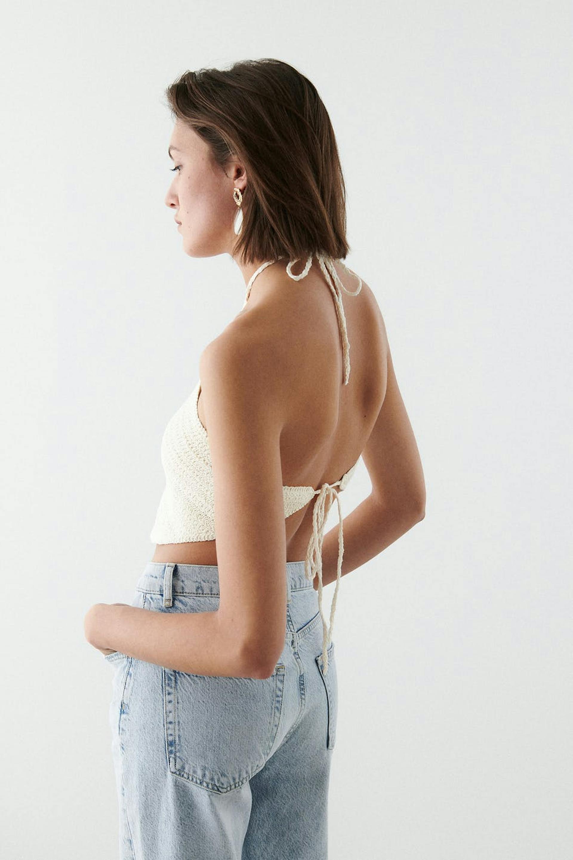 Crocheted top with open back. The top is perfect for the party, white and cropped. It has a pointy edge at the bottom and halterneck design with self-tie at neck and in the back.