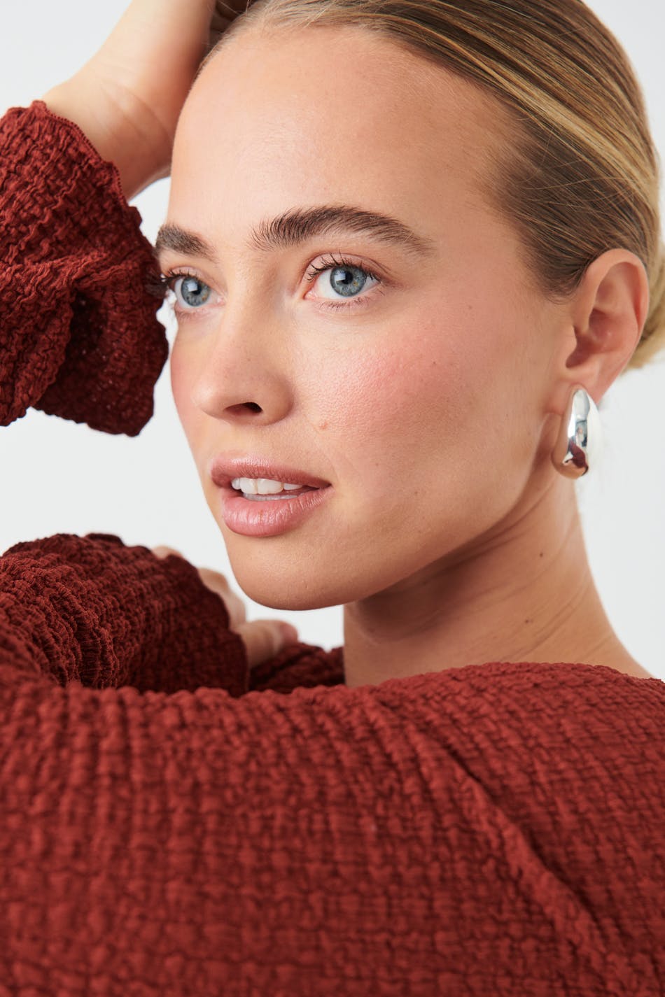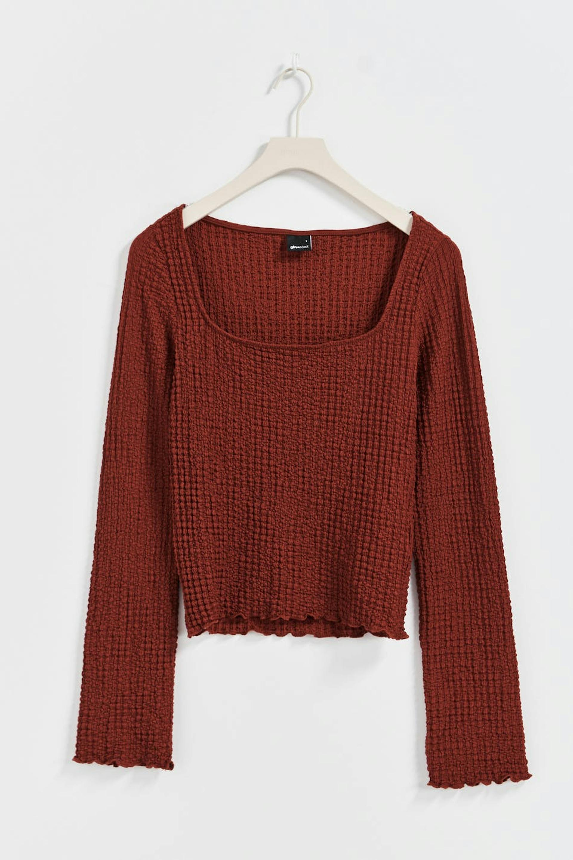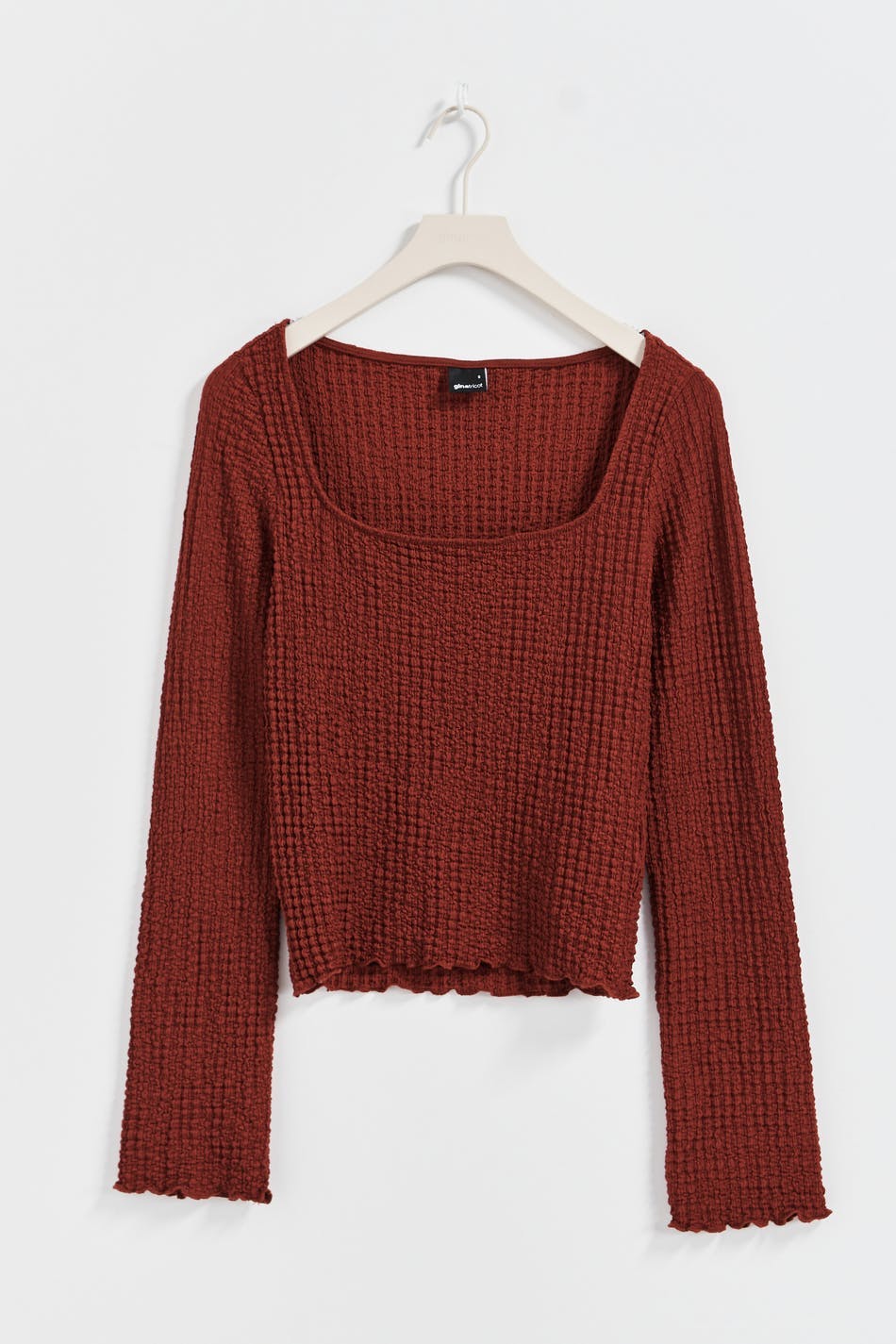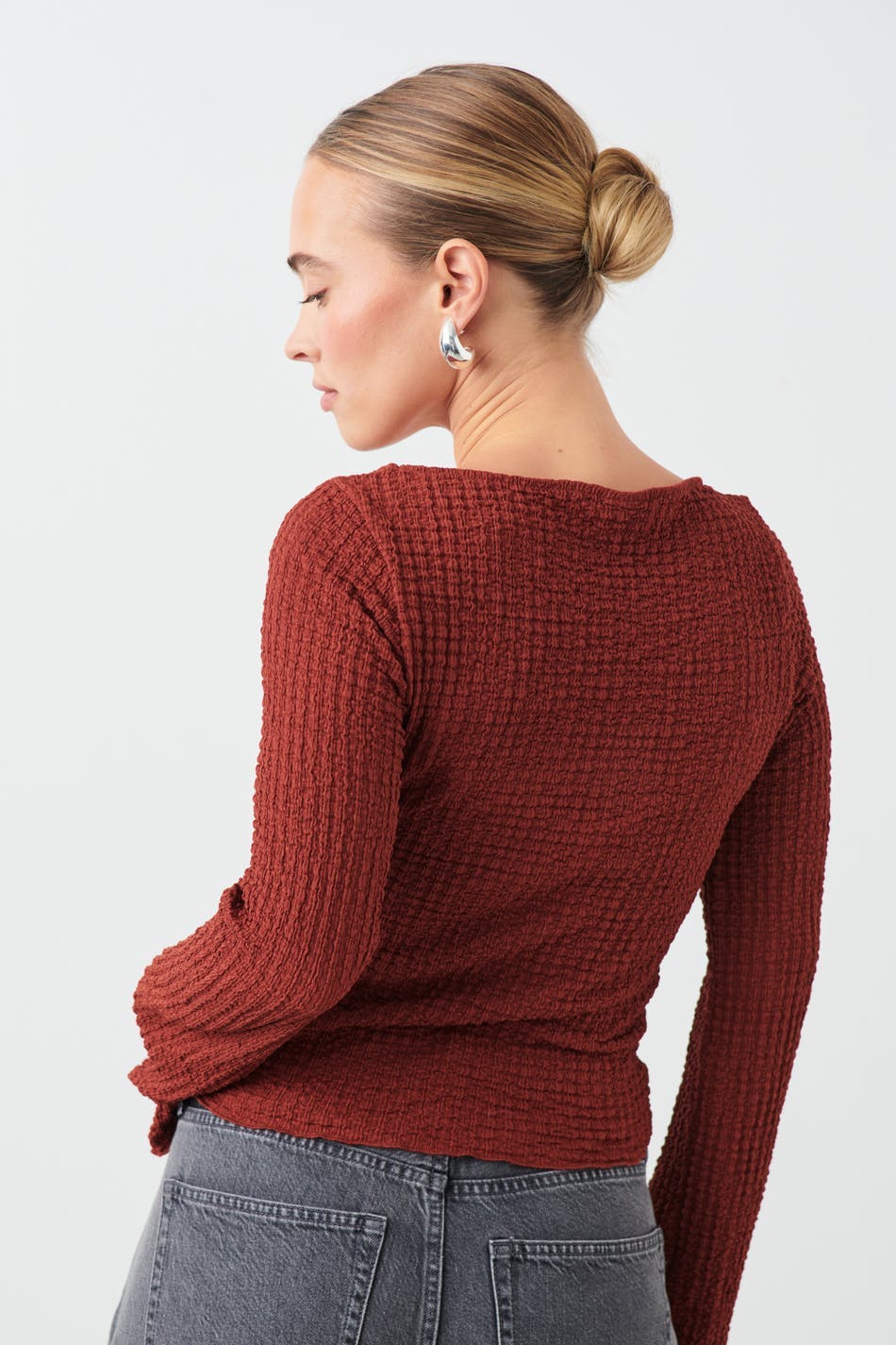 Long-sleeved top with wide, squared neckline. The top is brown and has stretchy quality with texture.