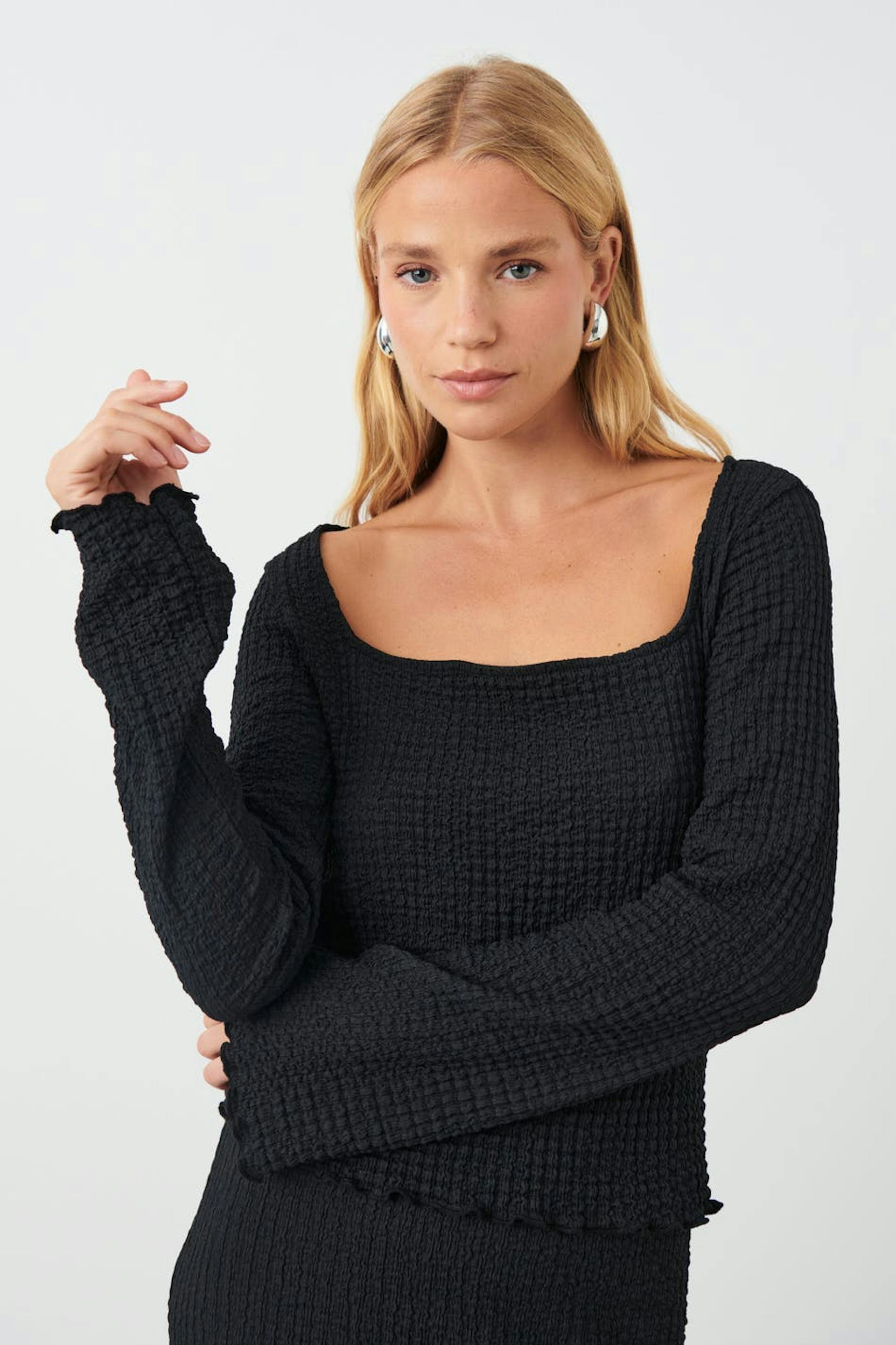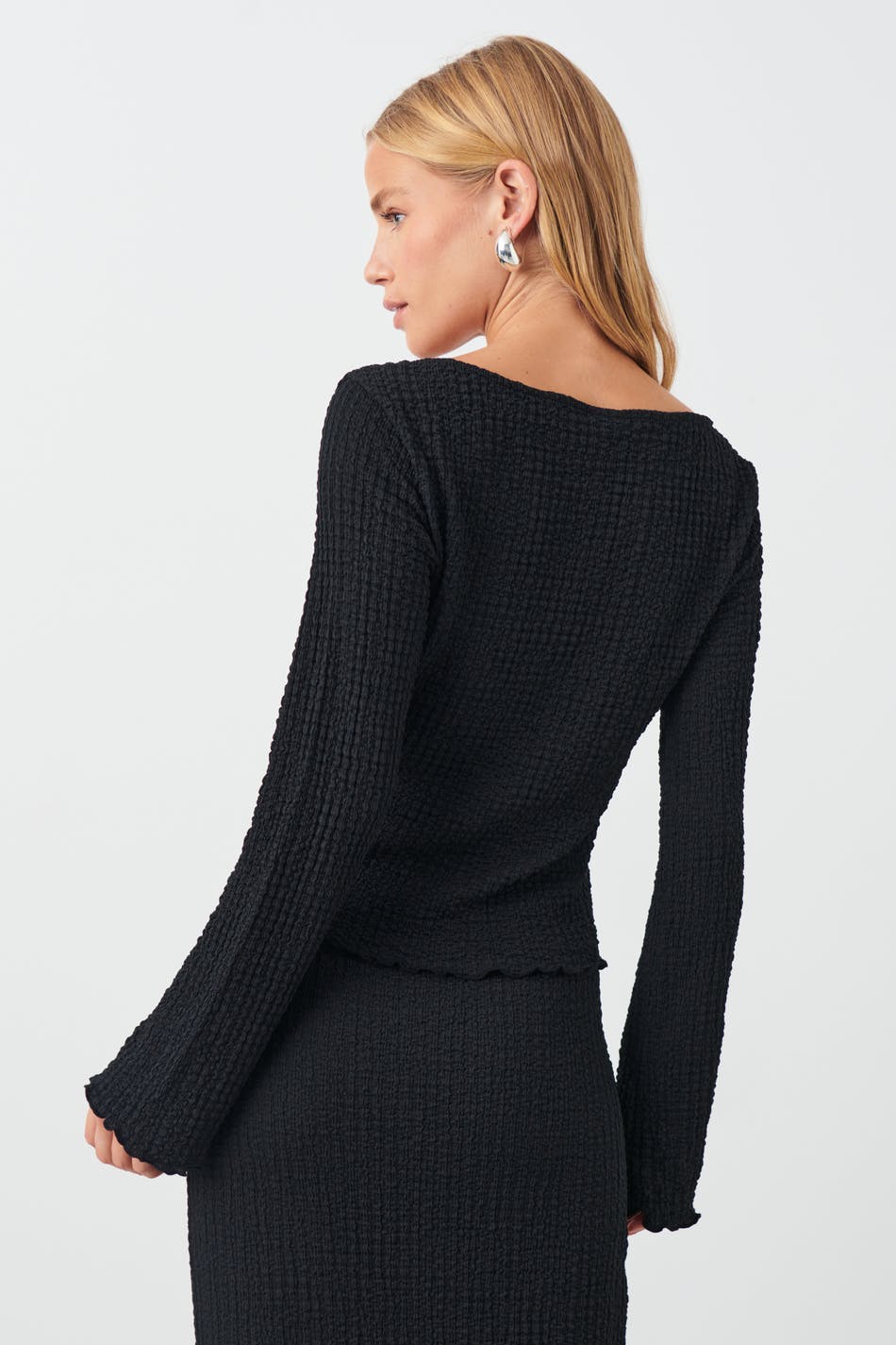 Long-sleeved top with wide, squared neckline. The top is black and has stretchy quality with texture.