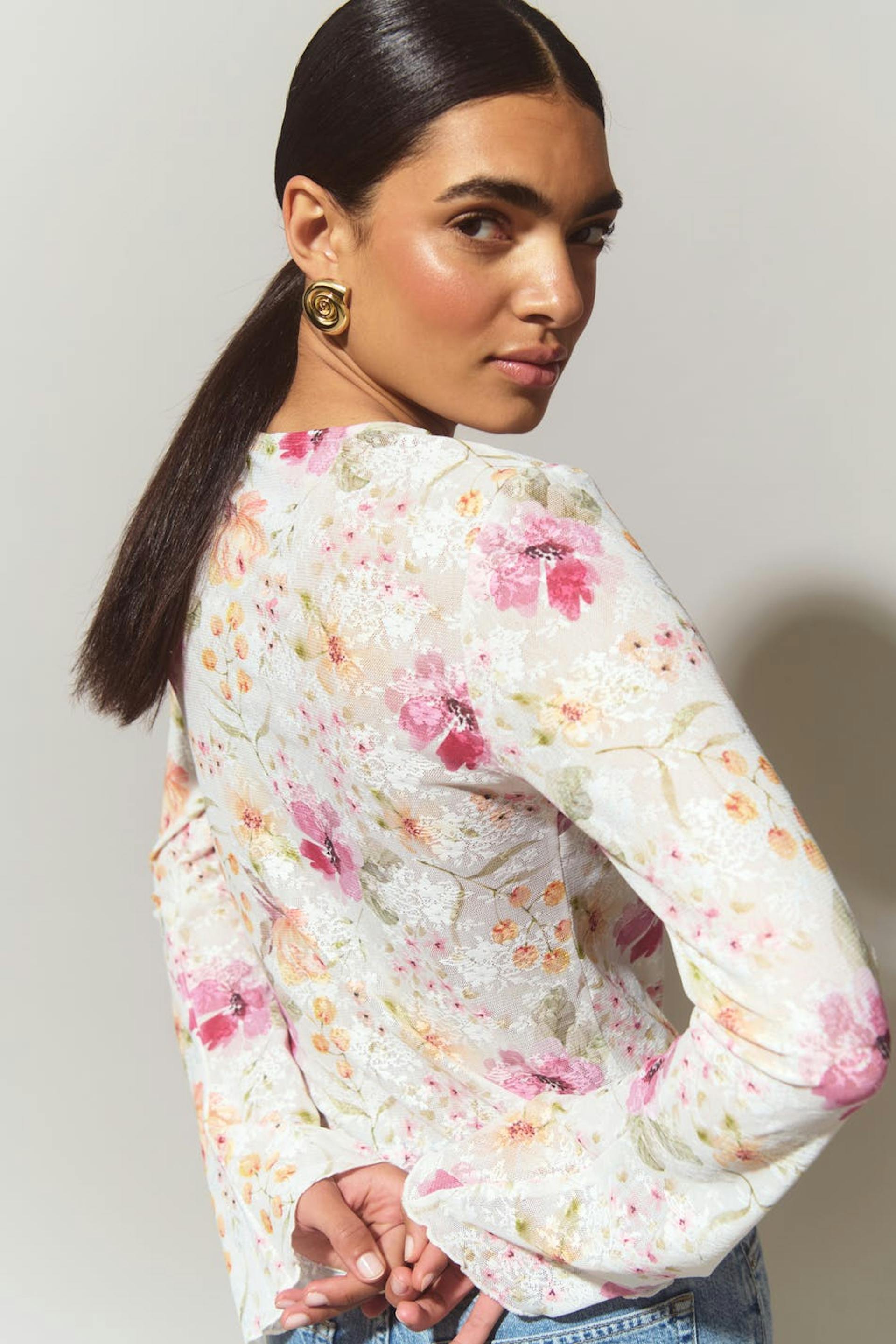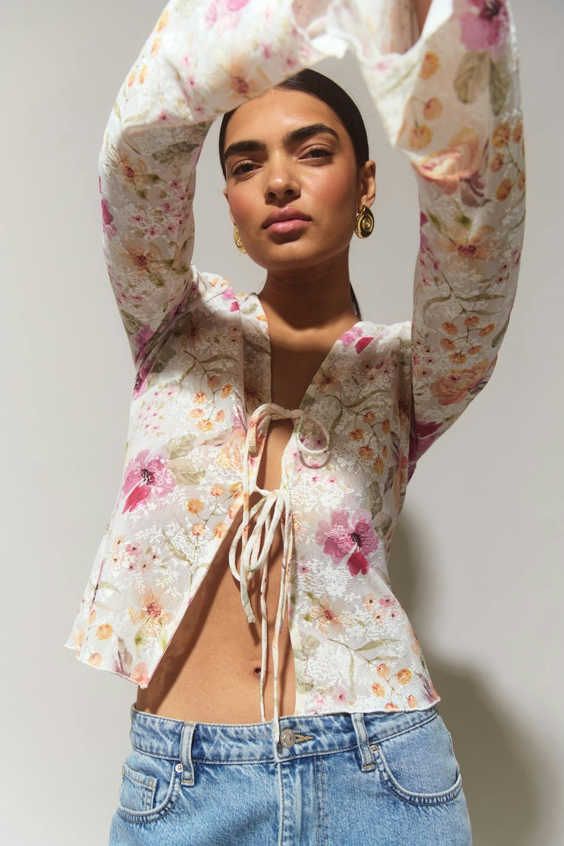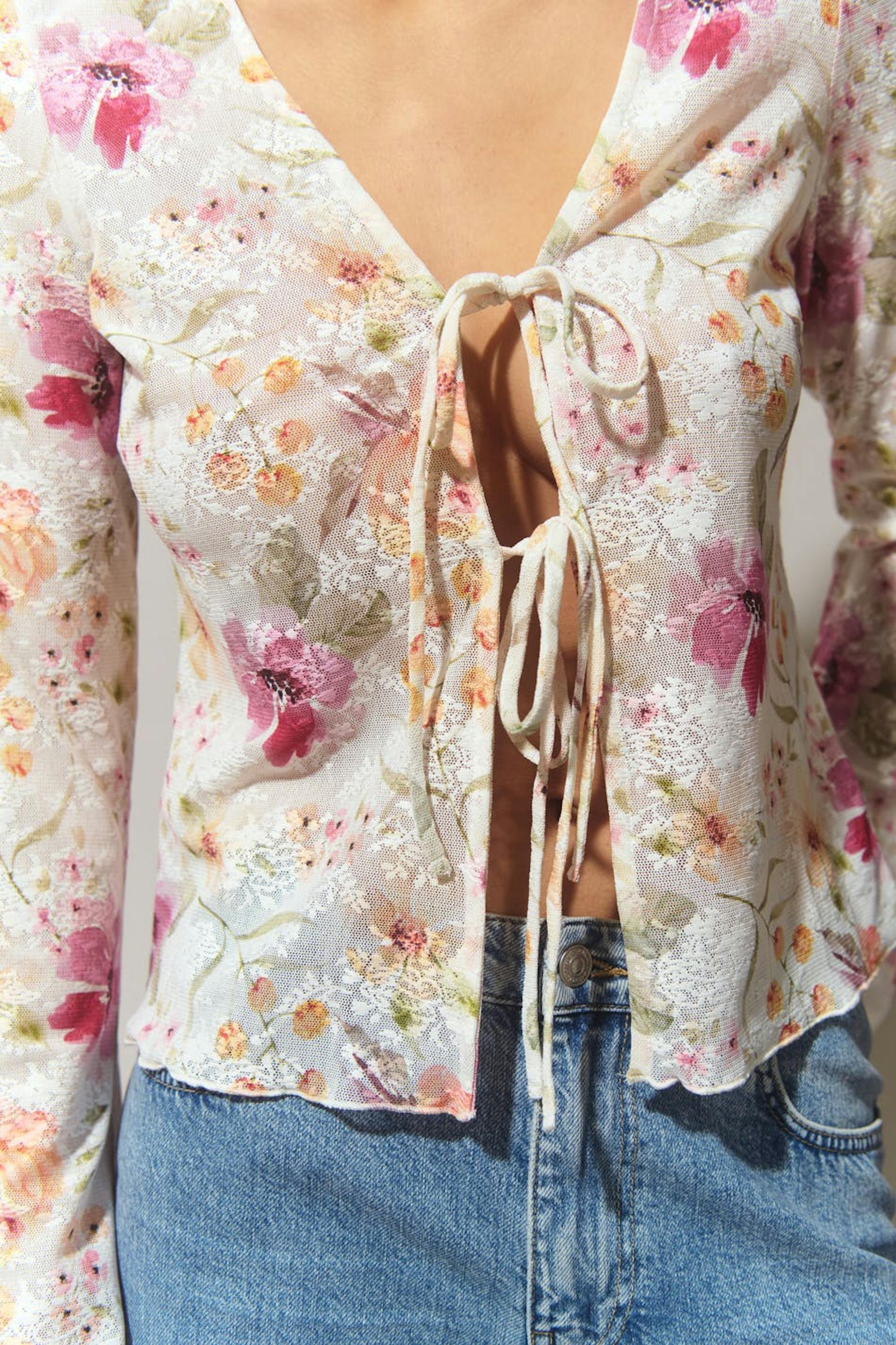 Floral tie top with v-neck. The top is pink and has long sleeve. It has string tie closure at the front.