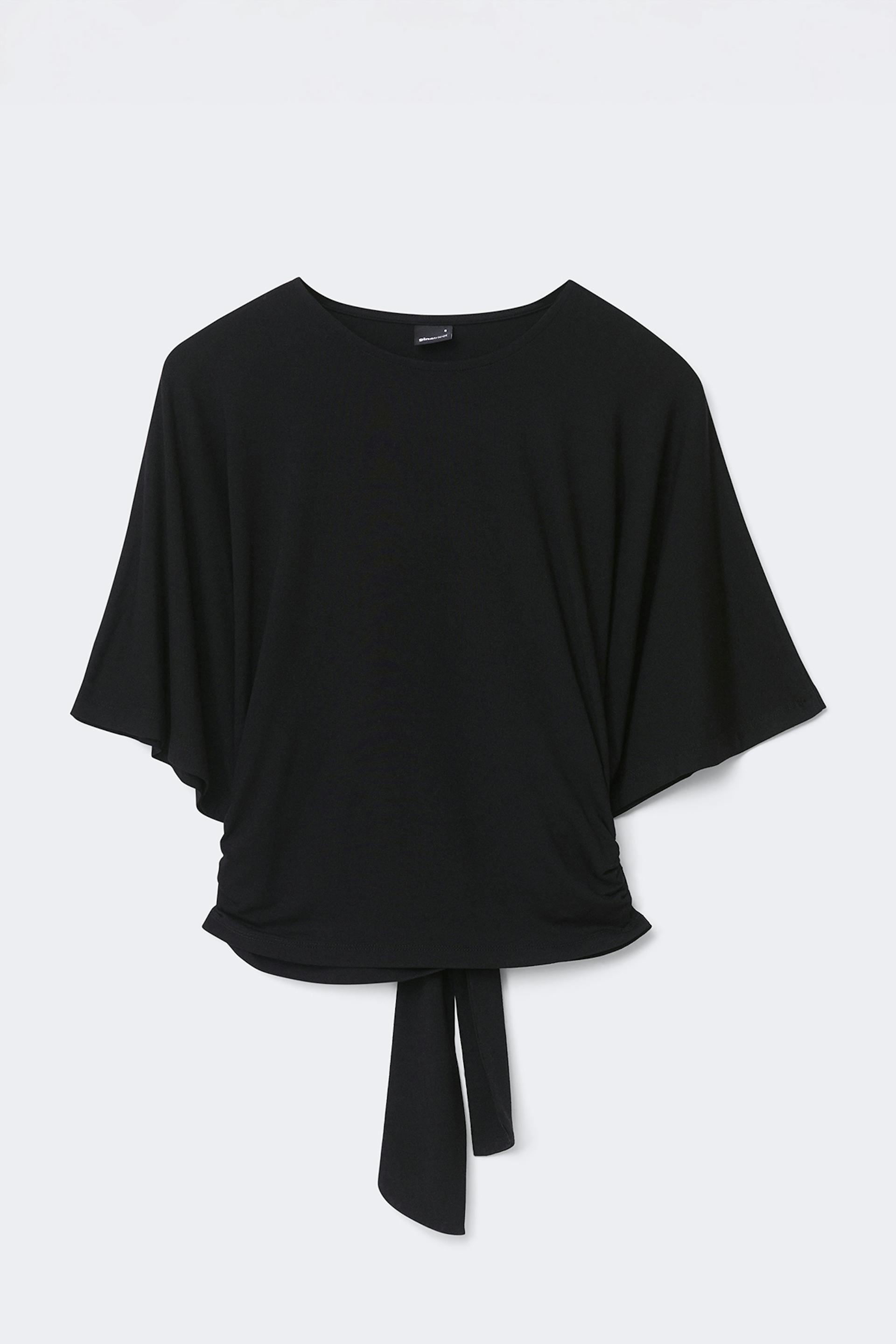 Top with self-tie in the back. The top is black and has wide, short sleeves. It has ruched details at the waist, round neckline, short length, soft material and normal fit.